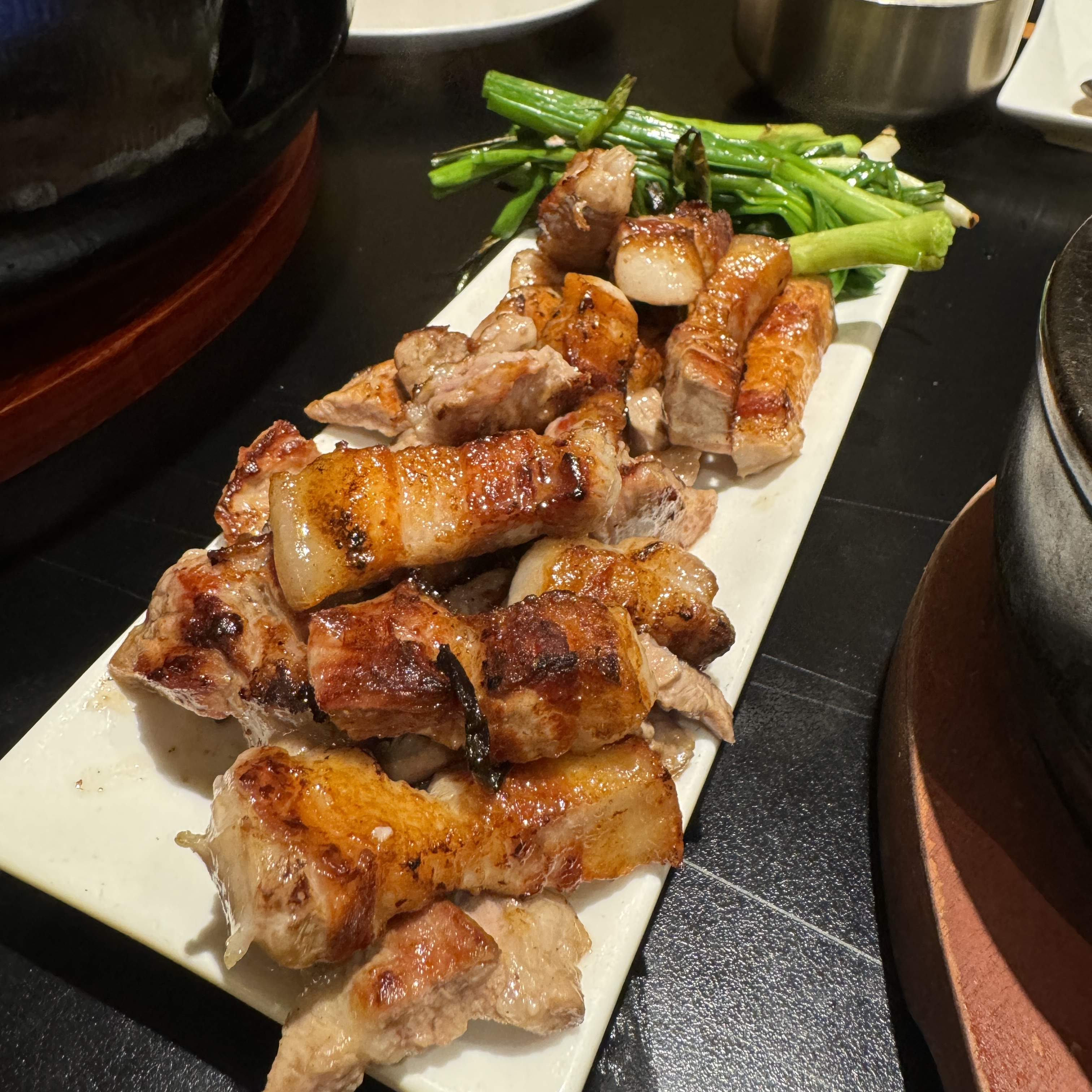 우리가 시킨 건 난축 흑돼지 세트(650g, 오겹살 200g, 목살 200g, 생갈비 250g + 쪽파 100g, 72,000원) 뭐 200g 1인분이라고 하면 3인분 정도니까 고기 먹으려면 이 정도는 먹어야지. 근데 생각보다 고기가 그리 맛있지는 않더라. 프리미엄이라고 하는데, 글쎄요. 오히려 나는 성수동의 냉동삼겹살집인 잠수교집 고기가 훨 맛있더라는. 그래도 배터지게 잘 먹긴 했다. 게다가 여기는 고기를 직원이 구워줘서 좋아. 그거 때문에 프리미엄인 듯.