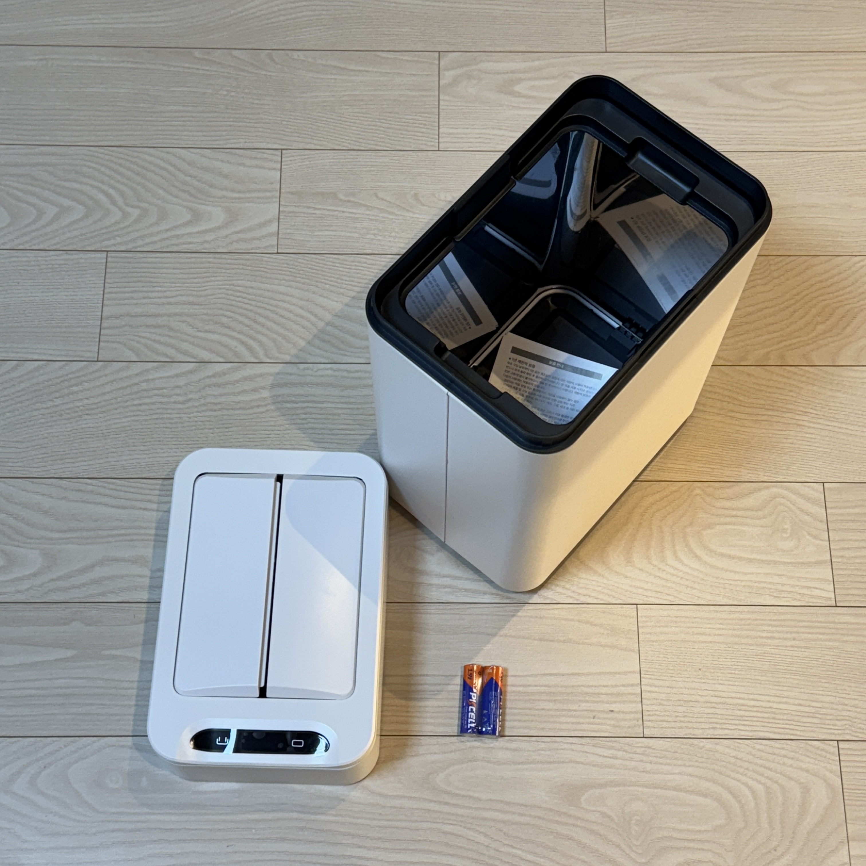 작동은 잘 된다. 날개형 덮개 위에 손 갖다 대는 게 아니라 검정색 센서 위에 손 갖다 대면 열림. AAA 건전지 2개로 얼마나 오래 갈까 싶은데 이용해봐야 알 듯.