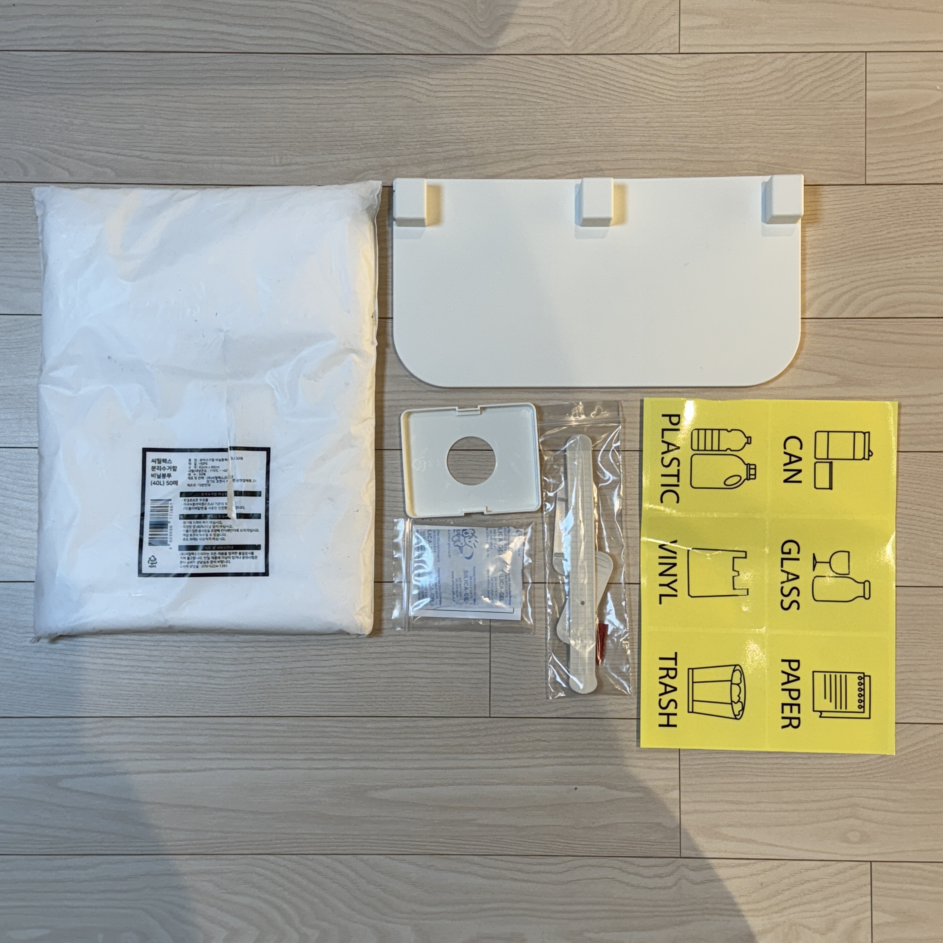 봉투 50매는 각 박스당 하나 들어 있다 보니 총 200매나 된다. 언제 다 쓰나 싶다. 그리고 받침대, 제습전용캡, 제습제, 결착 클립, 스티커가 들어 있다. 다 남는다. 받침대은 아랫쪽에 둘 분리수거함에만 사용하고, 제습제나 제습전용캡도 제습해야할 거에만 달 거고, 결착 클립은 아래 위 2개 연결할 때 3개 쓰고, 스티커는 하나만 다 사용하면 되니까. 넉넉한 편.