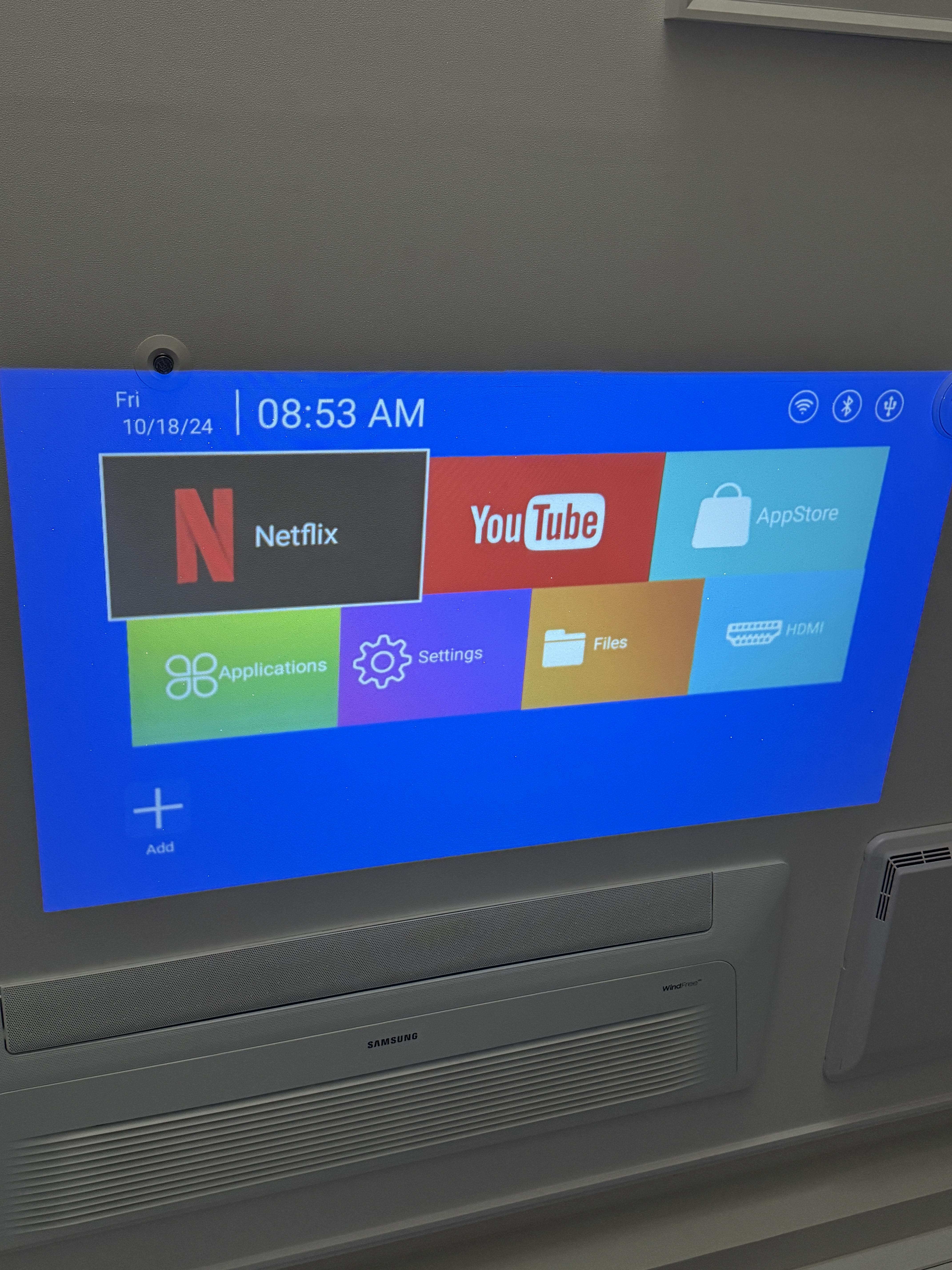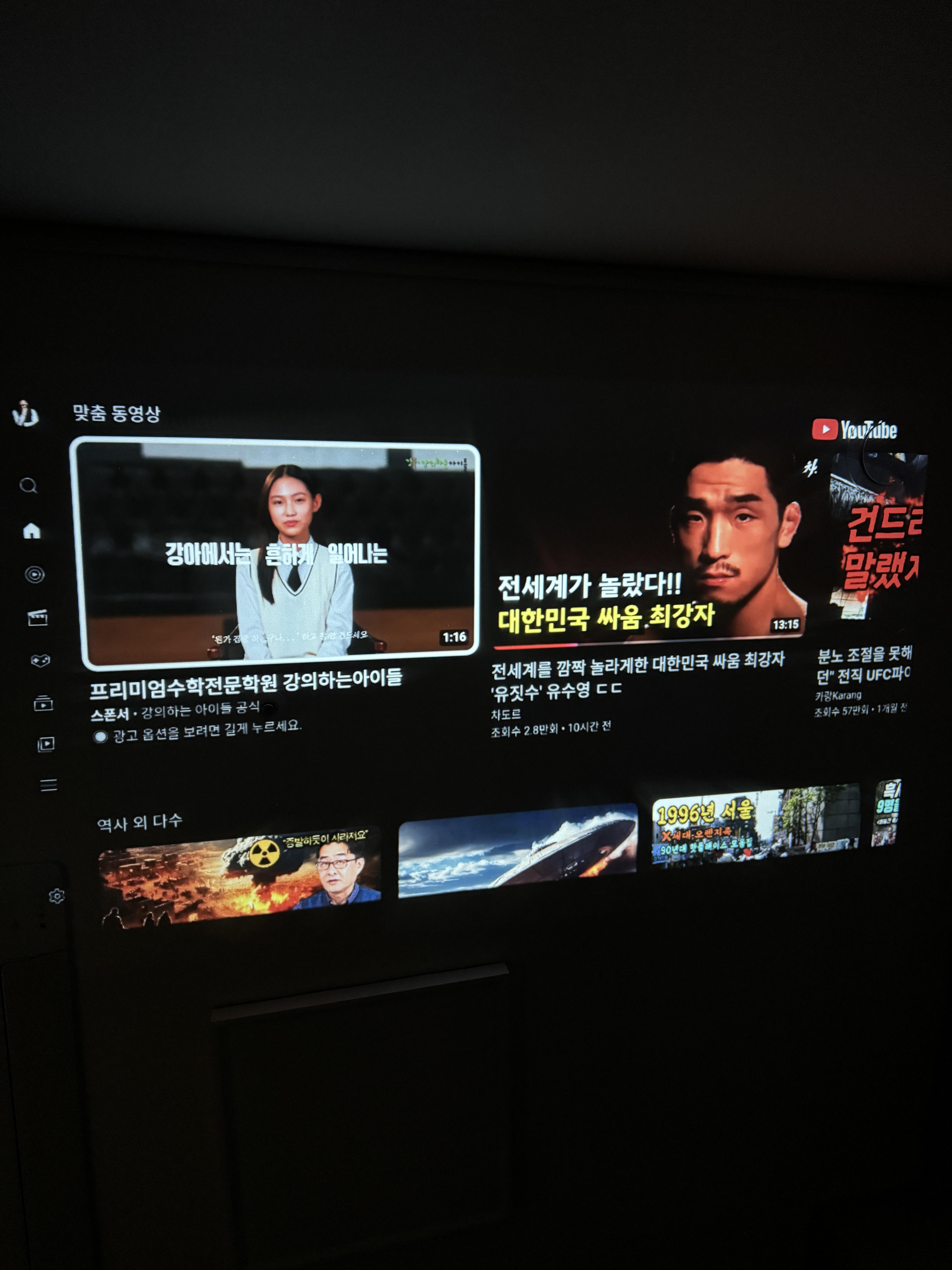 거실에서 화면 테스트하다가 침대 머리 맡에 두고 천장에 쏴서 유투브 보다가 잔다는. 핸드폰 들고 보다가 잠들곤 했는데, 이젠 그냥 천장에 프로젝터 쏴서 큰 화면으로 보다가 자니 편하네.