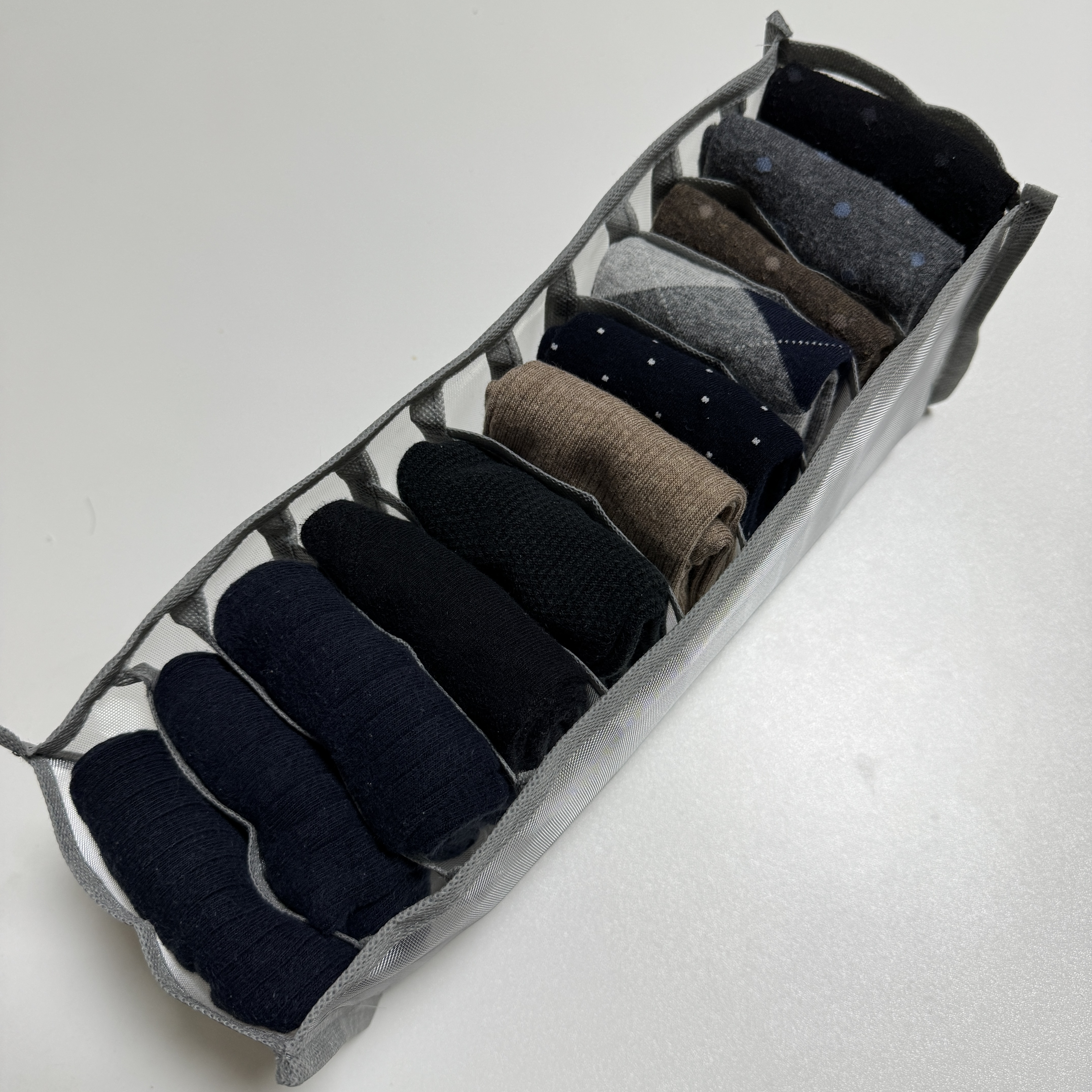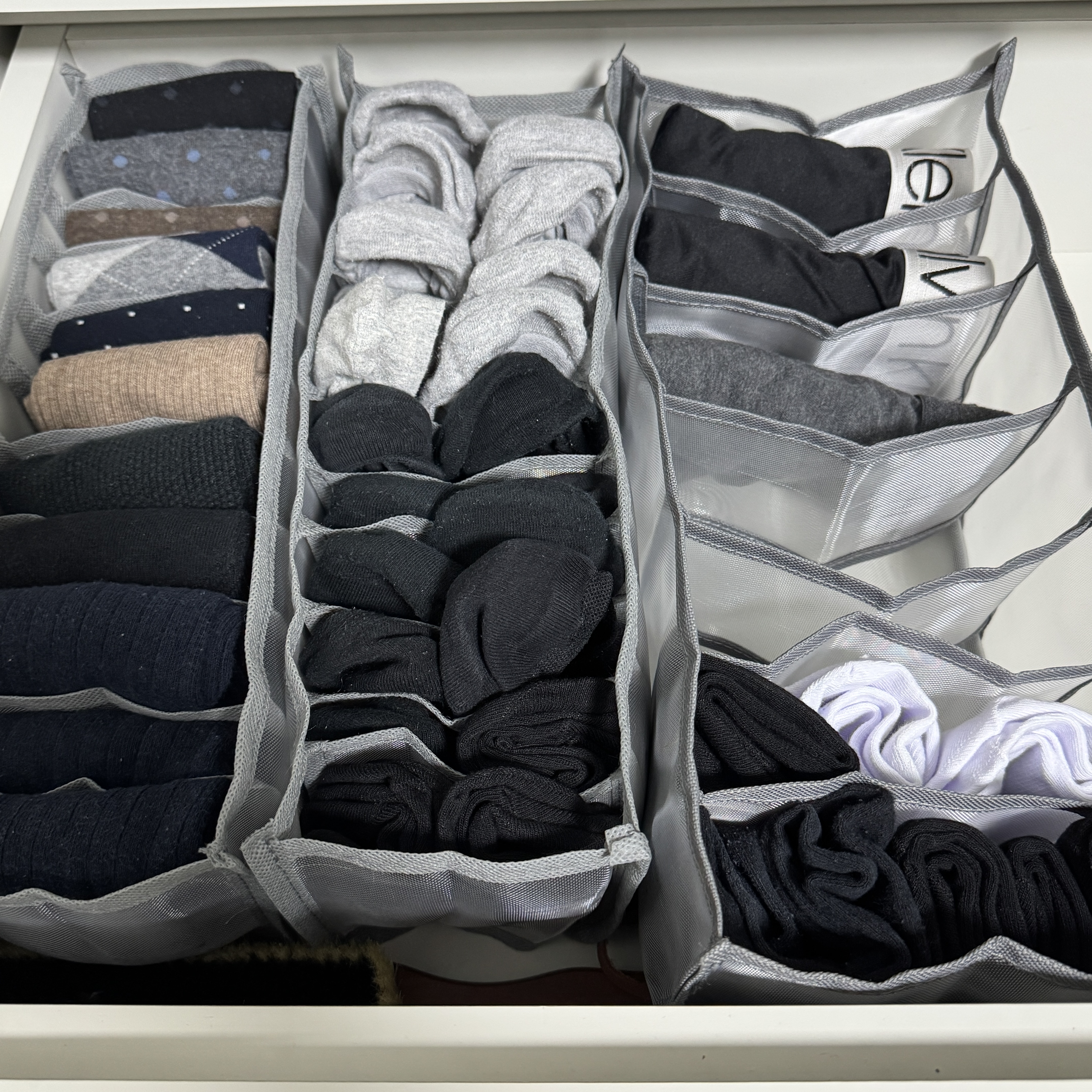 색상은 화이트, 그레이, 블랙이 있는데, 나는 그레이로 선택. 가로 12cm, 세로 32cm, 높이 12cm. 칸은 11칸이고, 각 칸의 폭은 2.5cm다. 속옷 정리함은 가로 17cm, 세로 36cm, 높이 12cm. 칸은 7칸이고 각 칸의 폭은 5cm. 재질이 그래서 그렇긴 한데, 뭐 그래도 없는 거 보단 낫다만, 아무래도 나중에는 좀 다른 걸로 사지 않을까 하는 생각이...