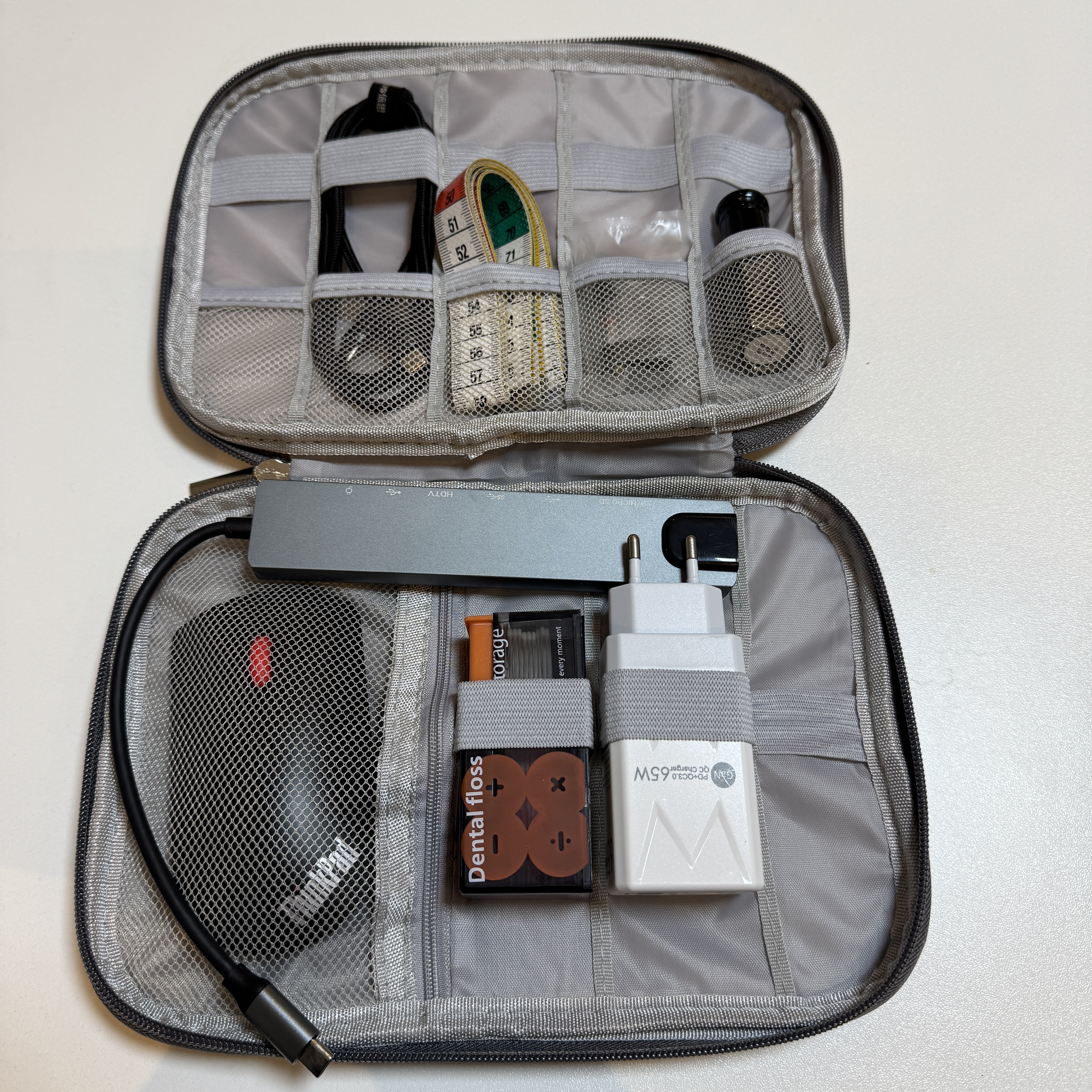 이렇게. 마우스, 고속 충전기(65W), 고속 충전 케이블(100W), 멀티 허브, 줄자(채촌위해), 전담 카트리지, 향수(다니엘 트루스) 이렇게 넣고 지퍼 닫아두면 깔끔하게 정리된다. 맘에 듬.