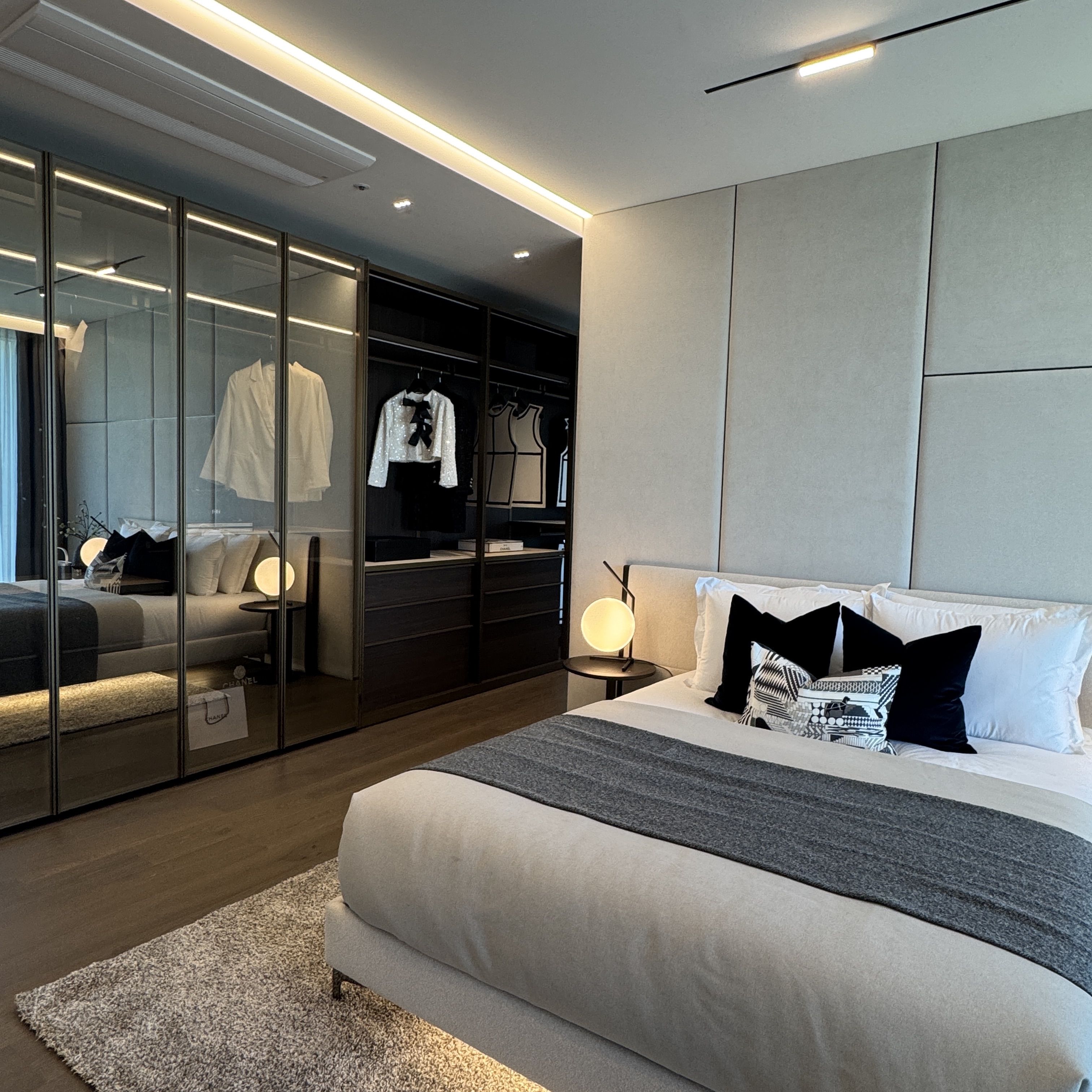 타입이 여러 개던데, 몇 가지 타입 중에서 개인적으로 이게 제일 맘에 들더라. 전용면적이 34평 정도? 여기는 3~9층은 공동주택이고, 10~18층까지는 오피스텔이다. 내가 젤 맘에 들었던 건 14층. 들어가면 전면이 다 유리라 탁 트인 시야가 눈에 들어온다. 건너편 건물 중에 높은 건물이 없다 보니. 게다가 유리창으로 내려다보면 도산대로가 보이고. 룸은 양쪽 끝에 2개가 있는데, 드레스장과 욕실이 각각 있다. 그래서 두 명이 쓴다면 둘 다 프라이빗하게 쓸 수 있고, 중간에 주방과 거실은 공용으로 쓰기 좋을 듯. 확실히 비싼 거라 마감이며, 세세한 부분 신경 쓴 티가 나긴 하더라. 좋대.