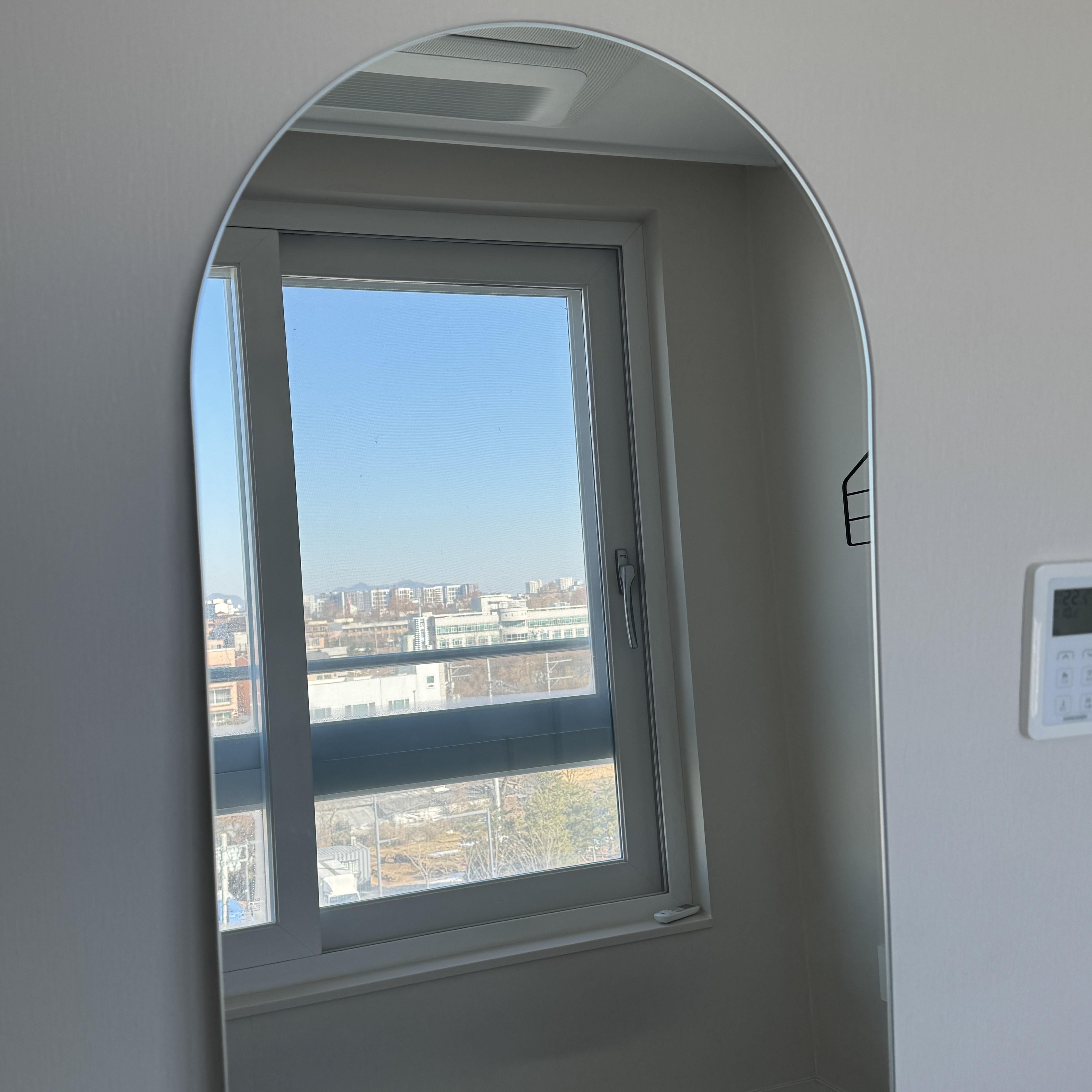 대부분 전신거울 프레임이 있다. 즉 거울 주변에 테두리가 있단 얘기. 이건 테두리가 없는 전신거울이다. 그래서 깔끔해보이고. 게다가 상단부가 아치형이라 맘에 든다.