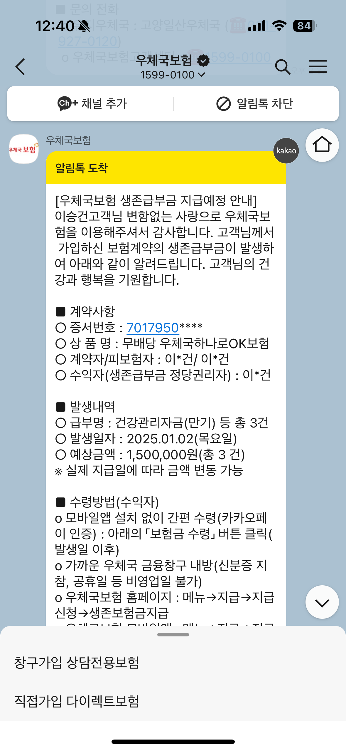 생존급부금을 준다는 카톡. 그것도 150만원이나. 그래? 확인해봐야지 했는데, 이 카톡을 받았을 때는 발생일자인 25.01.02 전이라 잊고 있다가 생각나서 확인해봤다.