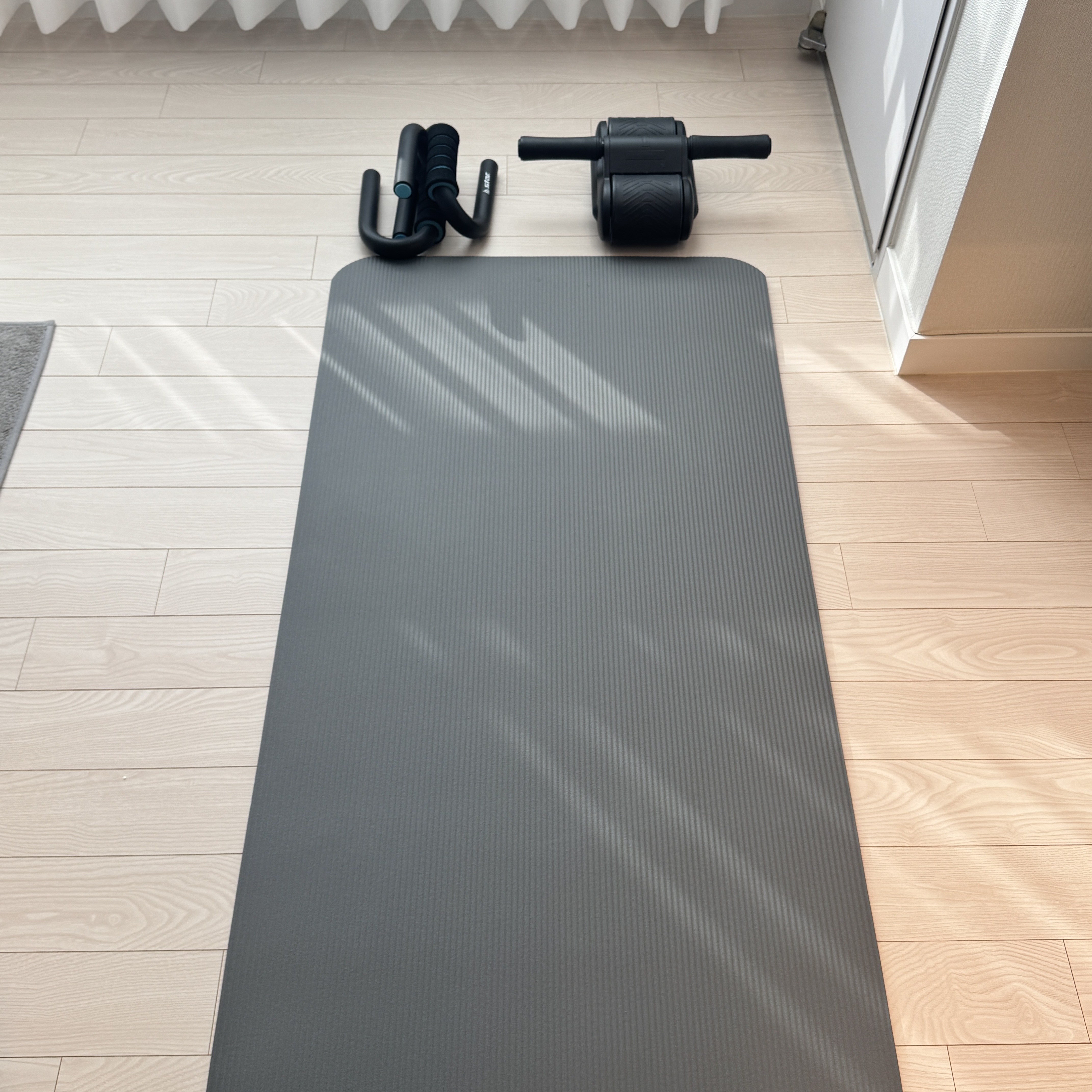 너비는 610mm, 길이는 1830mm. 적당하다. 거실에 놓고 쓰려고 하다 보니 거울이 없네. 그래서 옷방에 있는 전신 거울 갖고 와서 매트 앞에 두고 거울 보면서 운동하려고 한다. 맨몸운동 루틴 만들되, 스트레칭 10분, 맨몸운동 15분 도합 30분 안 넘도록 해서 꾸준히 할 수 있는 루틴을 짜봐야겠다.