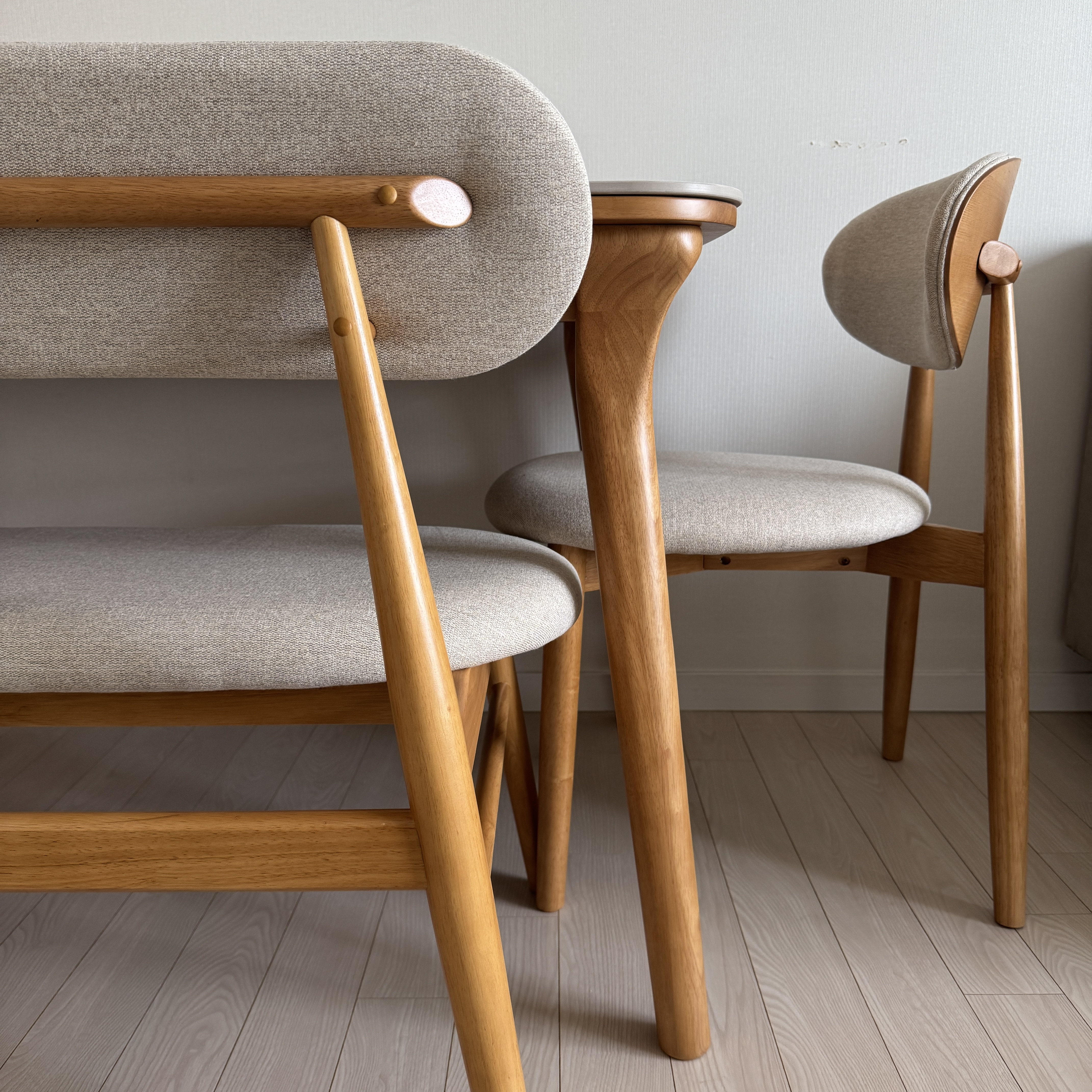 의자는 1인용 원목 의자 2개랑, 2인용 원목 등받이 의자 1개로 구매했고. 오트밀 색상의 원단과 내츄럴 색상의 원목 잘 어울리는 듯.