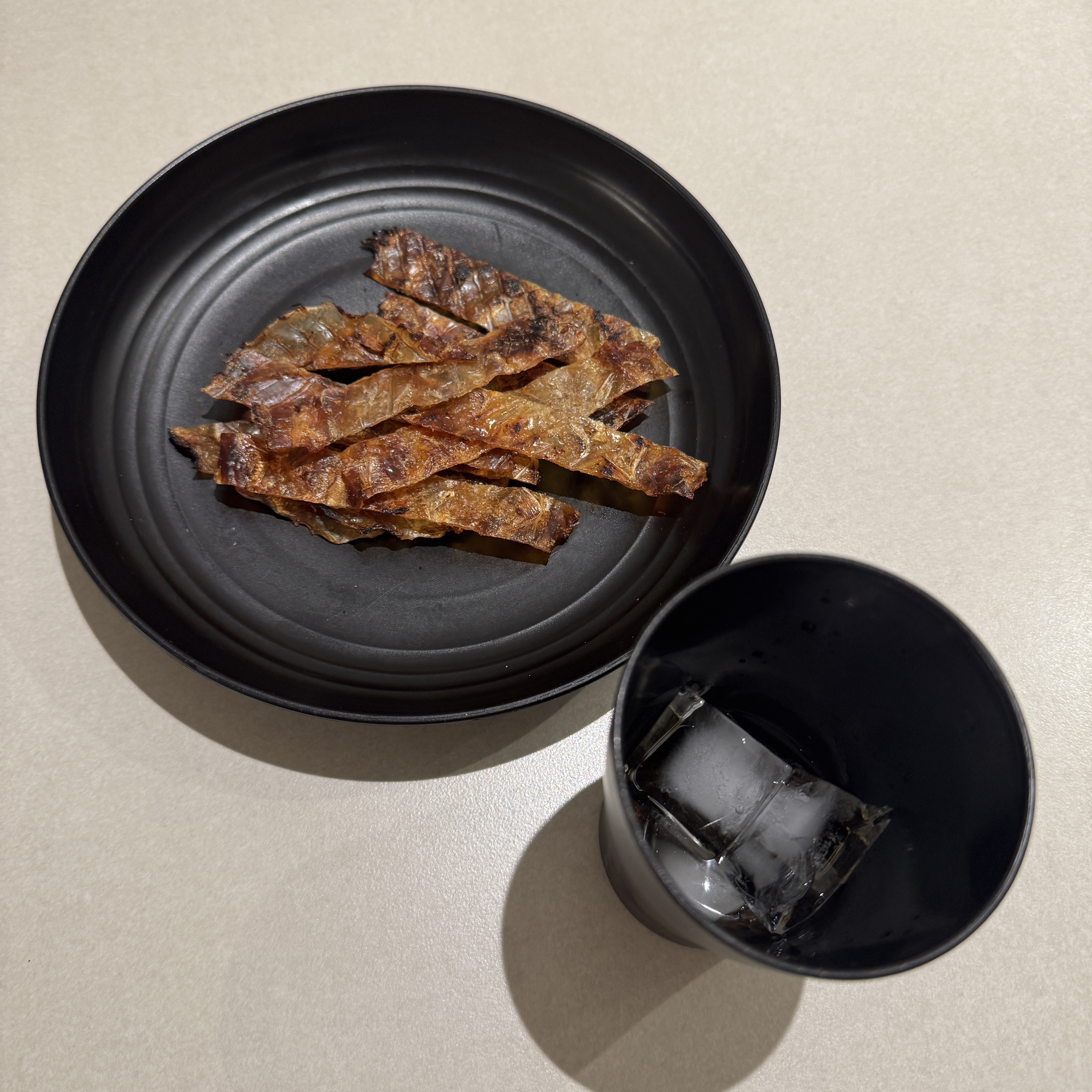 주말이라 생각나서 쥐포를 안주 삼아(뭔가 안 어울리는 듯) 언더락으로 한 잔 마시면서 노트북으로 이것 저것 정리했네. 유리잔은 사뒀지만 테무에서 사서 아직 배송중이라. 여튼 저거 다 마시고 나면 담번에는 좀 좋다고 하는 술을 하나 사봐야겠다. 다 마시면 또 다른 술 사고. 아마 1년에 한 병 살까 싶다.