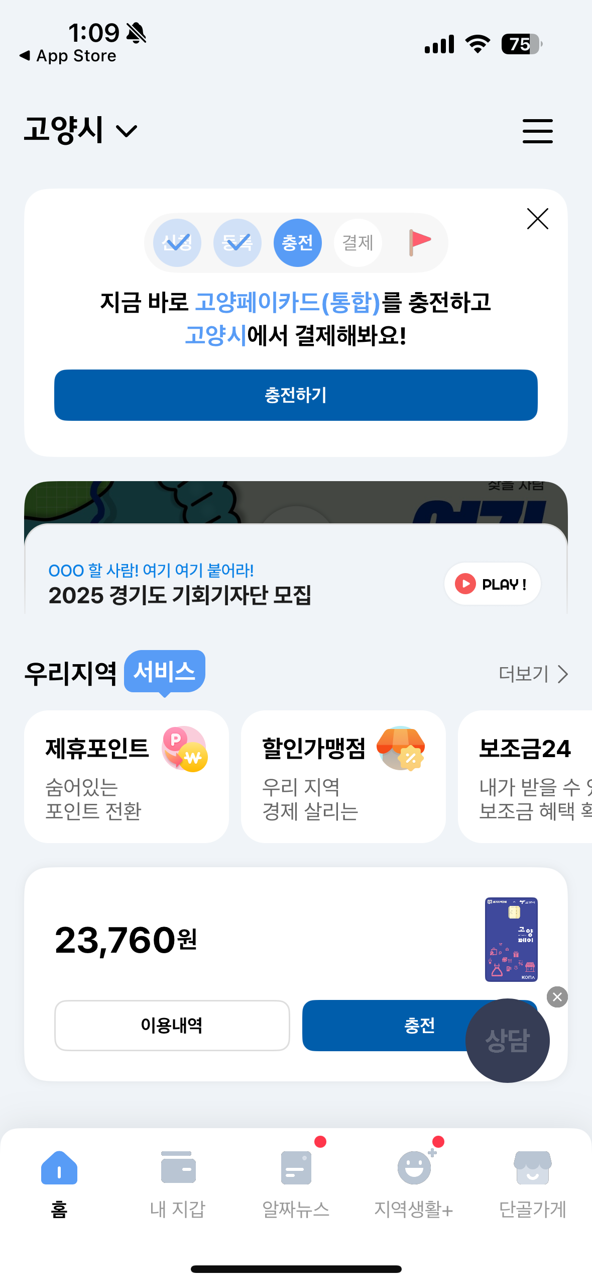 고양페이에는 23,760원 남아 있네? 몰랐다. ㅎ 카드 어딨는지도 모르겠는데. 확인해보니까 성남, 시흥, 김포에서는 모바일로도 결제 가능한데, 다른 데는 안 되네. 그래서 분실 신고하고 카드 재발급 신청했다. 그리고 파주페이 카드는 신규로 신청했고.