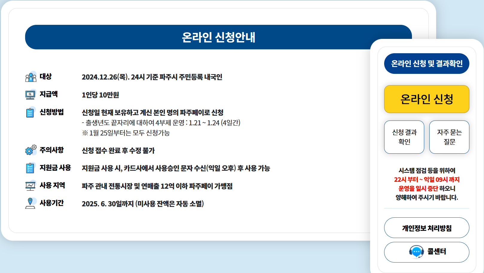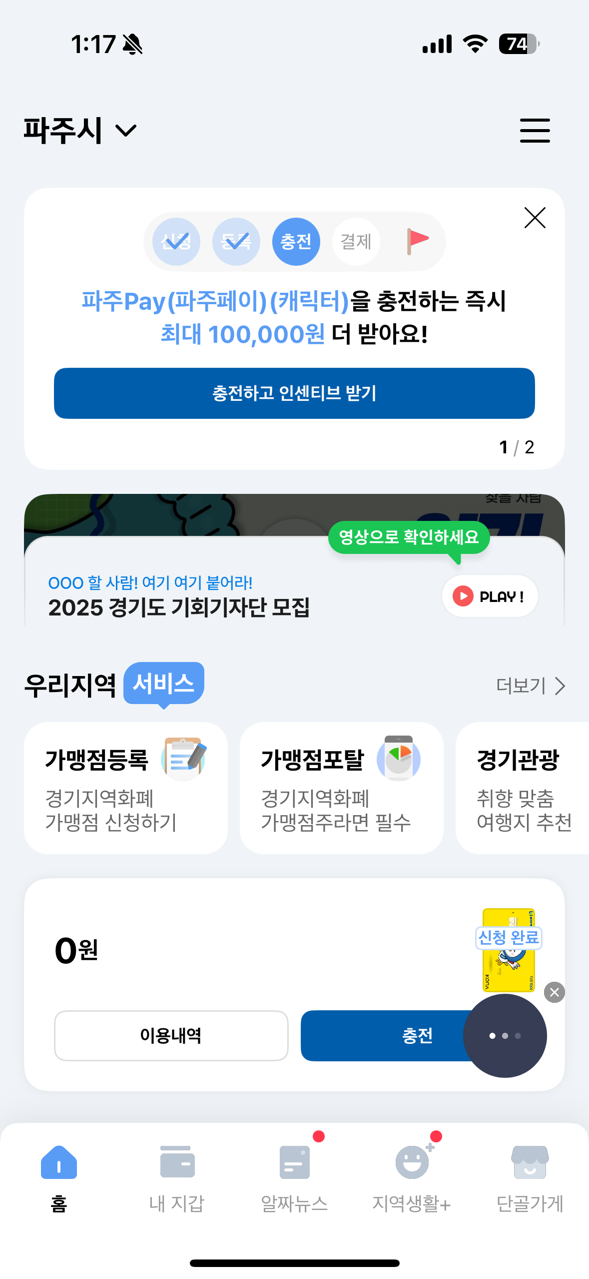 10만원은 통장에 현금으로 입금해주는 게 아니라 경기지역화폐인 파주페이로 충전해주는 방식이다. 그래서 파주페이 없으면 신청부터 해야 한다. 파주페이 신청하면 신청한 주소로 오는 실물 카드가 없어도 경기지역화폐 앱에서 카드 번호 나오니까 생활안정지원금 신청하는 데에는 무리가 없다.