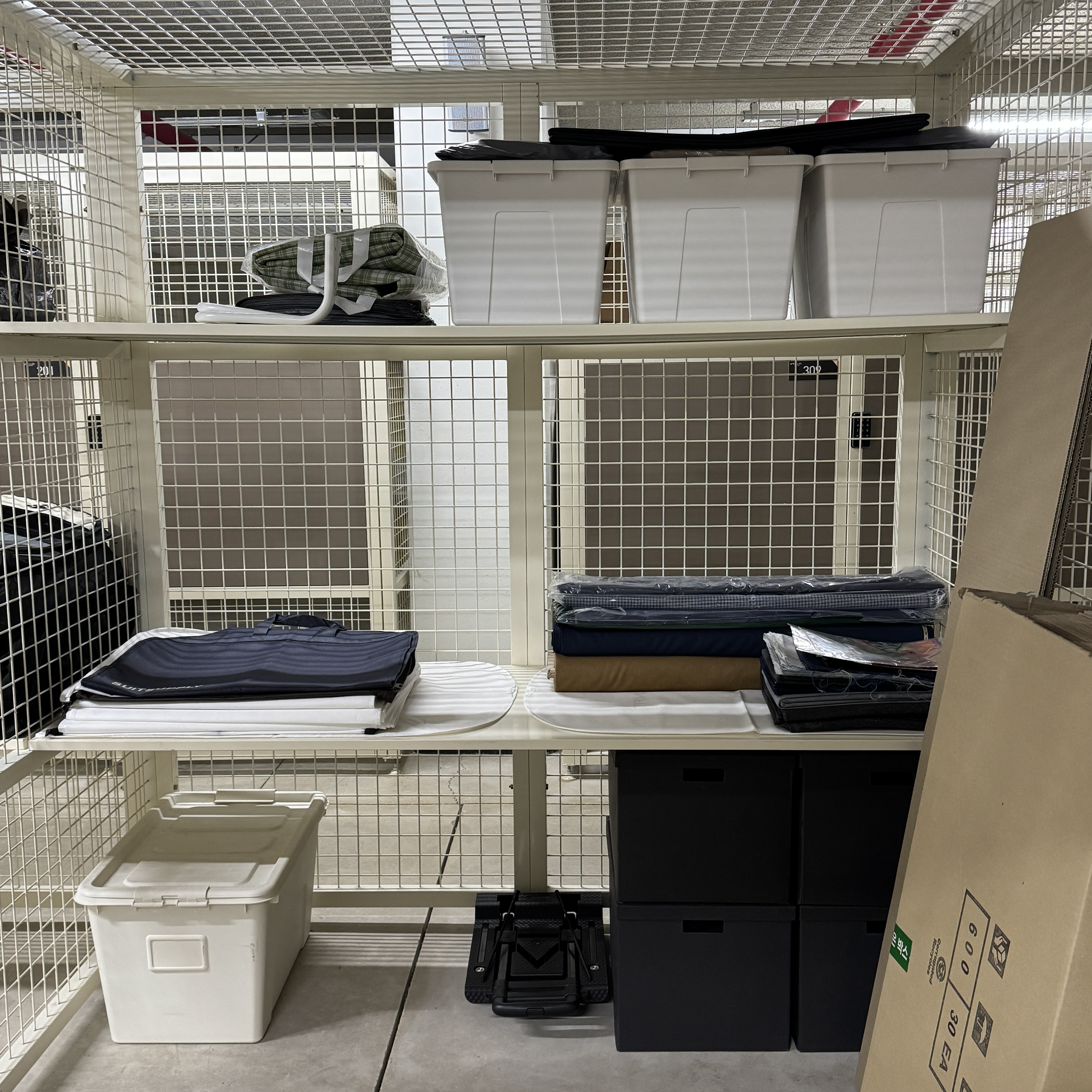 위치는 지하 6층. 요즈음에는 이런 창고 임대해주는 것만으로도 비용 받던데, 이런 걸 기본적으로 제공해주니까 진짜 편하긴 하더라. 어떤 사람은 자동차 범퍼나 타이어 보관해두고 있고, 대부분은 계절이 지난 제품들 보관하고 있고.