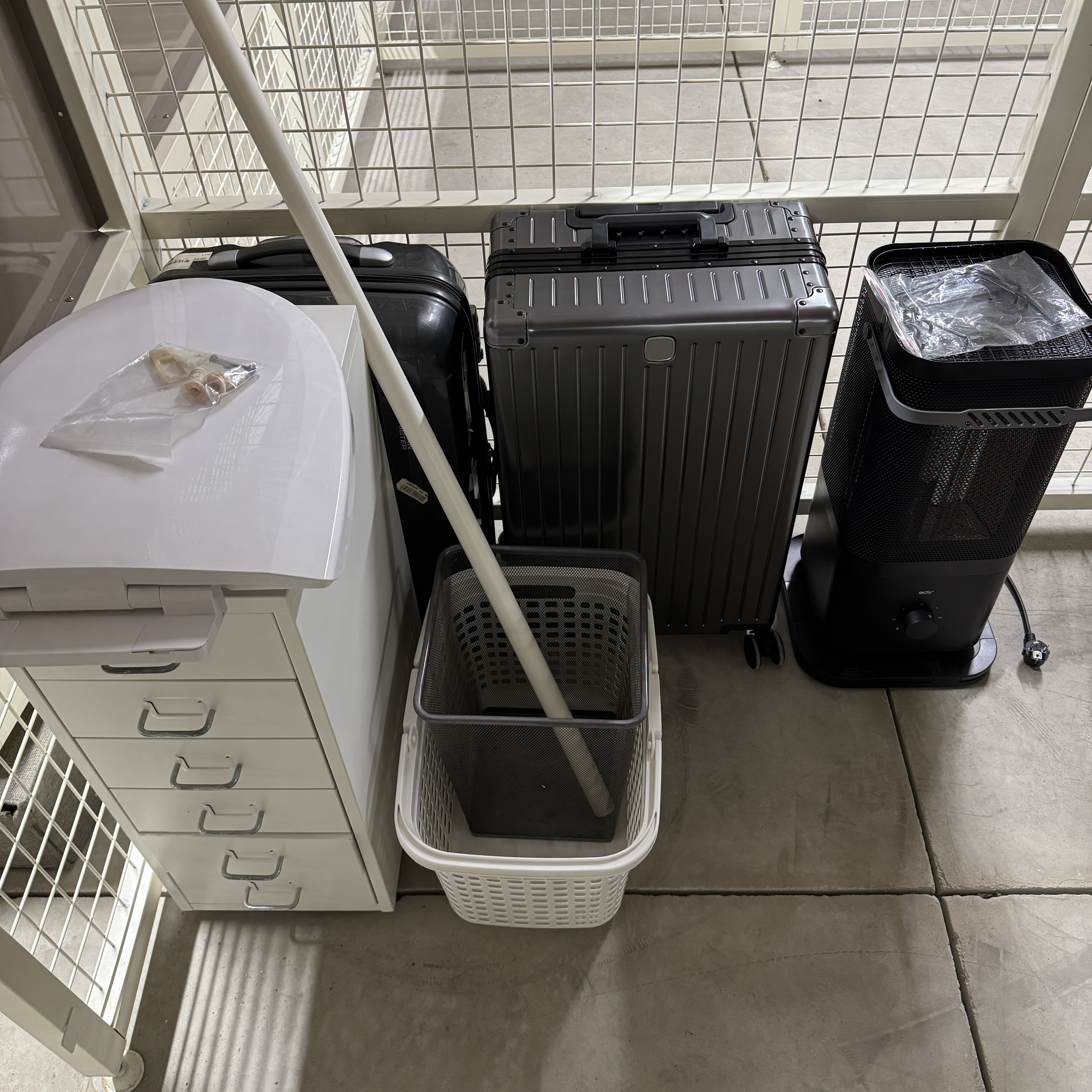 여행용 캐리어, 안 쓰는 카본 전기 히터(이거 당근에 내놔서 팔아야겠다. 필요없어. 쓸 일이 없으니.), 안 쓰는 이케아 서랍장(이것도 팔아야겠다.), 비데 설치하려고 뜯어낸 양변기 의자 이런 것들 놔뒀고.