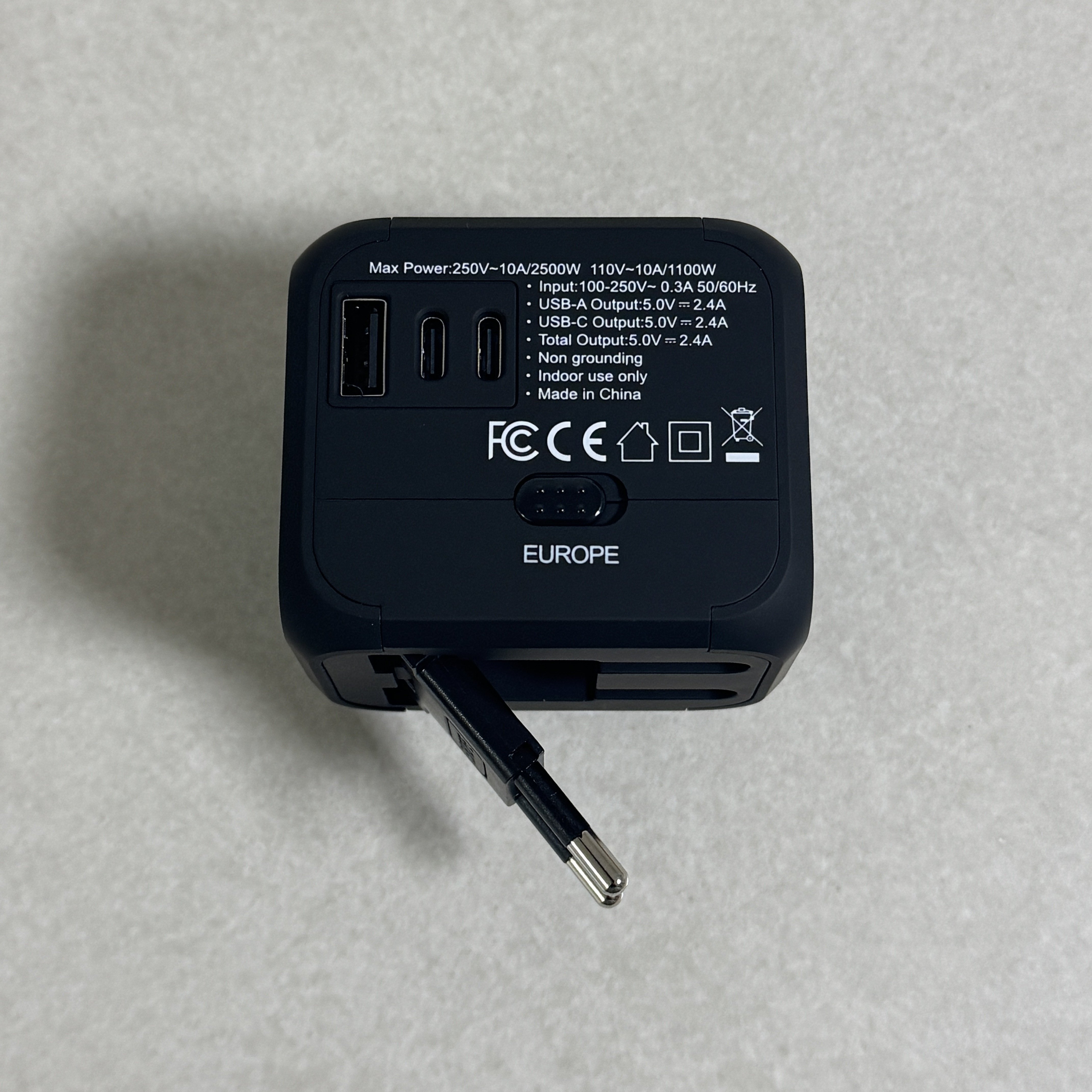 UK, USA, EU 플러그 지원한다. 크기는 작다. 내가 생각했던 것보다. 항상 테무에서 사면 이런 경우 많아 별 감흥은 없지만. 그래도 이런 건 작은 게 좋지. 그리고 USB-A 1포트, USB-C 2포트 지원한다. 2500W까지 지원.