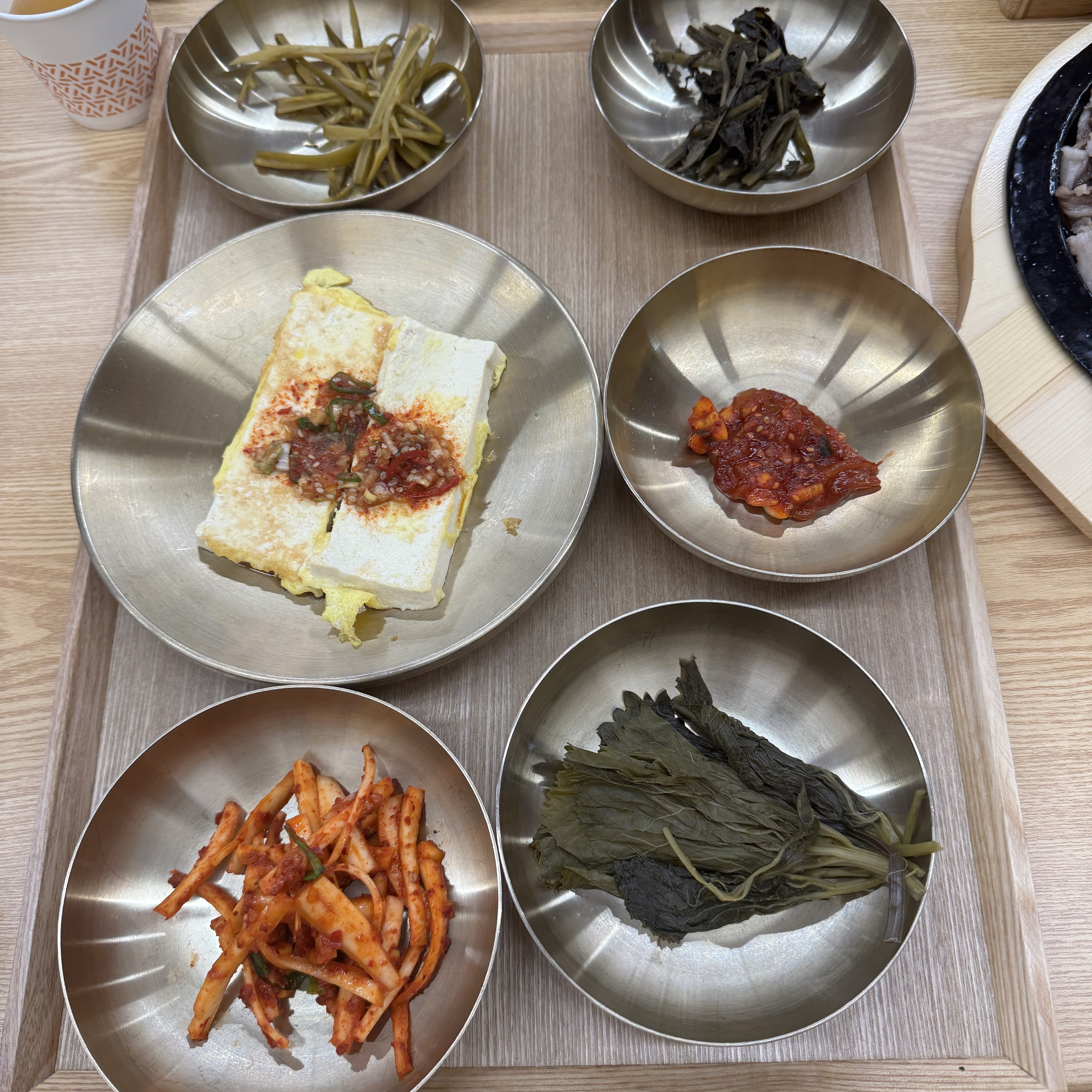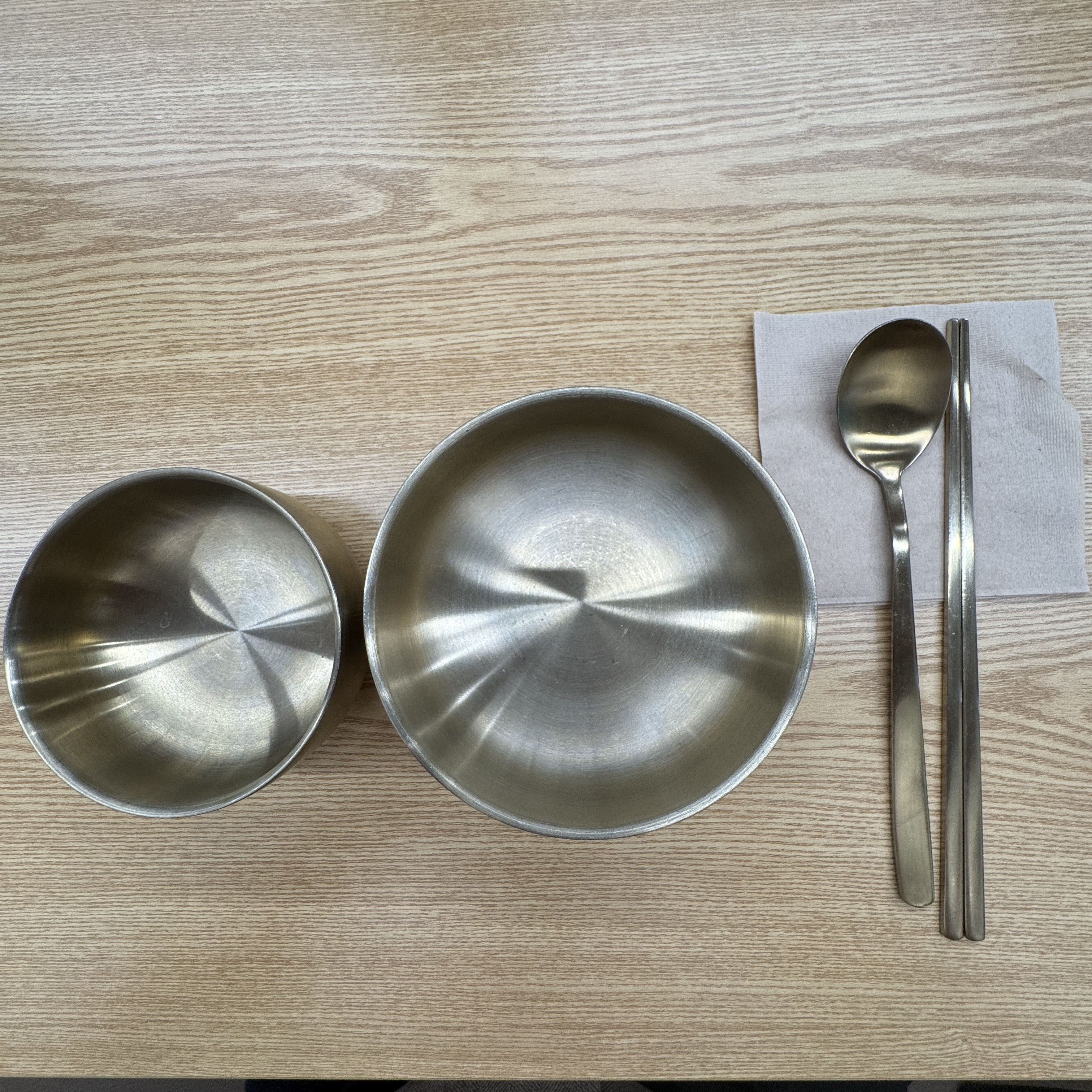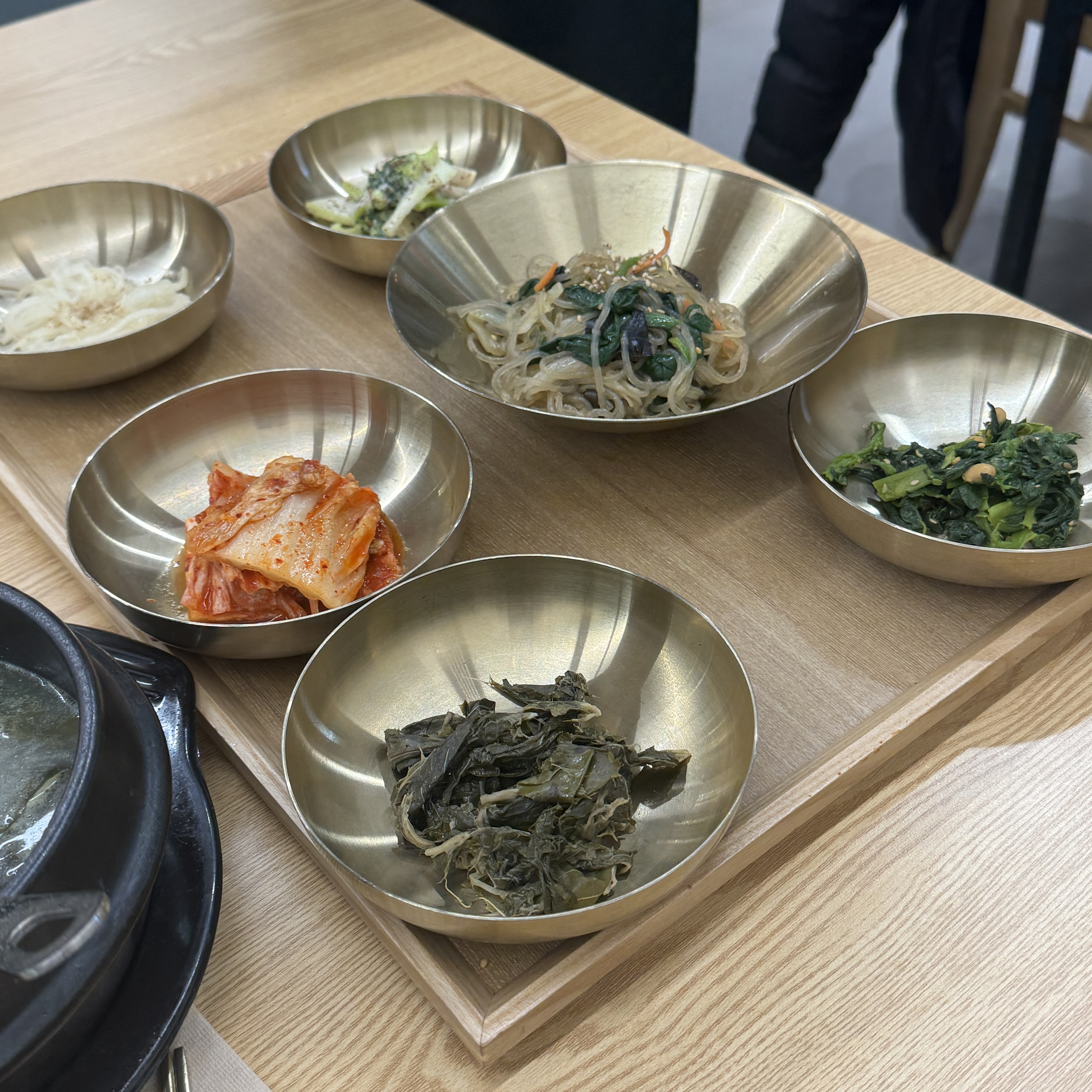 식기는 놋쇠로 되어 있어 한정식 느낌 난다. 찬은 가짓수가 12가지인데, 개인적으로 이런 거 보다 맛있는 찬 1-2가지 있는 걸 선호하는 지라. 찬이 맛없지는 않는데, 내 취향에 딱 맞는 건 없더라.