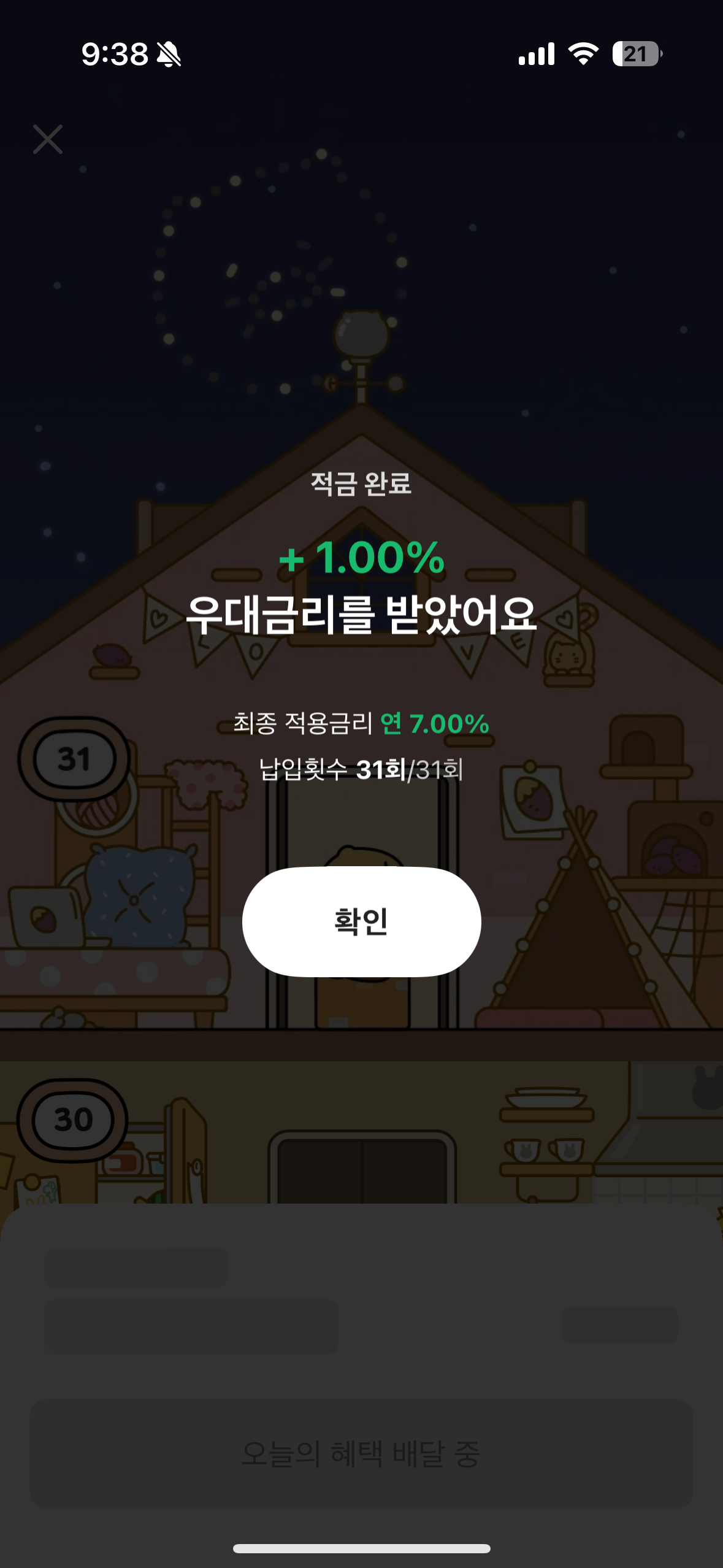 이게 마지막 날 캡쳐한 건데, 매일 불입을 해야 한다. 그래야 이율을 가장 높게 받을 수 있다. 기본적으로 하루에 한 번 입금하면 0.1% 이율이 늘어나는데, 중간 중간마다 보너스 이율까지 해서 최대 7%까지 받을 수 있다. 마지막 날 입금하니까 1% 이율 주네. 그래서 아침에 일어나서 핸드폰 알람 끄고 클릭해서 입금하는 식으로 했다. 하루에 3만원씩. 그 이상은 넣을 수가 없길래.