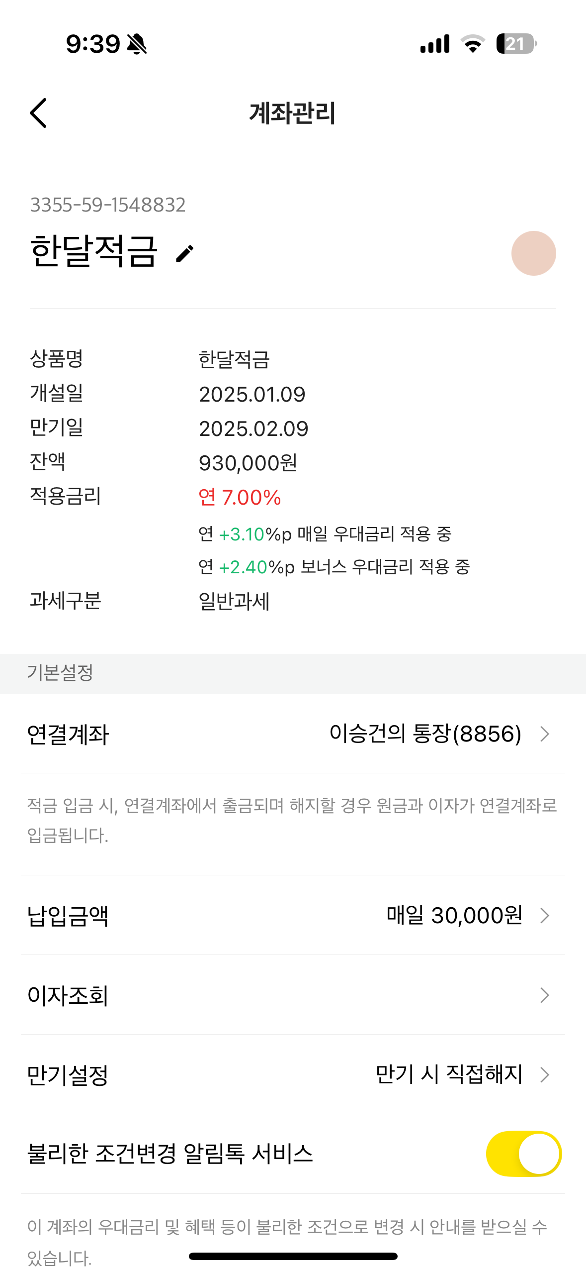 이게 한달적금 결과다. 하루에 3만원씩 총 31일을 입금하여 93만원 입금했고, 적용 이율은 7%인데, 이게 연이율이라는 거까지는 이해되지만 계산해봐도 그렇게 적용되진 않는다. 93만원 넣고 이자 2,853원. 세금 420원 제하고 나니 2,433원이다. 뭐 손해 아니니까 일단 해보자 해서 한 건데, 아마도 시작 금리에서 최종 금리까지 일할 계산되어서 적용된 건가 싶다. 안 그러면 저 금액이 나올 수가 없잖아.
