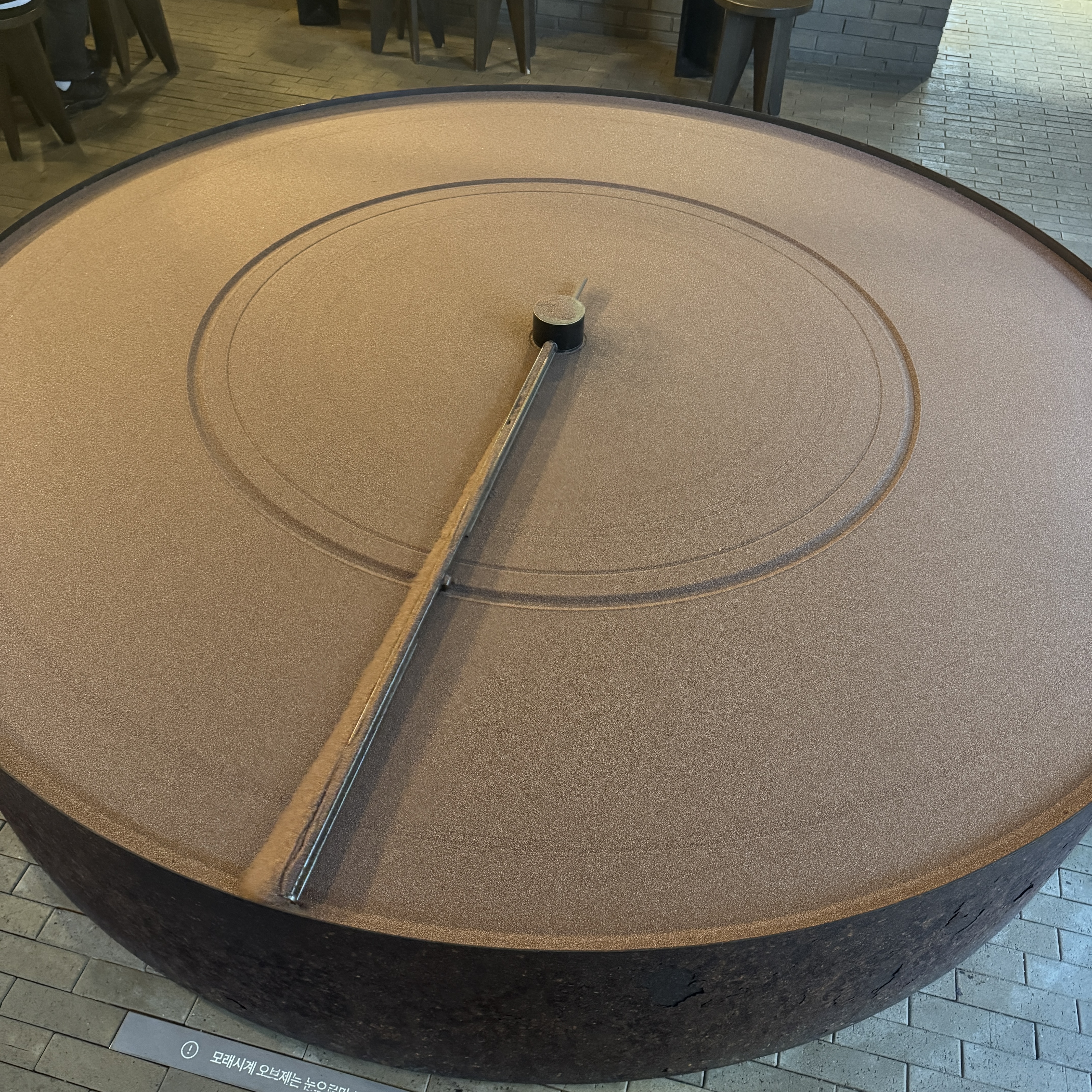 사람 많더라. 그래서 어디에 앉아야겠다는 초이스를 할 수 없이 자리 있는 곳에 앉았는데 바로 앞에 대형 모래시계 오브제가 있더라. 인스타 릴스에 보면, 마음의 상처를 치유하는 걸 모래시계로 표현한 게 있었는데, 그거 생각나더라. 한켠에 모래를 파두면 축이 계속 돌아가면서 평탄화시켜서 메워주는 걸 상처의 치유로 묘사한 릴스였지. 바닥에 눈으로만 보라고 되어 있어서 건드리지 않았는데, 어떤 꼬마가 와서 모래에다가 글씨 쓰고 놀더니 그거 보고 다른 커플도 와서 모래에 글씨 쓰고 인증샷을 찍고 그러더라. 역시 용감해야 돼. ㅎ