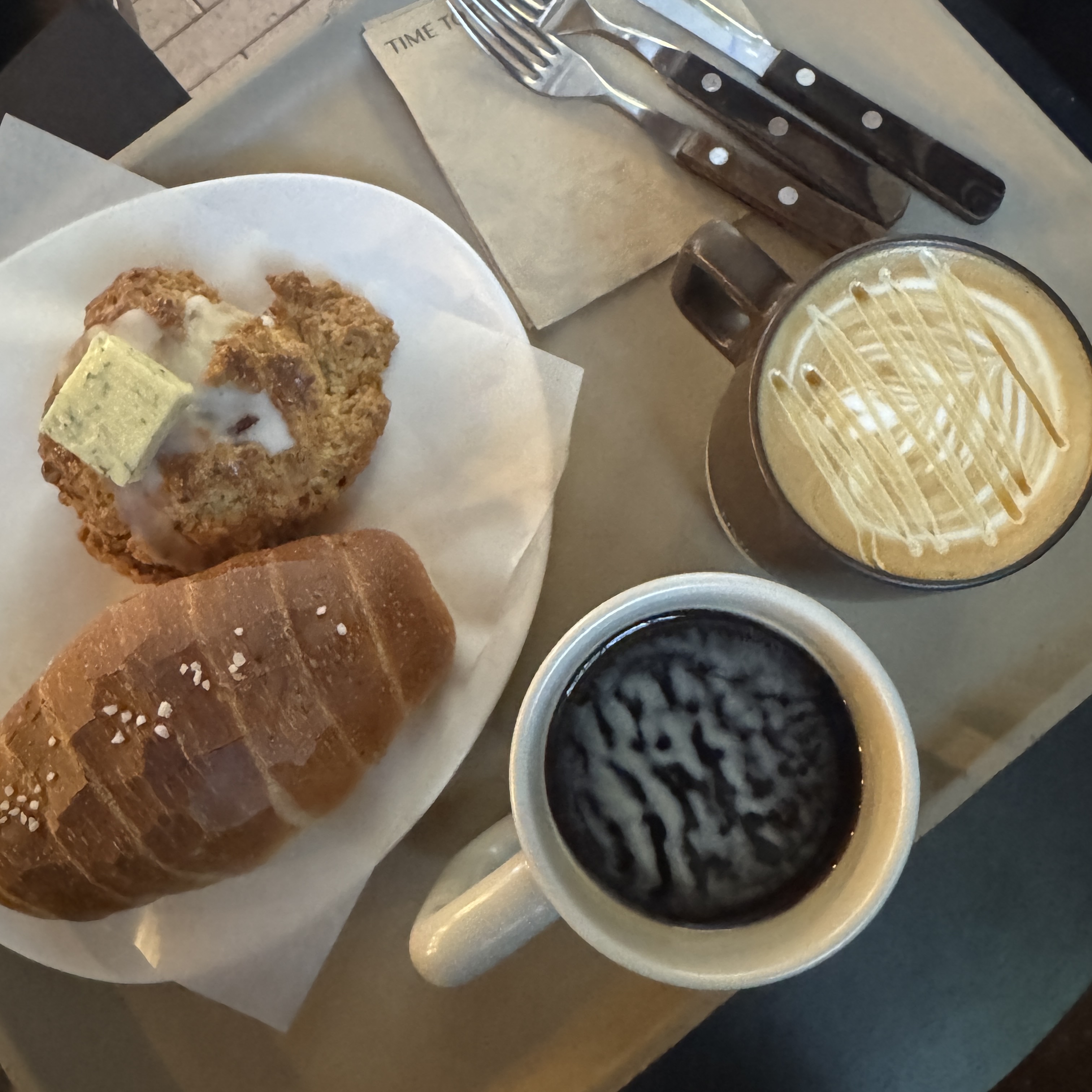 나야 항상 시키는 게 마끼아똔데, 메뉴명은 솔티드 캐러멜 라떼. 맛은 있더라. 지인은 커피 맛을 알아서 마셔보더니 괜찮다고 그런다. 다만 아쉬운 건 양이 적어. 그리고 시킨 빵. 베이커리도 있지만 여기는 음식도 시킬 수 있더라. 파스타나 리조또류.