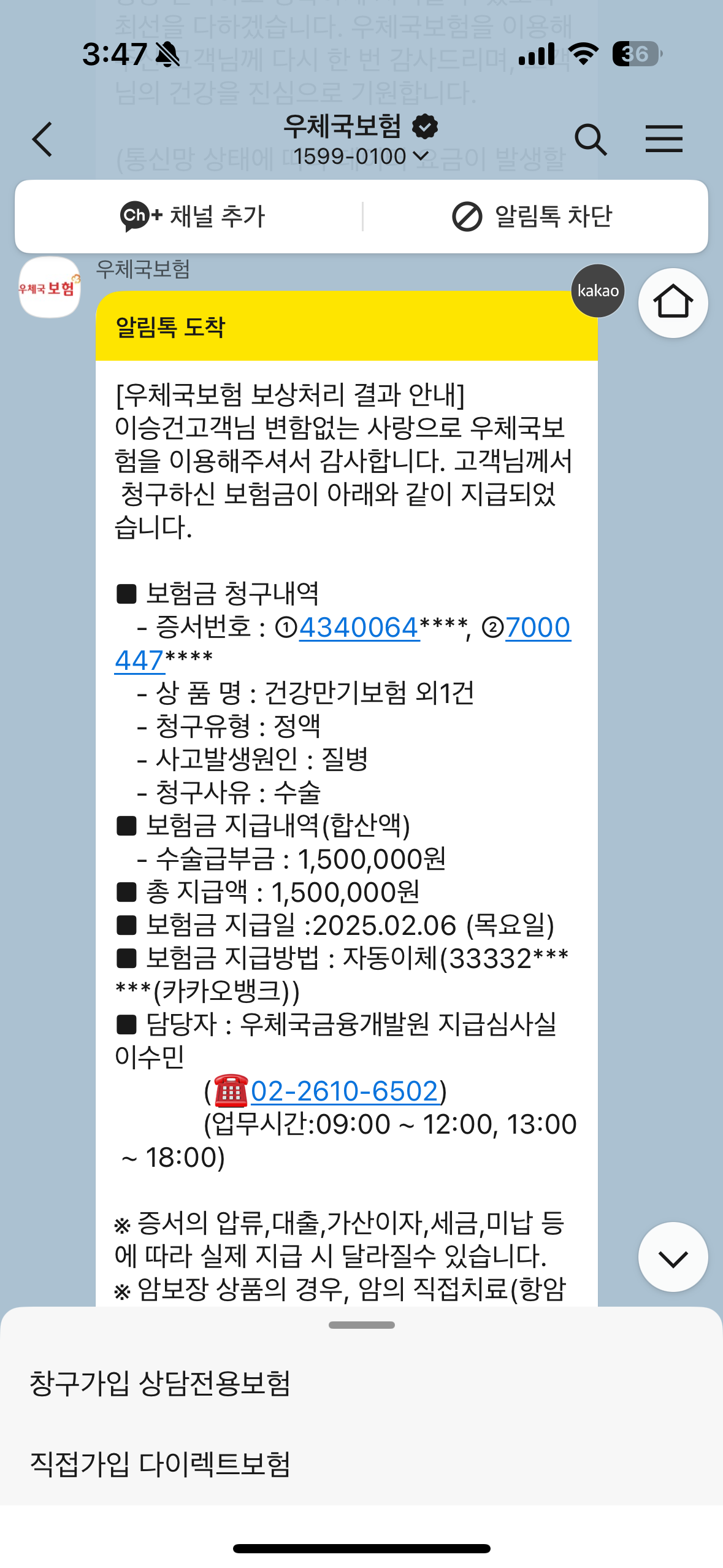 우체국 보험이나 미래에셋이나 앱에서 청구할 수 있고, 청구한 내역은 다음과 같다.(우체국 보험만 보여준다.)