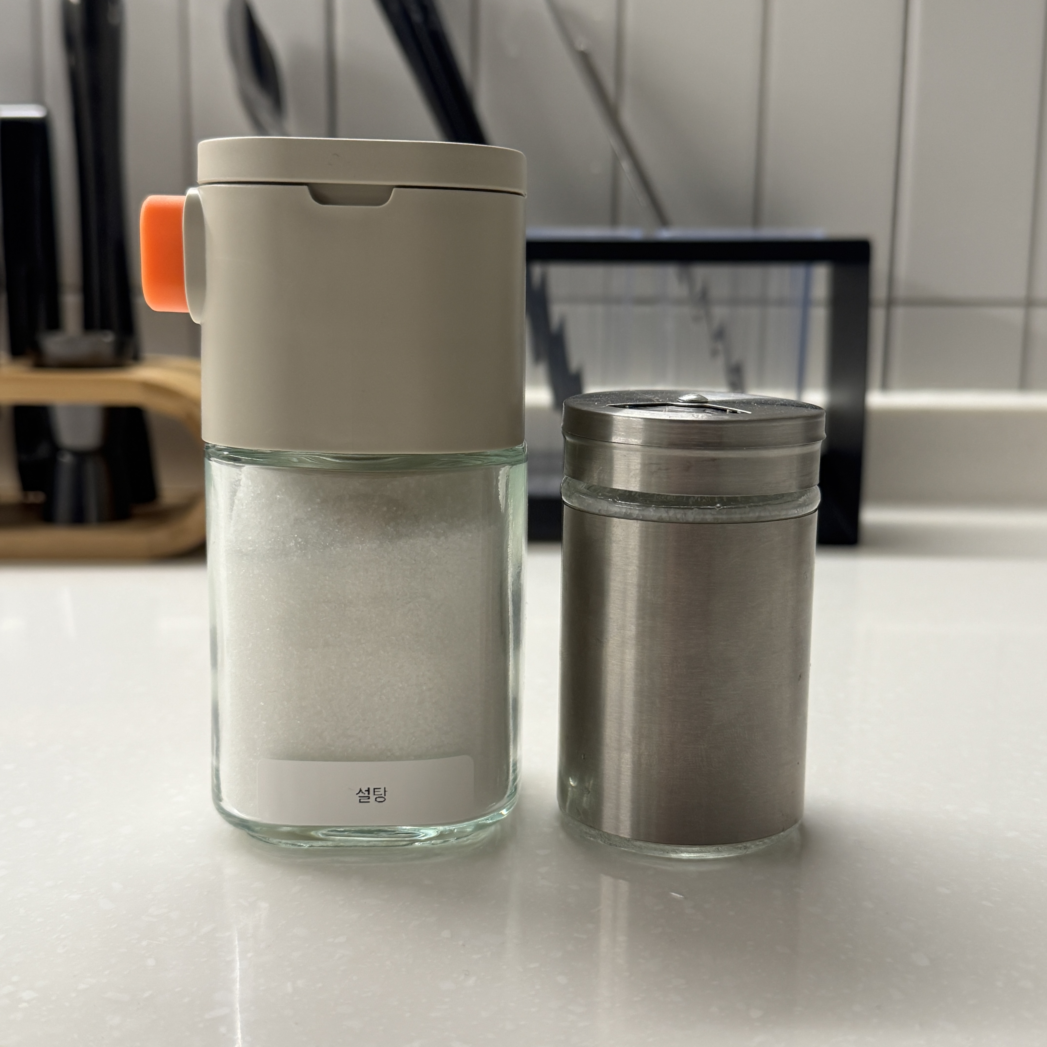 기존에 쓰던 스테인레스 스틸 양념통이랑 크기 비교해보면 확실히 차이 나지. 이게 더 나은 거 같다. 아무래도 추가 구매해야할 듯. 후추, 소금, 고춧가루, 참깨. 4개 필요하네.