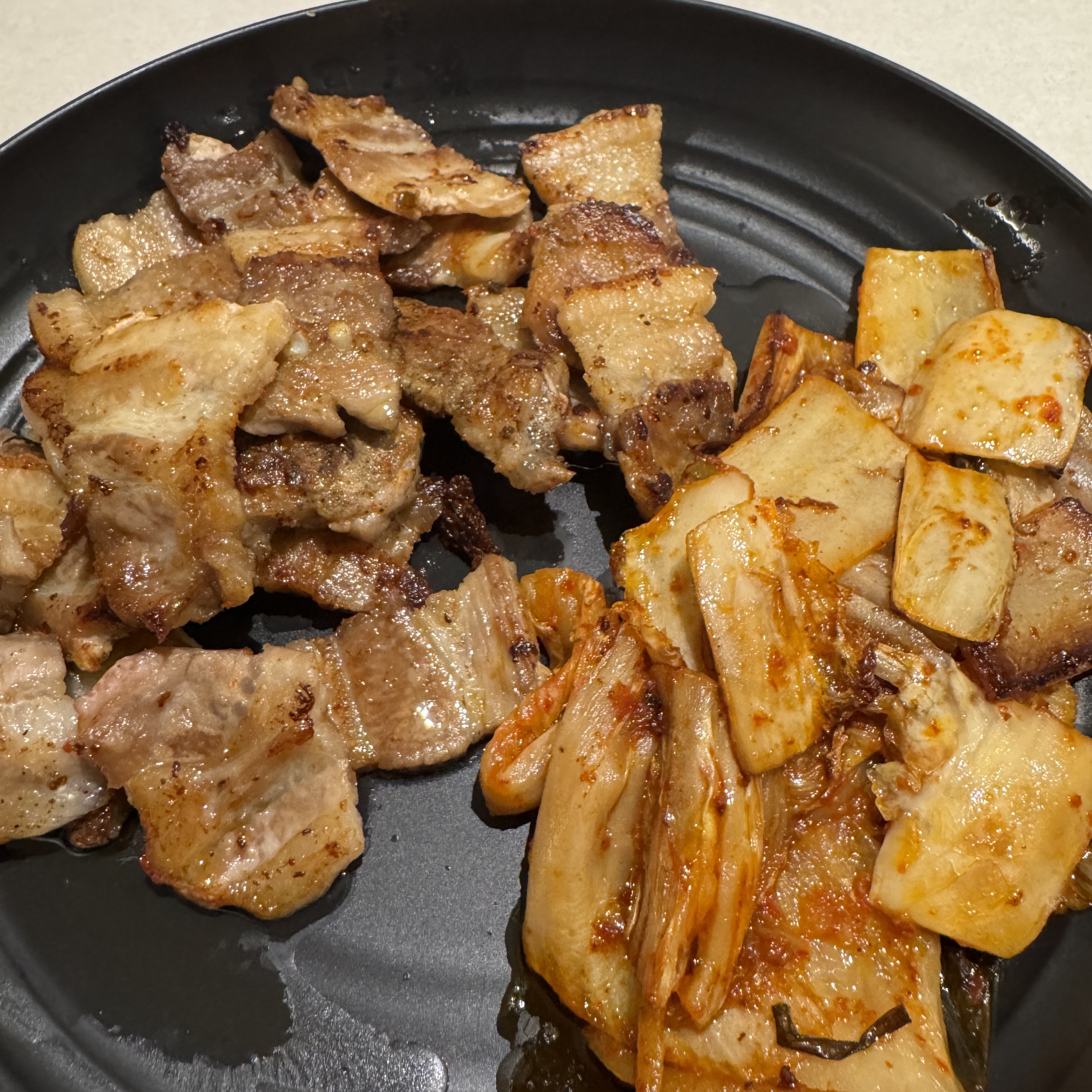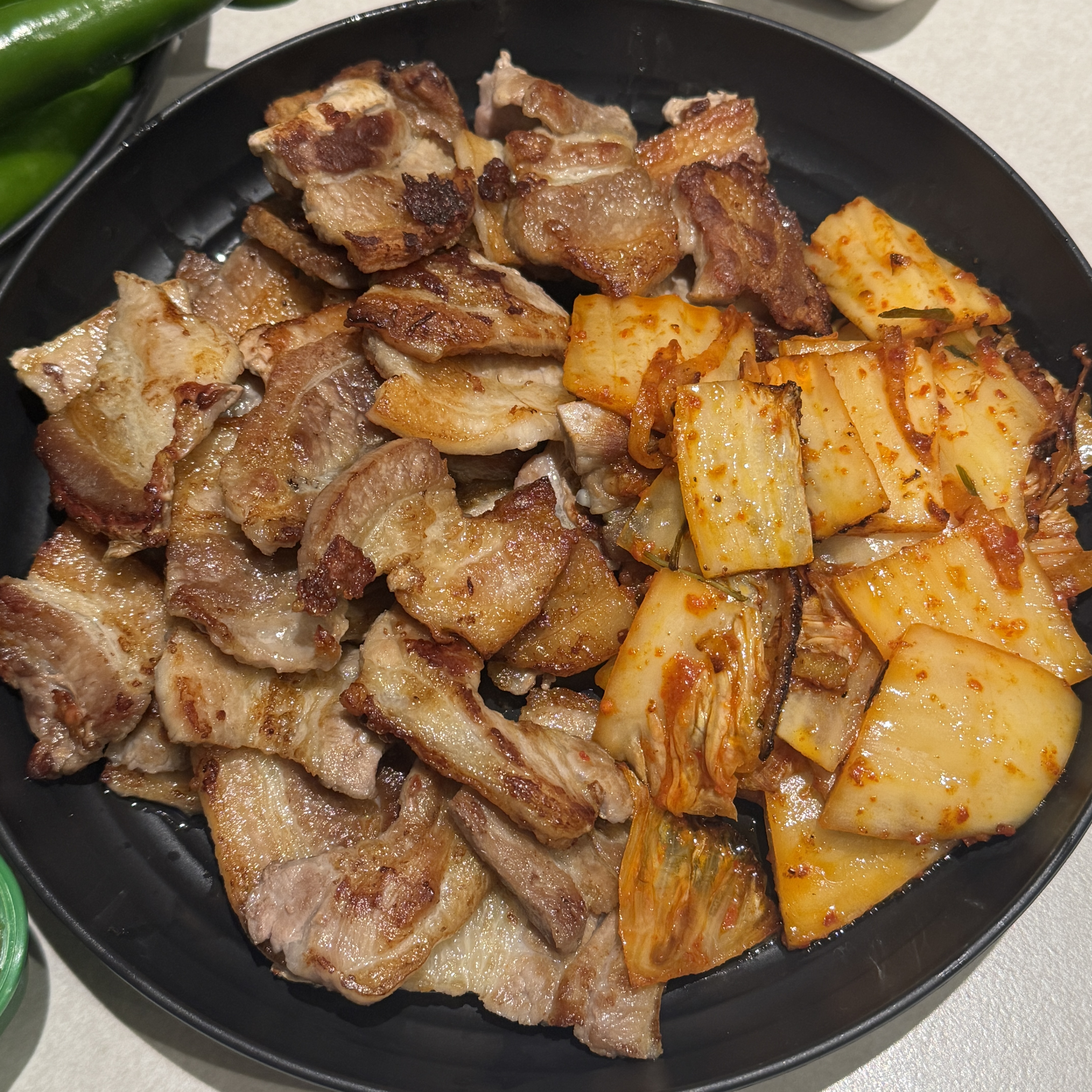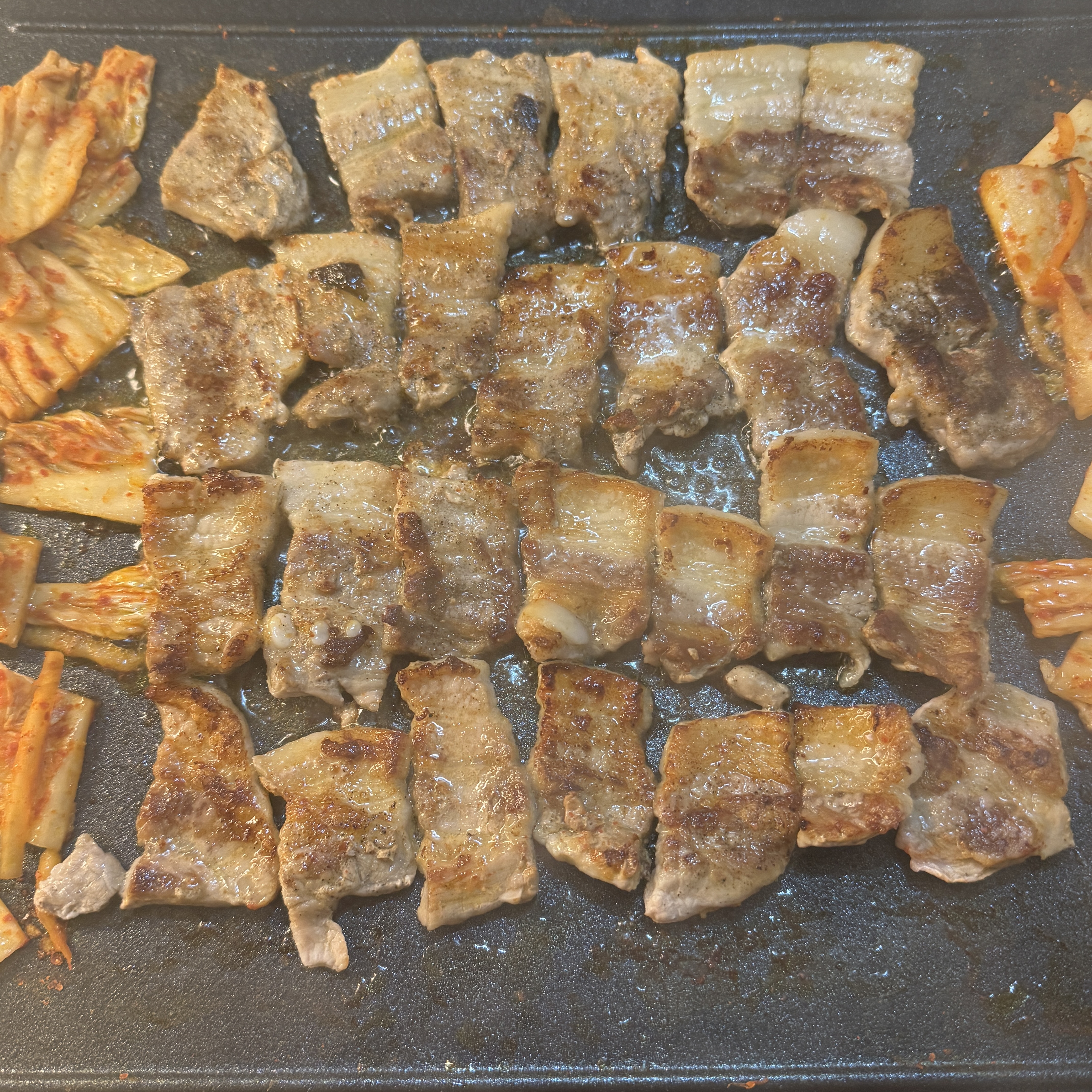 동생이랑 같이 삼겹살 먹은 2일 뒤, 또 삼겹살 먹었다. 유통기한이 3/2까지라. 이번엔 300g 정도만. 확실히 삼겹살엔 김치가 궁합이 잘 맞는 듯. 게다가 김치를 구울 때는 삼겹살 기름에 구워야 제 맛인 듯.