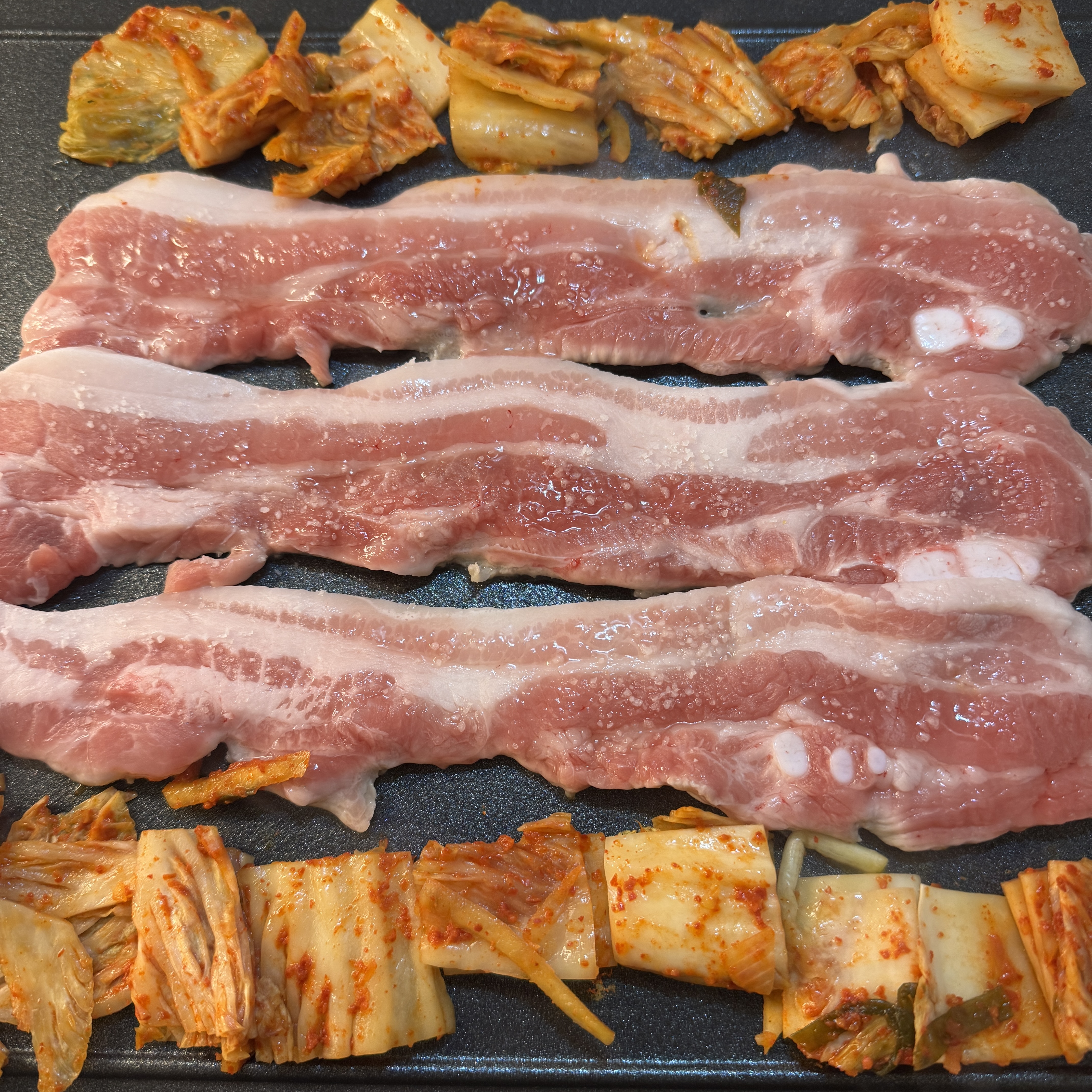 동생이랑 같이 삼겹살 먹은 2일 뒤, 또 삼겹살 먹었다. 유통기한이 3/2까지라. 이번엔 300g 정도만. 확실히 삼겹살엔 김치가 궁합이 잘 맞는 듯. 게다가 김치를 구울 때는 삼겹살 기름에 구워야 제 맛인 듯.