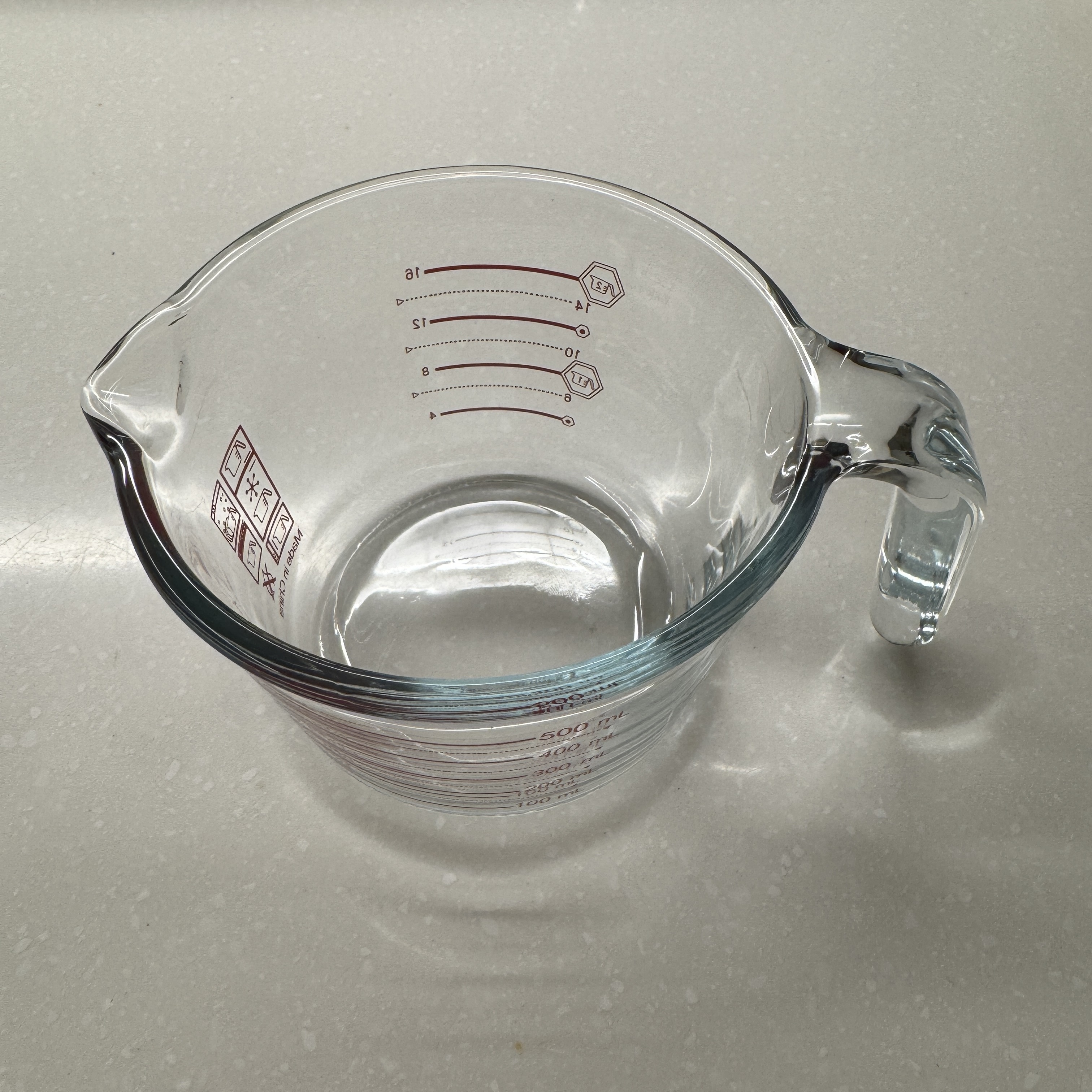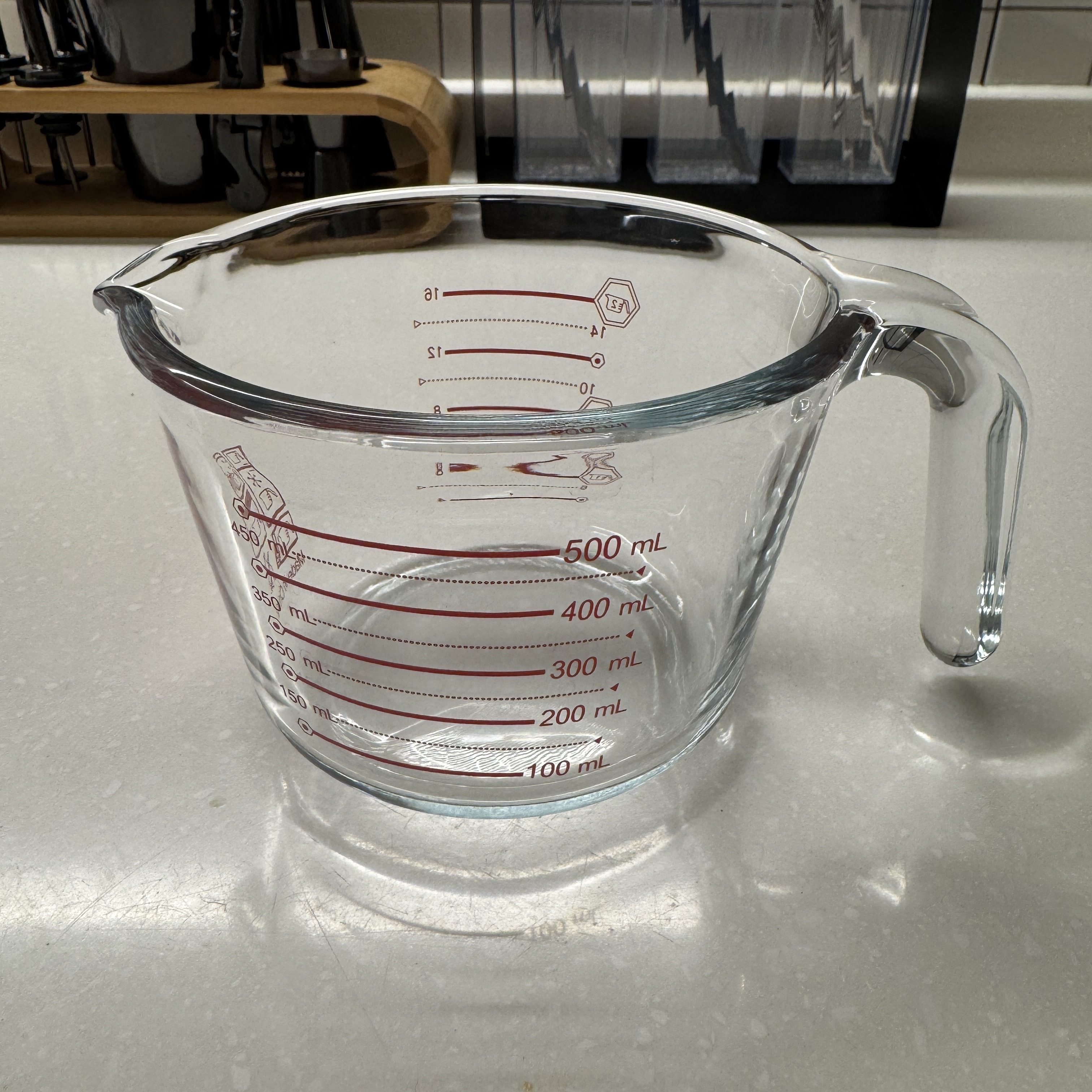 100ml 부터 50ml 단위로 눈금이 있다. 요리할 때 뭐 200ml 이러면 이걸로 계량해야지. 지금은 그냥 우유 200ml 짜리 컵에 부으면 어느 정도까지인지 보고 대충 가늠하는데, 그거 반이면 100ml고. 그거 두 번이면 400ml니까. 그렇게 써도 되긴 하지만 계란 풀 때 사용하기 딱 좋은 용도기도 해서 뭐 사두면 이리 저리 잘 활용해서 쓸 듯.