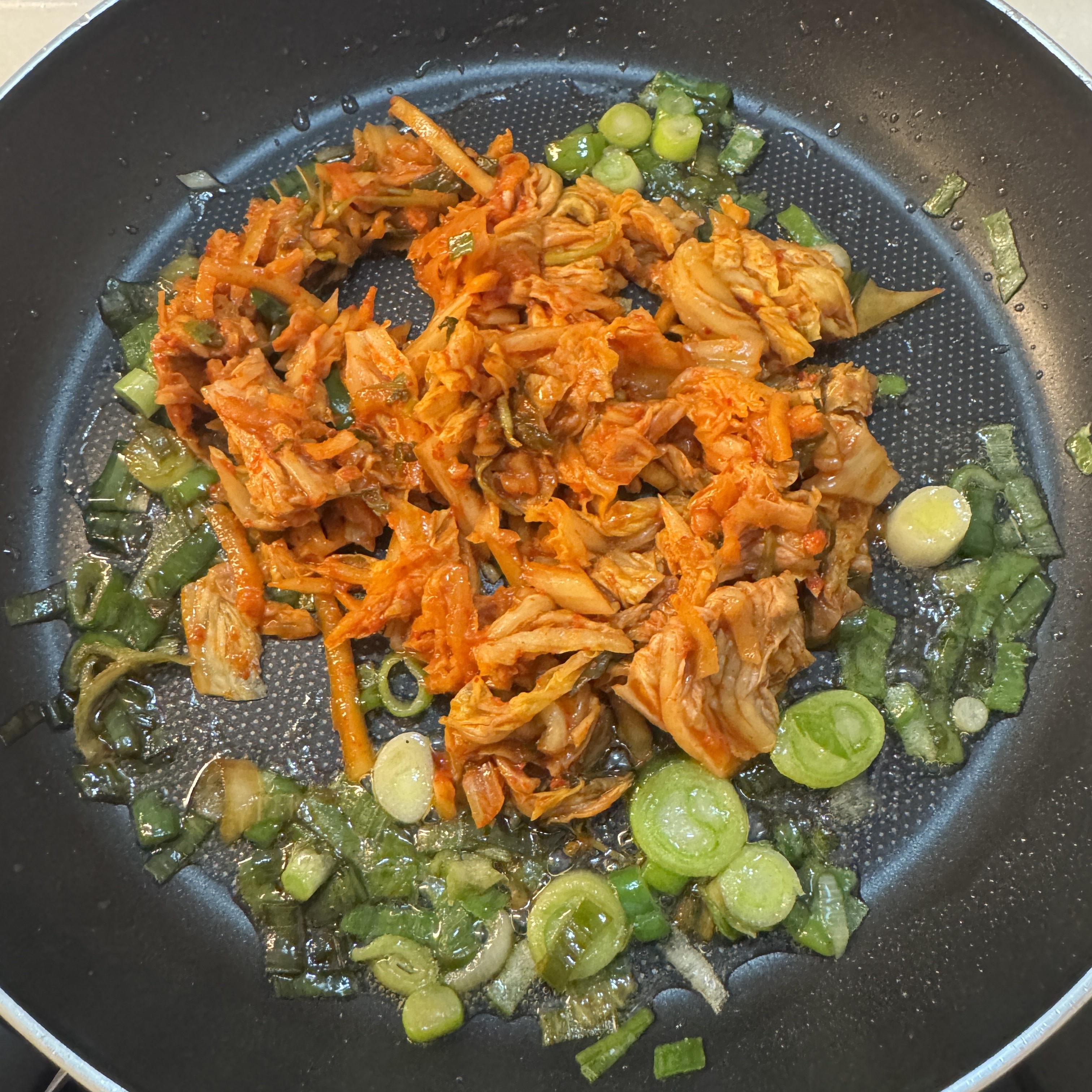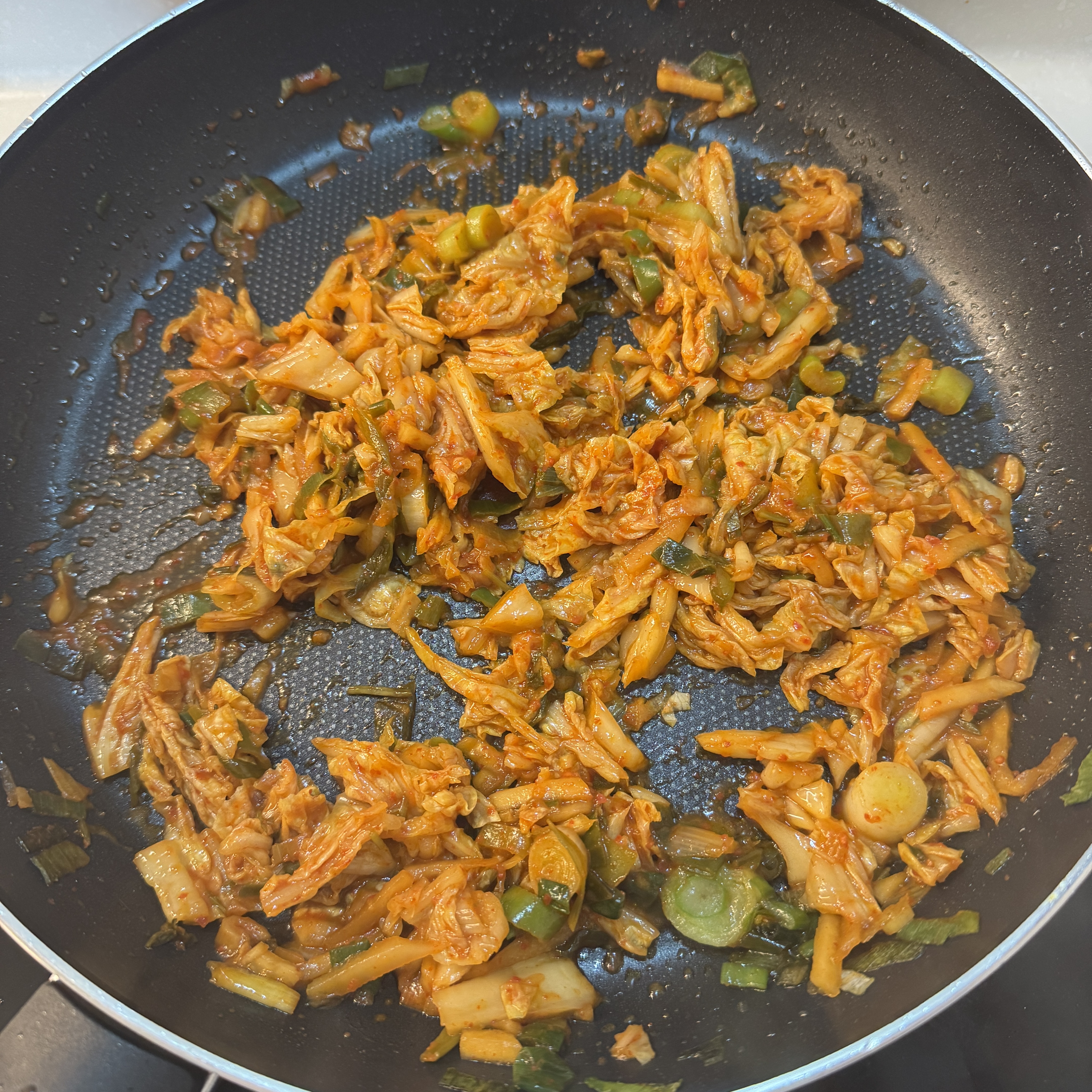 그리고 김치 넣고 볶고. 확실히 양념을 넣고 볶다 보면 군침이 돌아. 맛있는 냄새가 싹 올라오거든.