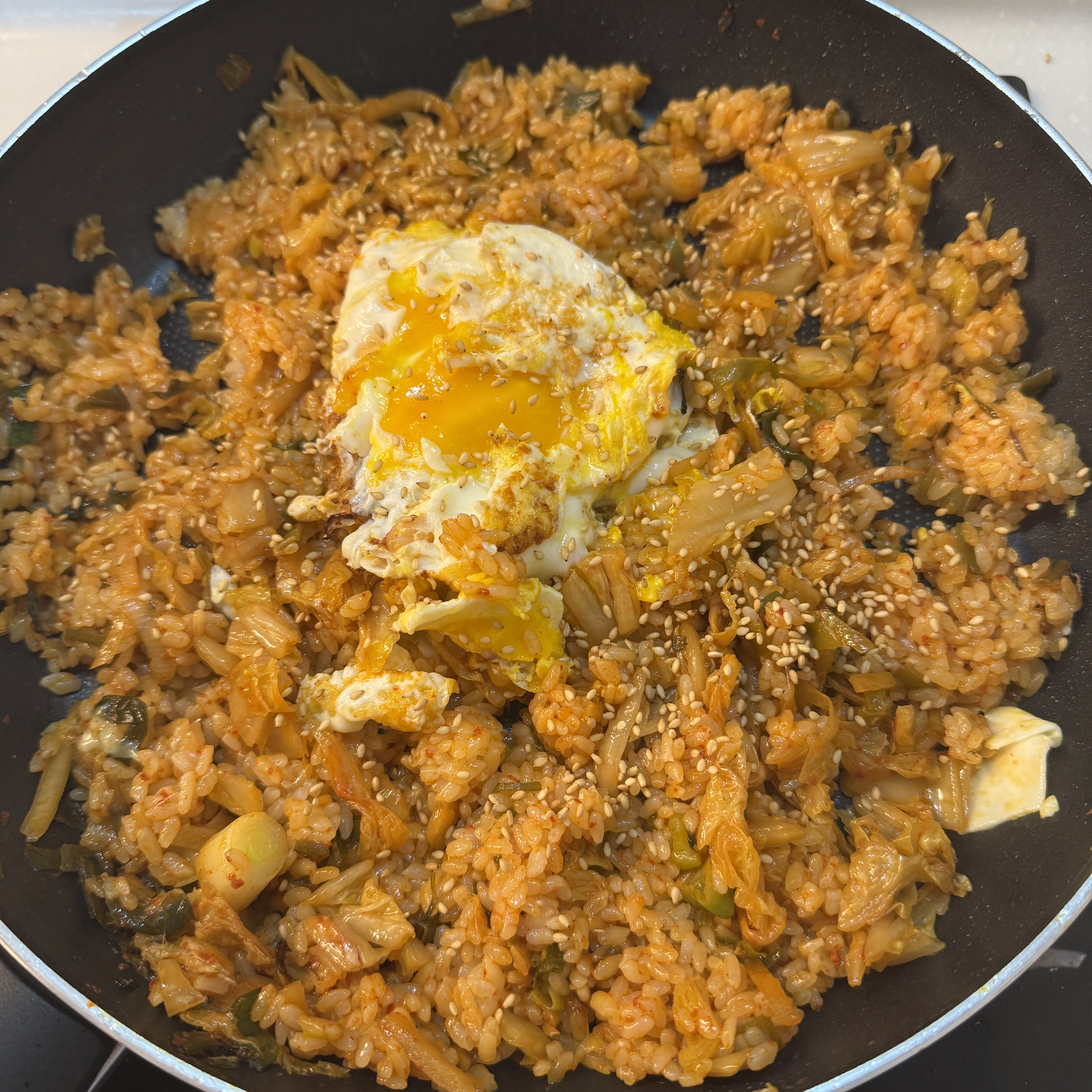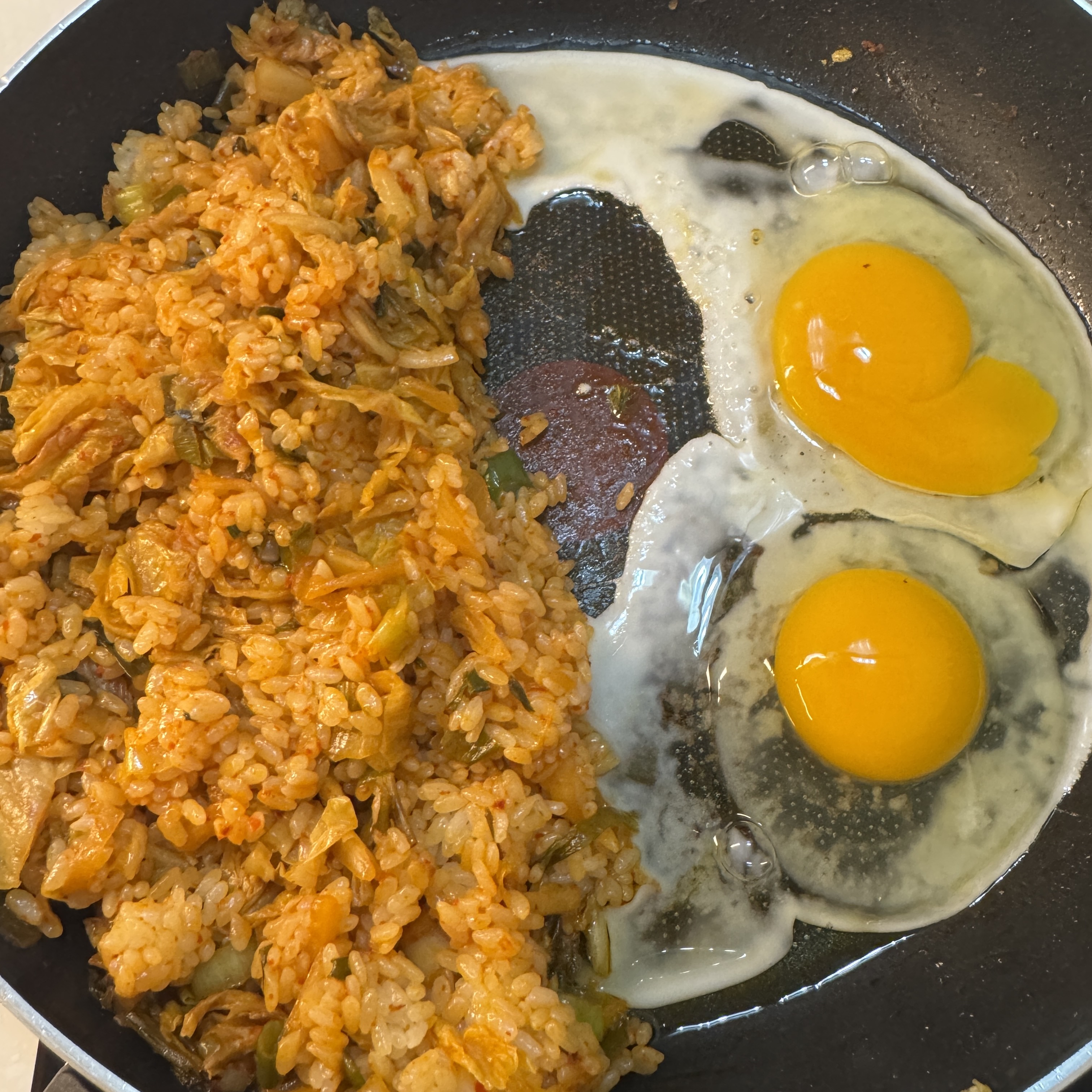 그리고 밥 넣고 볶고, 한 켠에 계란 후라이 두 개. 원래 계란 후라이는 따로 해서 볶음 밥 위에 올려주는데 귀찮아. 그냥 하나의 팬으로 다 끝내버려. 근데 이렇게 볶음밥 해먹으려고 쌀도 샀다. 요즈음 내가 현미만 먹다 보니 백미가 없어서.