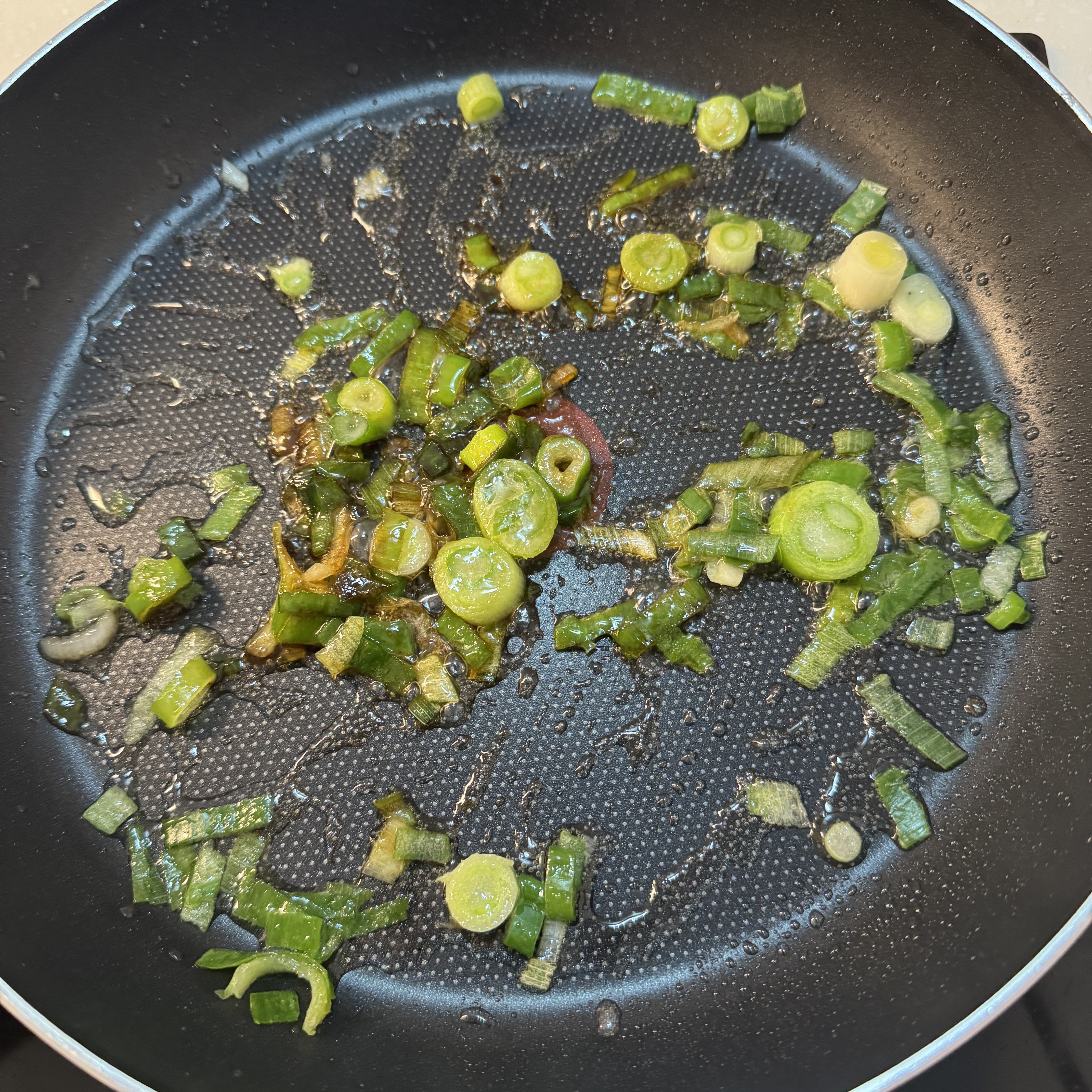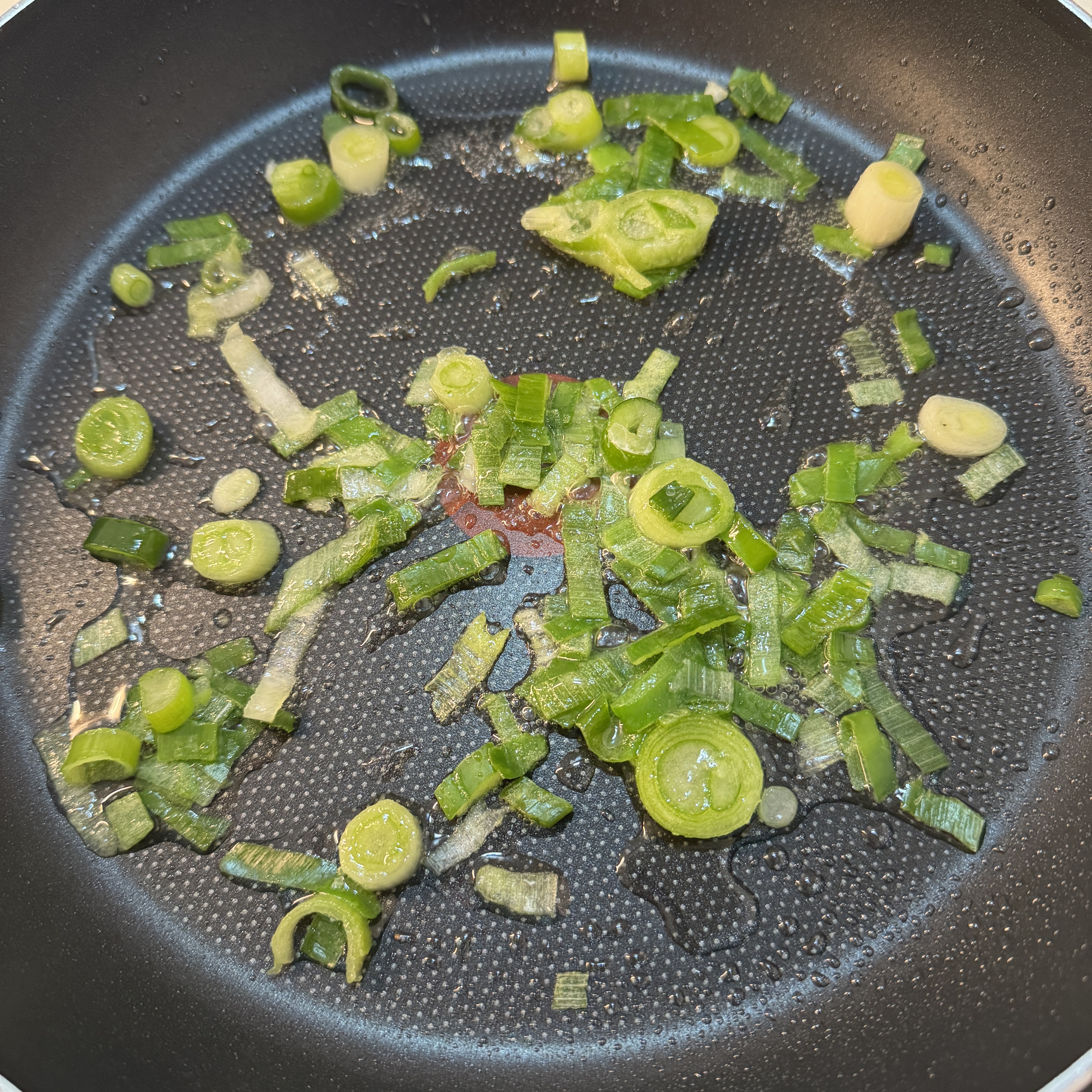 일단 냉동 대파 한 웅큼 집어서 팬에 올려주고 볶았다. 내 음식해본 지 얼마 안 되지만, 양념 만드는 거는 아낄 필요가 없다는 생각이다만, 그렇다고 너무 과할 필욘 없으니 적당히.