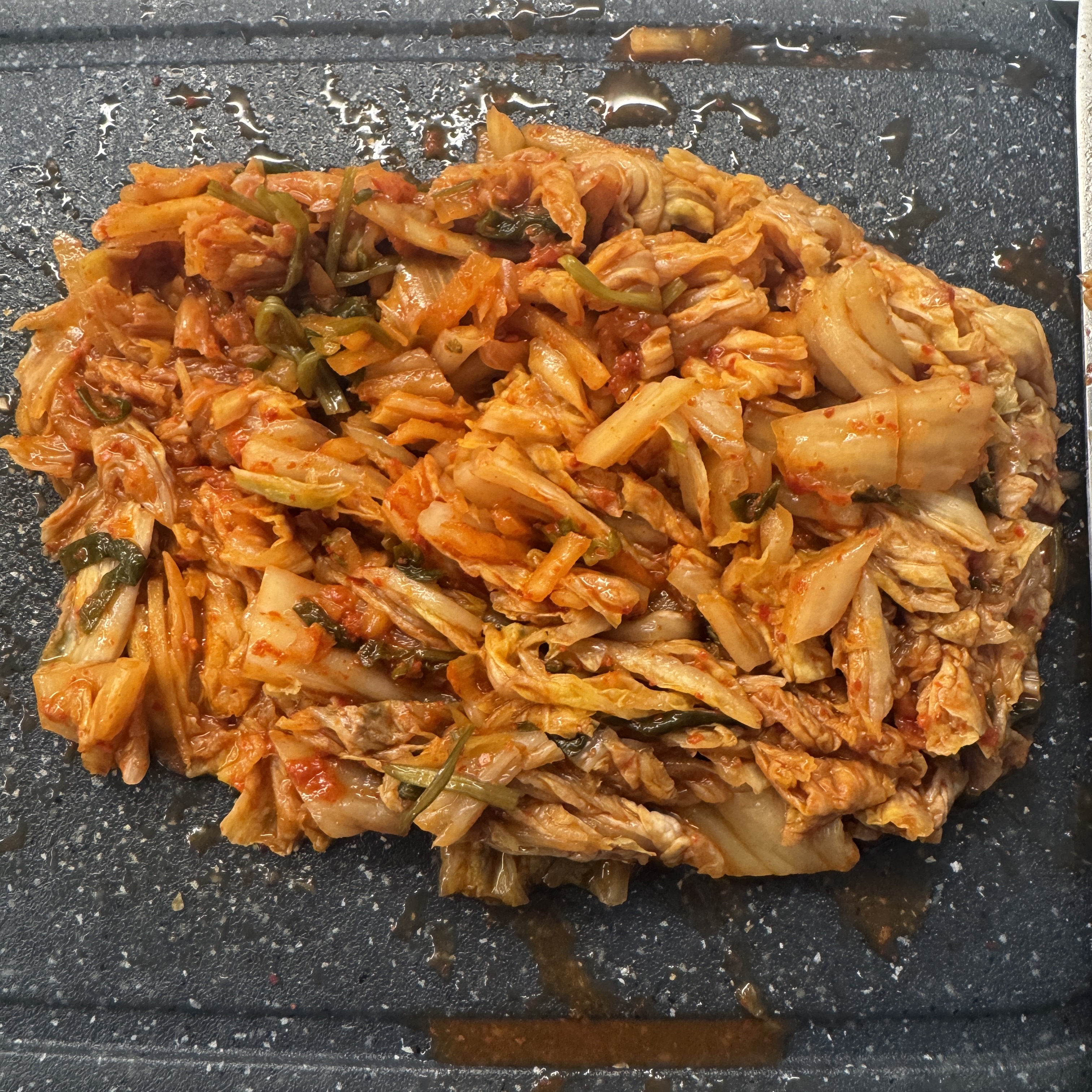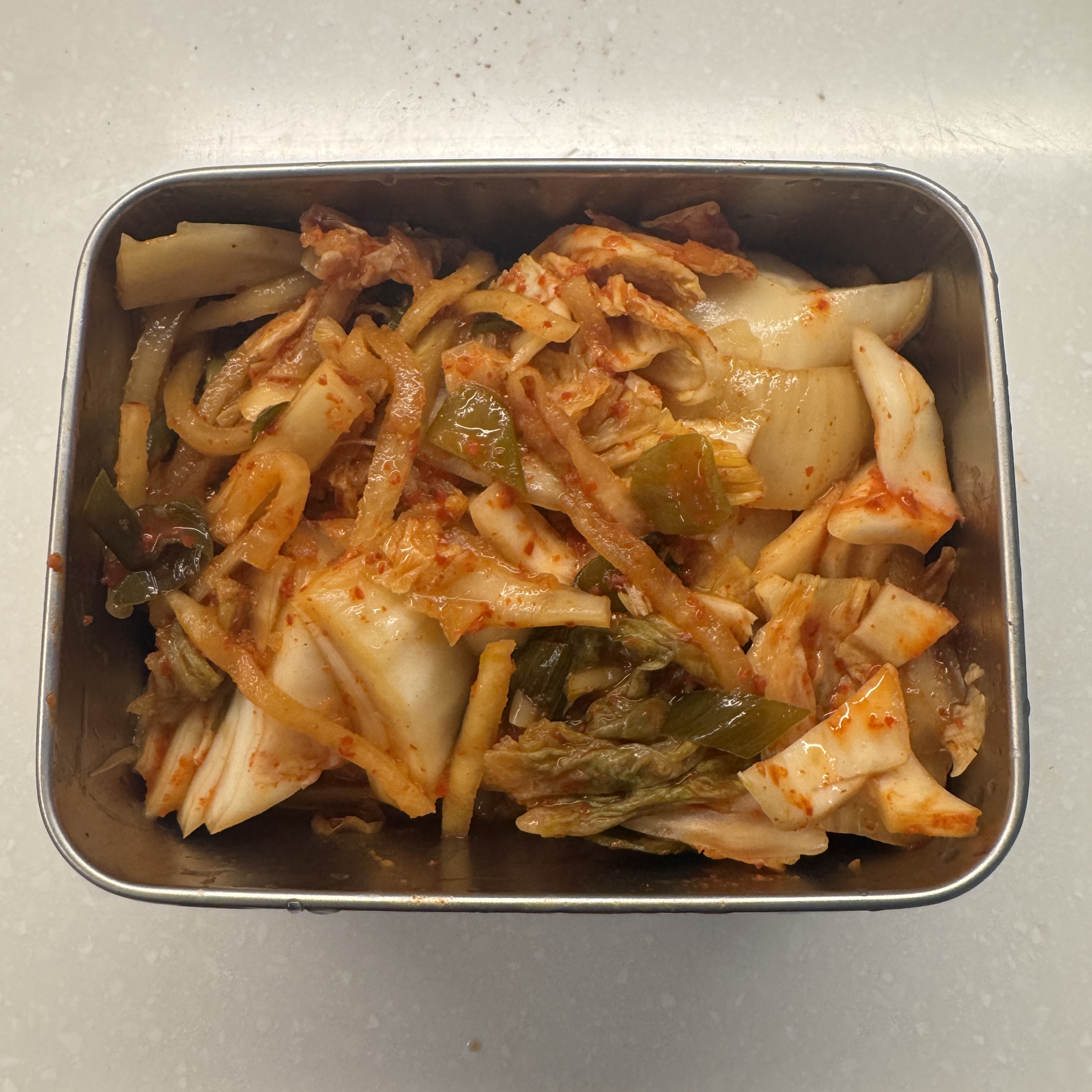 어머니께서 주신 김치인데 동생한테 준 건 익었고, 내 껀 안 익어서 동생꺼랑 내꺼랑 바꿨다. 적당히 익어서 맛있는데, 좀 더 지나면 실 거 같아서 이 때 김치볶음밥 해먹으면 좋겠다는 생각이 들었지. 일단 김치 먹기 좋게 잘라서 용기에 담아두고 김치볶음밥 할 나머지는 잘게 썰어뒀다.