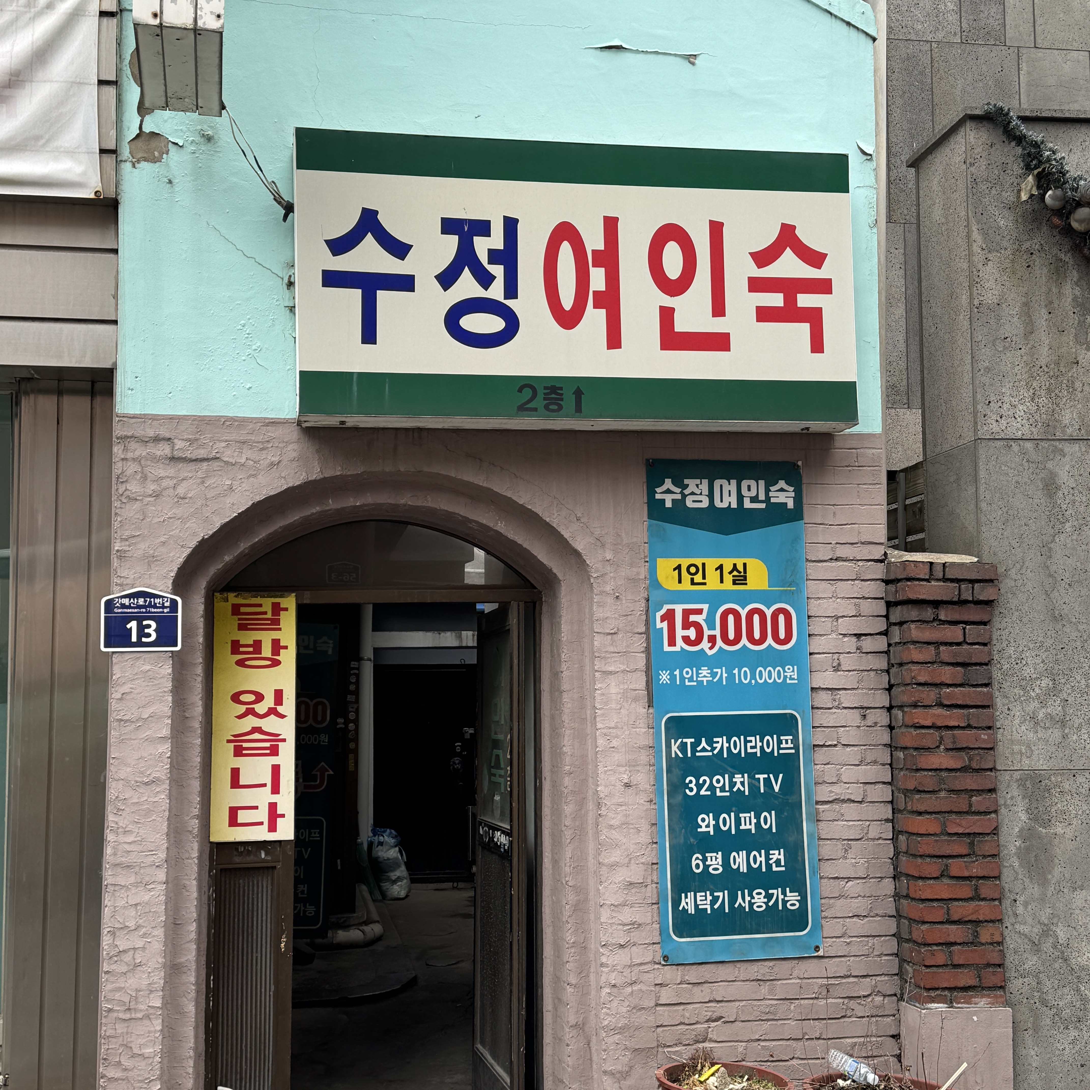 걸어서 왔기에 너무 멀리 가면 안 된다 해서 터닝해서 내려오는 길에 여인숙. 1인 1실 15,000원. 와이파이도 되고, TV에 에어컨도 있고. 30일 쓰면 45만원인데, 그럼 달방으로 계약하면 얼마나 할인해주는 건가? 궁금.