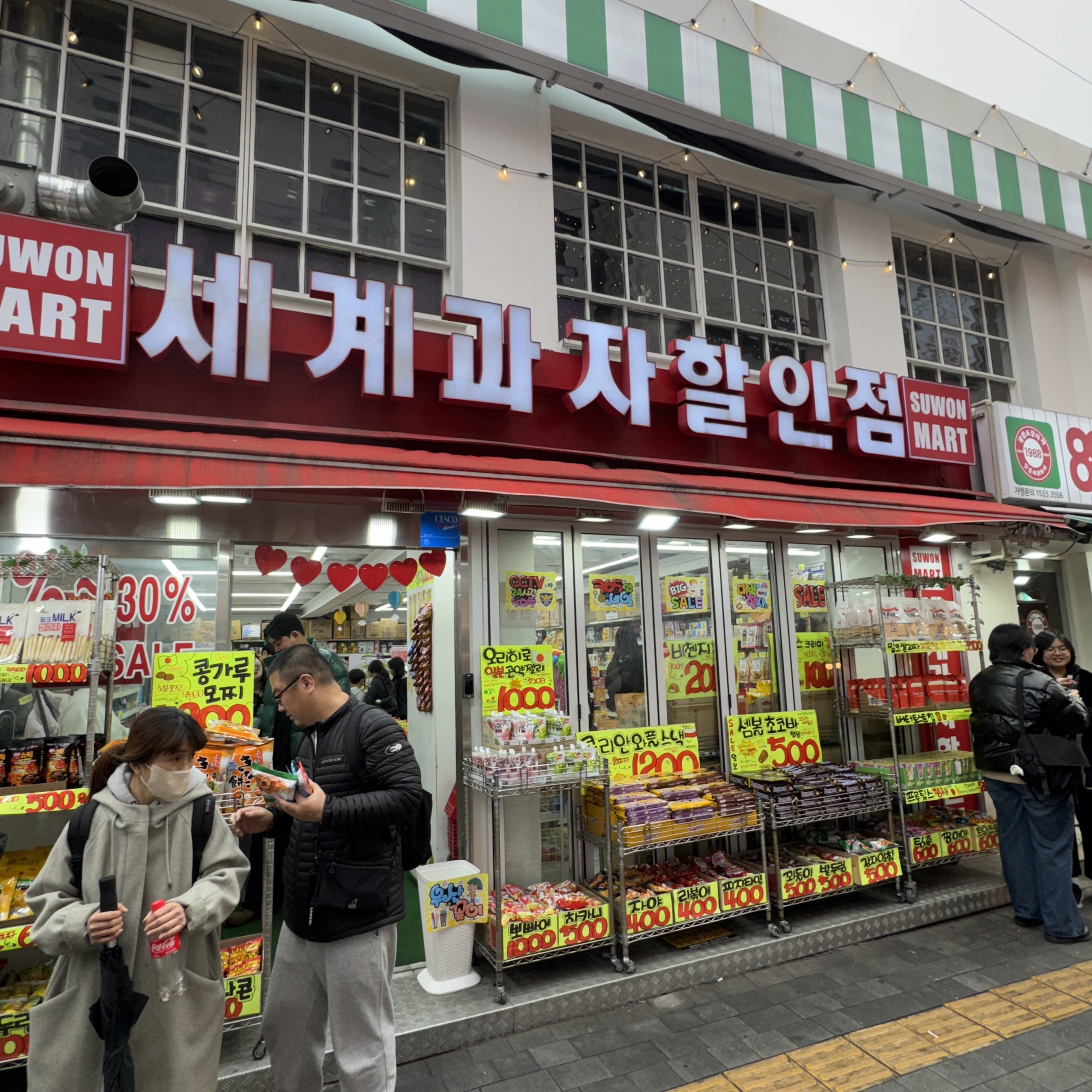 그리고 다시 수원역 로데오거리. 세계 과자 할인점 있길래 들어가봤다. 싸더라. 초코 웨하스가 1,000원 조금 넘는 가격? 한국 과자 사는 거보다 낫겠다 해서 초코가 든 과자 두 개 사고, 지팡이 사탕 하나 사서 물고 나왔다.