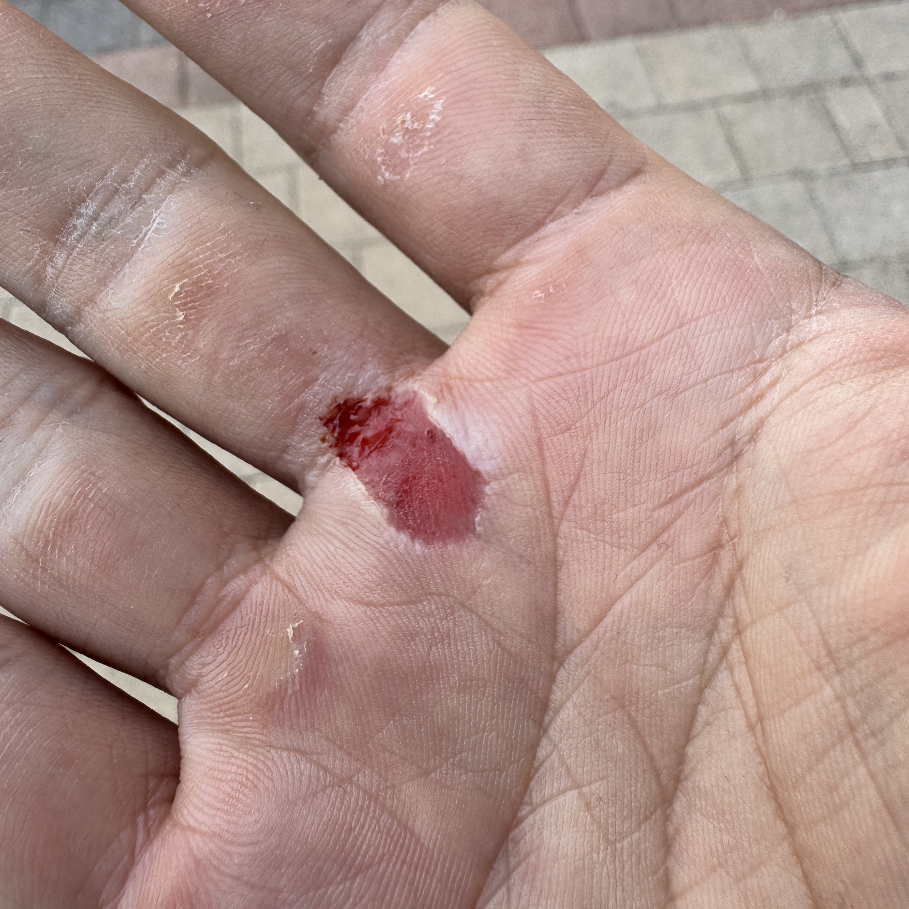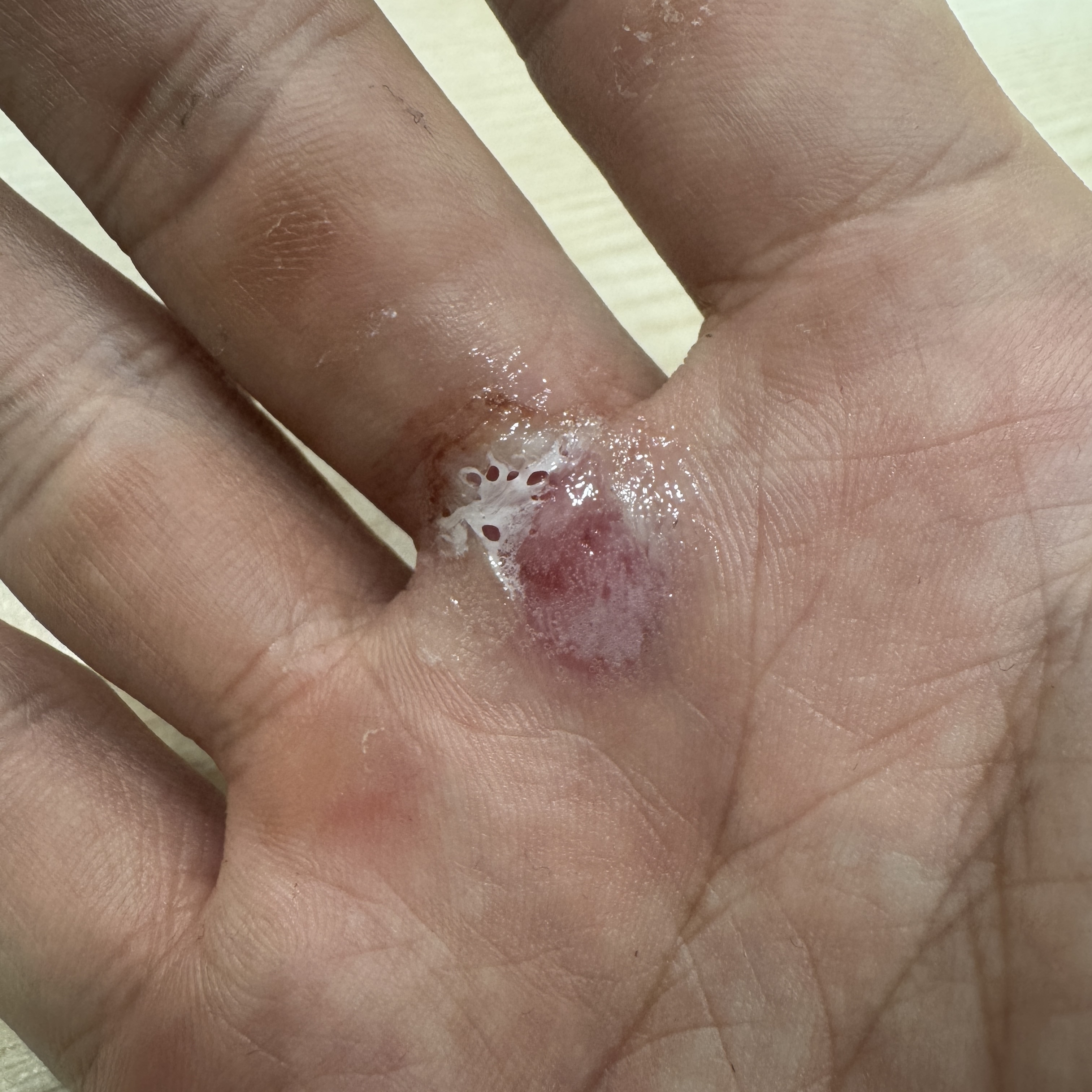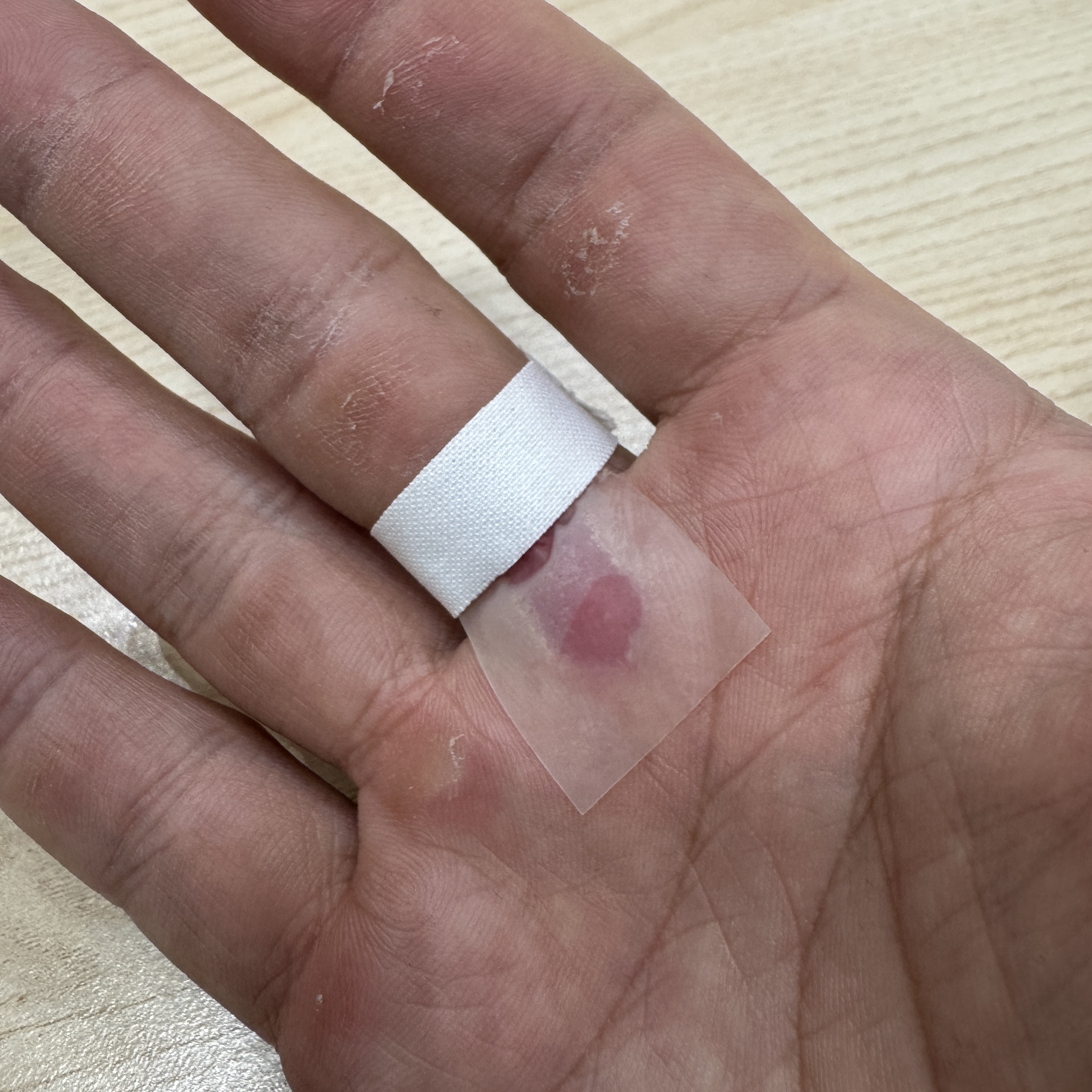 그게 이 오른손이다. 클라이밍 끝나고 반창고 들췄더니 표피가 한 꺼풀 벗겨진 거였다. ㅠ 나올 때 보니까 이렇다. 특히 손가락과 바닥의 경계 부위는 좀 많이 패여 있다. 그 부분이 제일 따갑기도 하고. 근데 부위가 부위인지라 쉽게 낫지는 않을 거 같다는 생각이 들더라. 좀 오래 가겠네. 쩝.