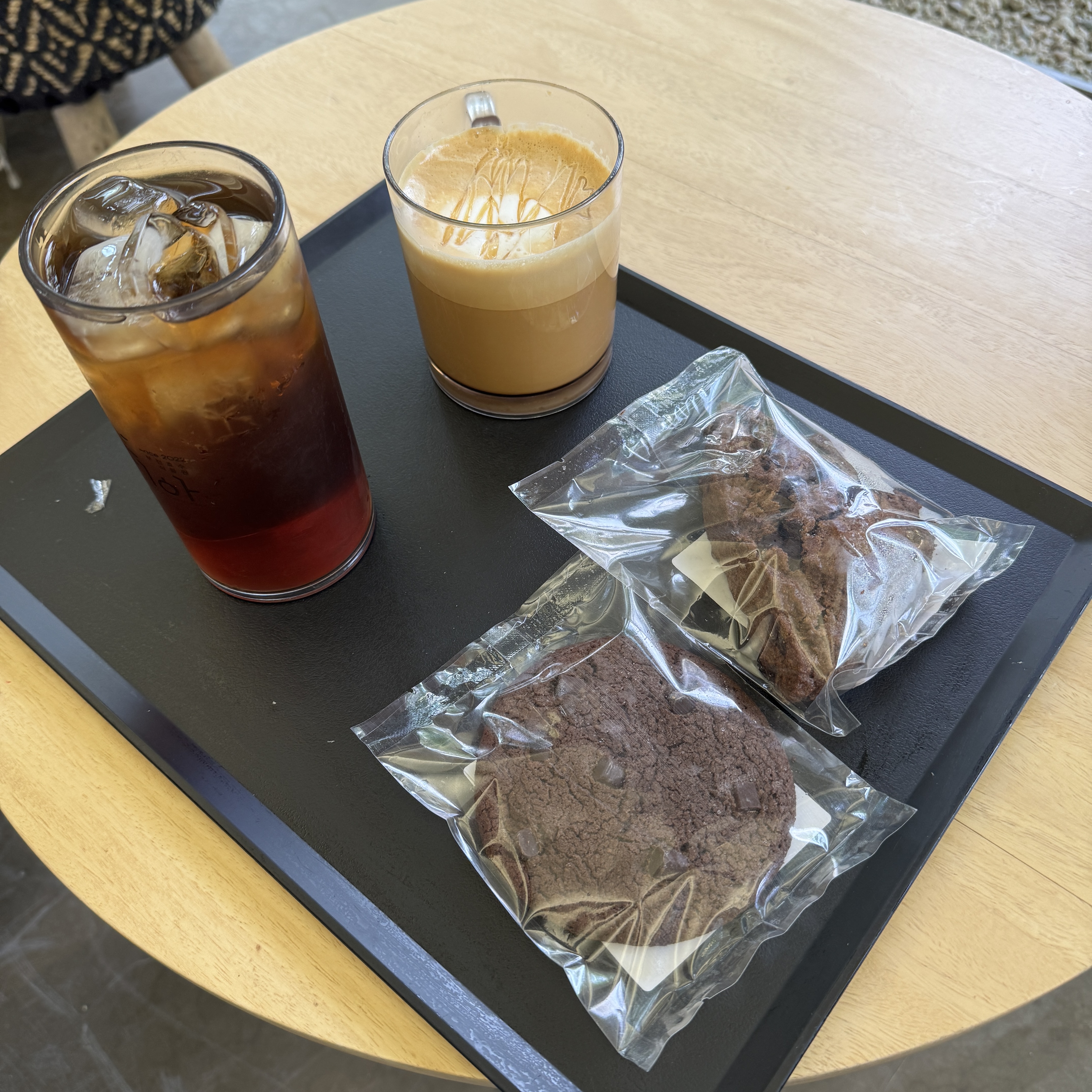 주문하는 곳과 음료를 이용하는 데는 나눠져 있더라. 아들은 더블쇼콜라쿠키에 아이스티, 나는 쇼콜라스콘에 카라멜 마끼아또. 가격은 저렴하다. 일반 카페의 반값 정도 수준? 그리고 카페에 앉아서 식물들을 볼 수 있어서 좋았다. 카페는 1층과 2층으로 나뉘어져 있고.