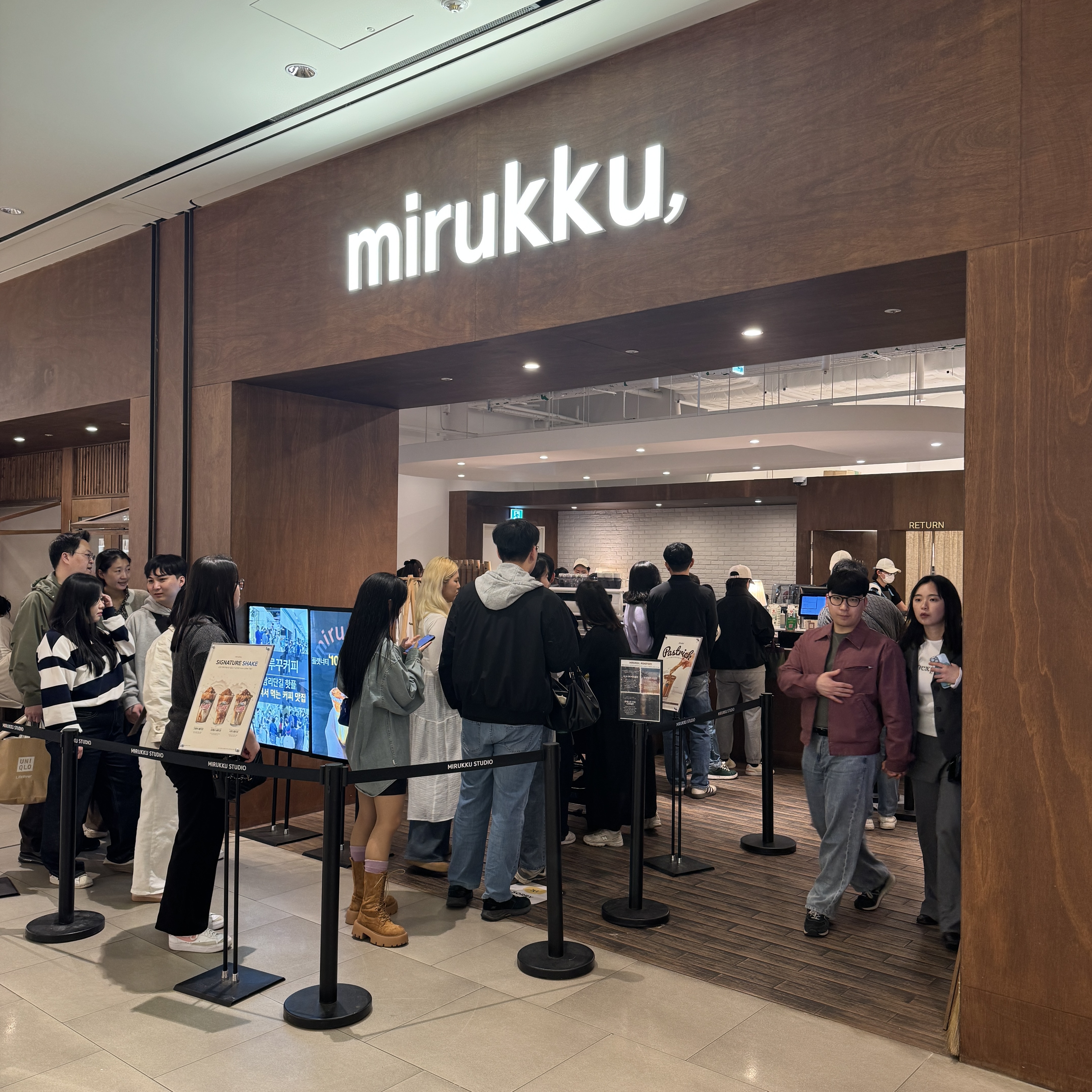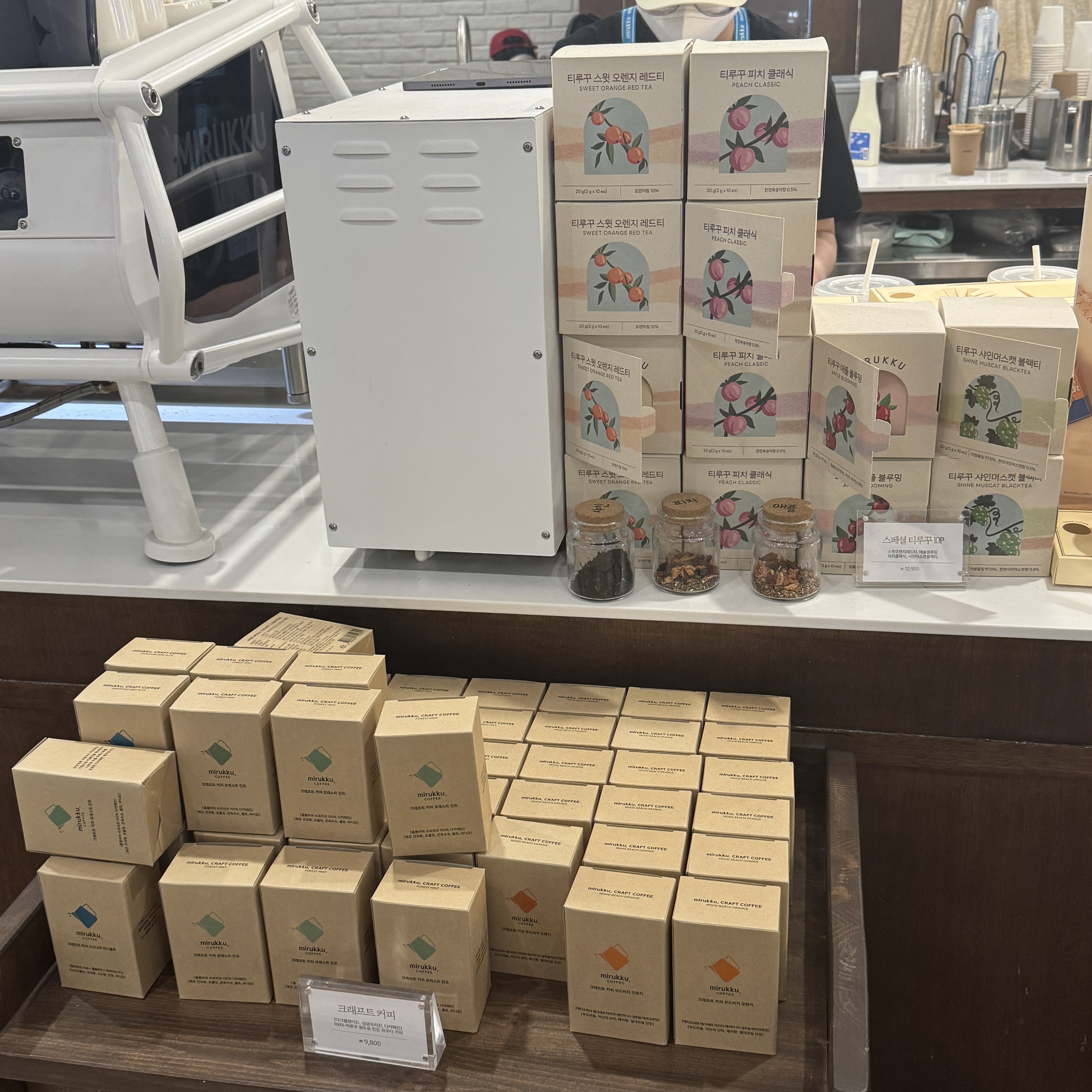카운터 옆에는 티와 커피도 팔더라. 이거 사가는 사람도 있을라나 싶은데, 미루꾸 커피 로고가 스팀 피처(우유 데울 때 사용하는 기구)다. 게다가 블루 보틀 따라한 색상이 눈에 띈다. 판매하는 커피 포장지에는 다양한 색으로 되어 있긴 하지만.