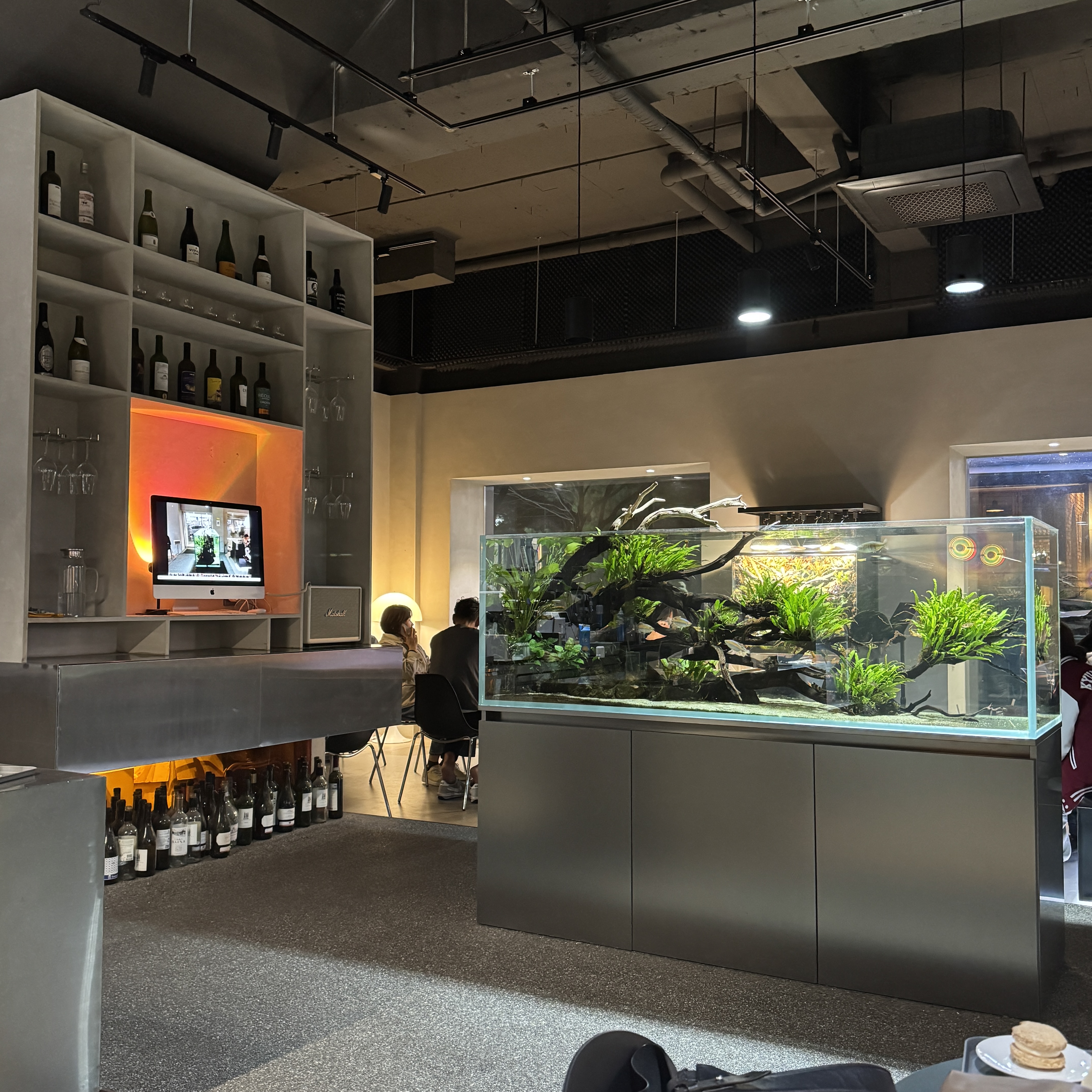 여기 중앙에 수족관이 있다. 이거 관리하기 쉽지 않을 듯 하던데. 게다가 이 자리에 테이블 놓으면 2-3개는 놓을 수 있는데 여기다 이렇게 수족관을 갖다 뒀어. 저쪽에는 또 파충류도 키우더라고. 동네의 그리 크지 않은 작은 카페지만 사람은 꽉 차 있더라. 여기서 공부하는 애들도 있고 말이지.