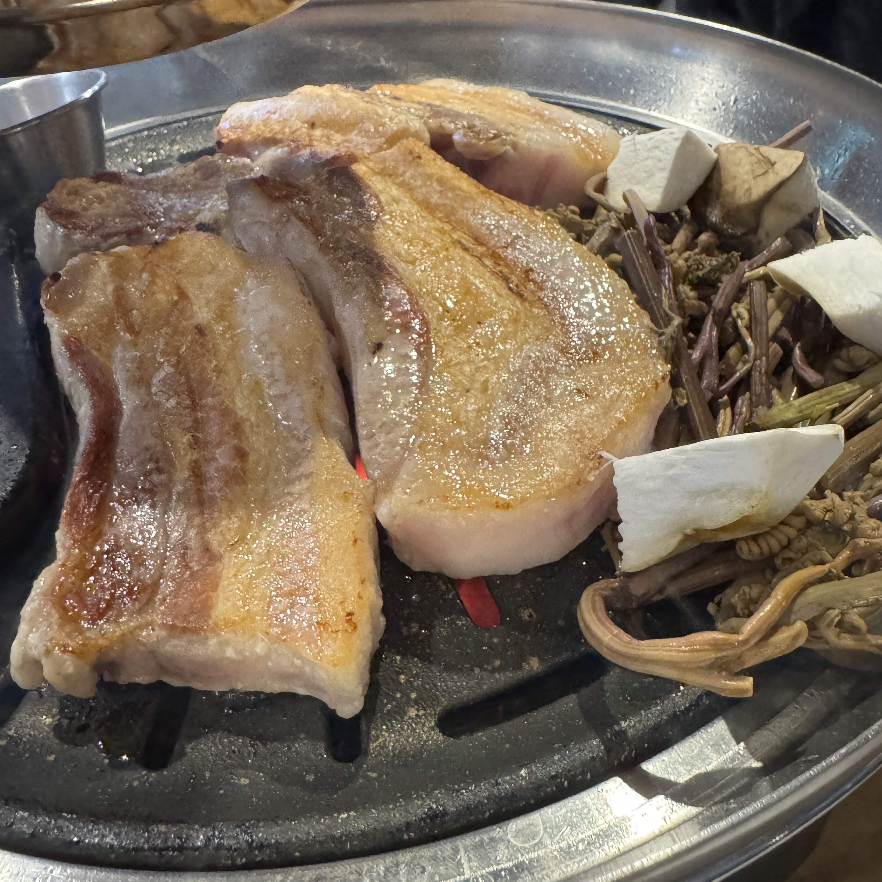 일단 국민 음식 생삼겹이다. 숙성 생삼겹. 가격은 150g에 16,000원. 고기는 사장님이 직접 구워주시더라. 고기 괜찮더라.