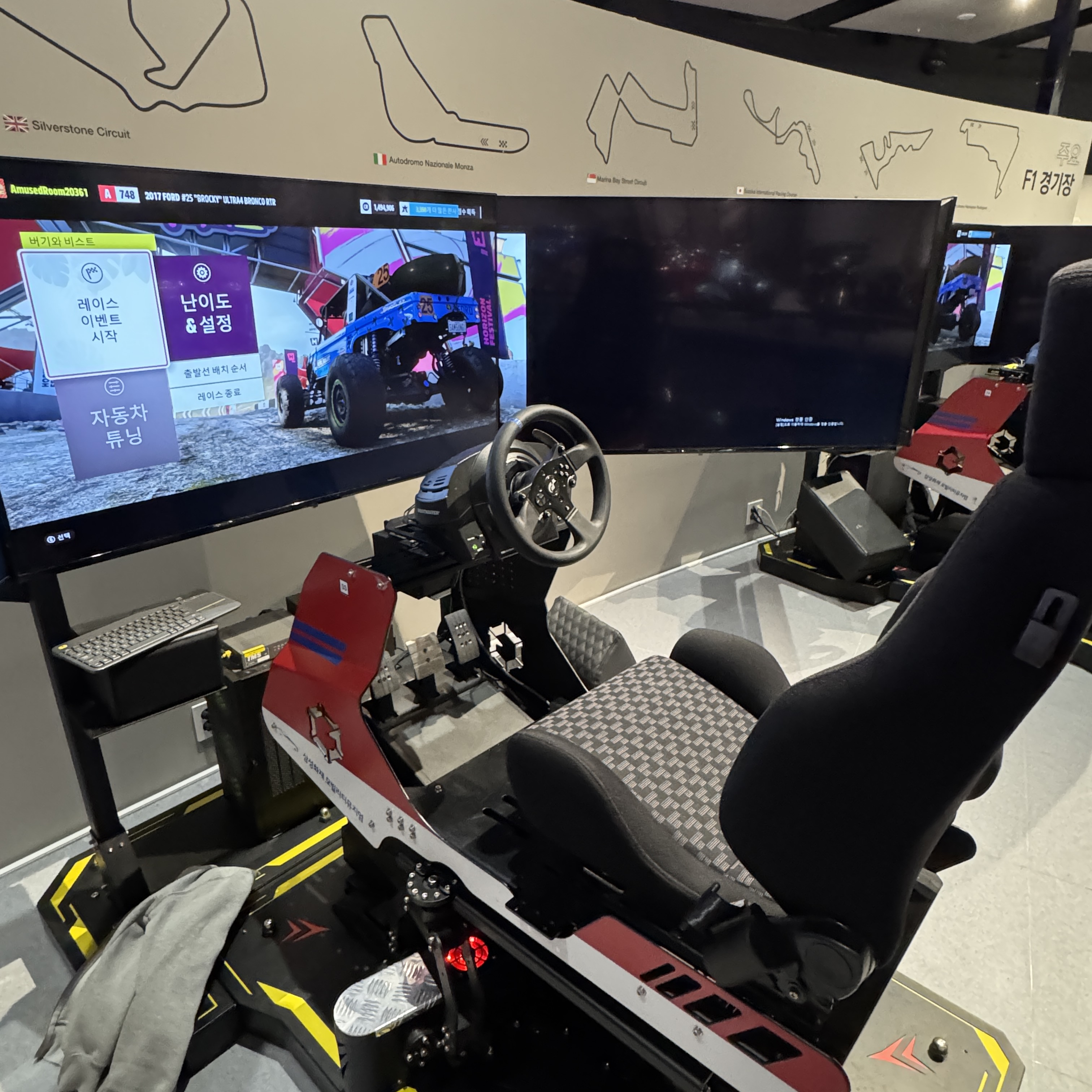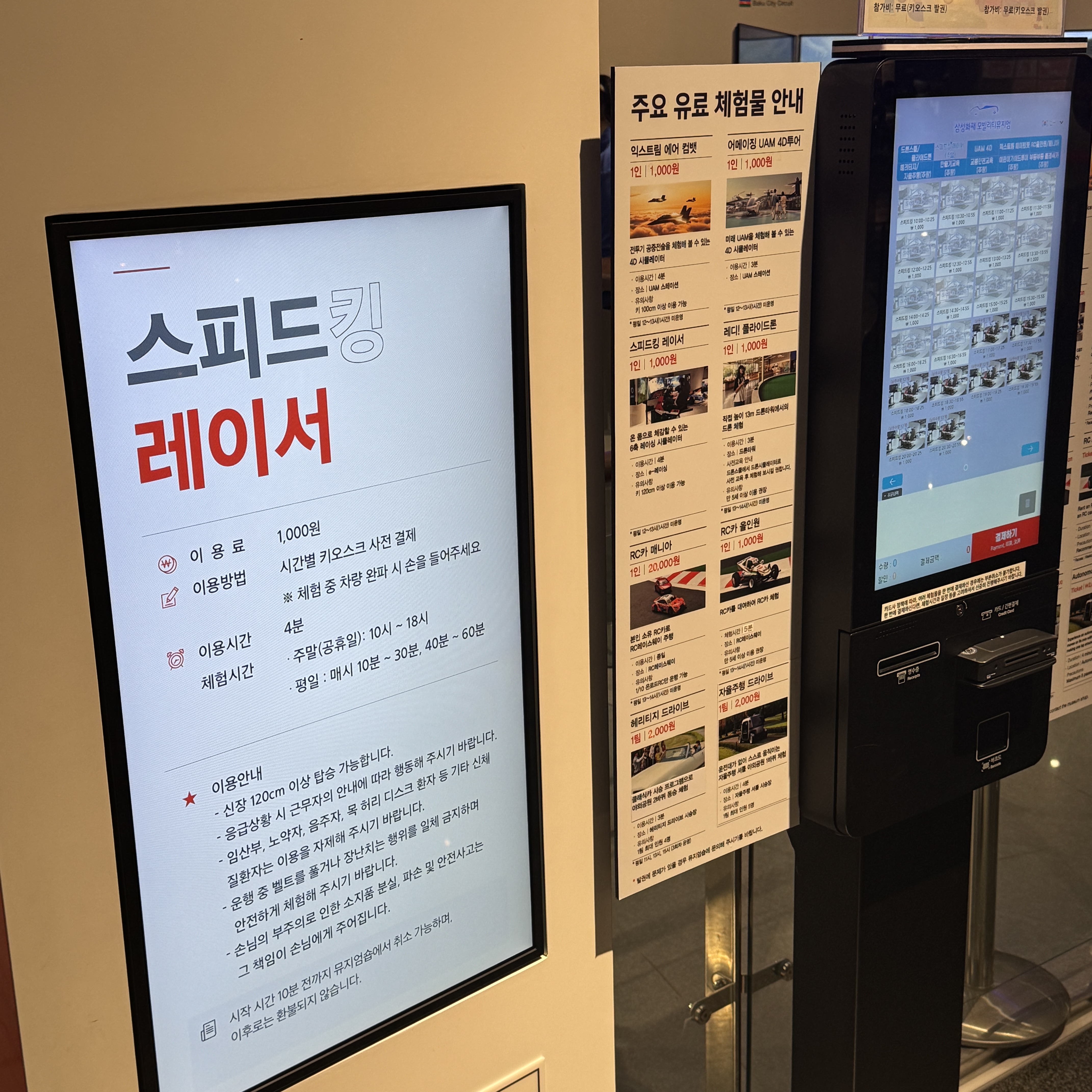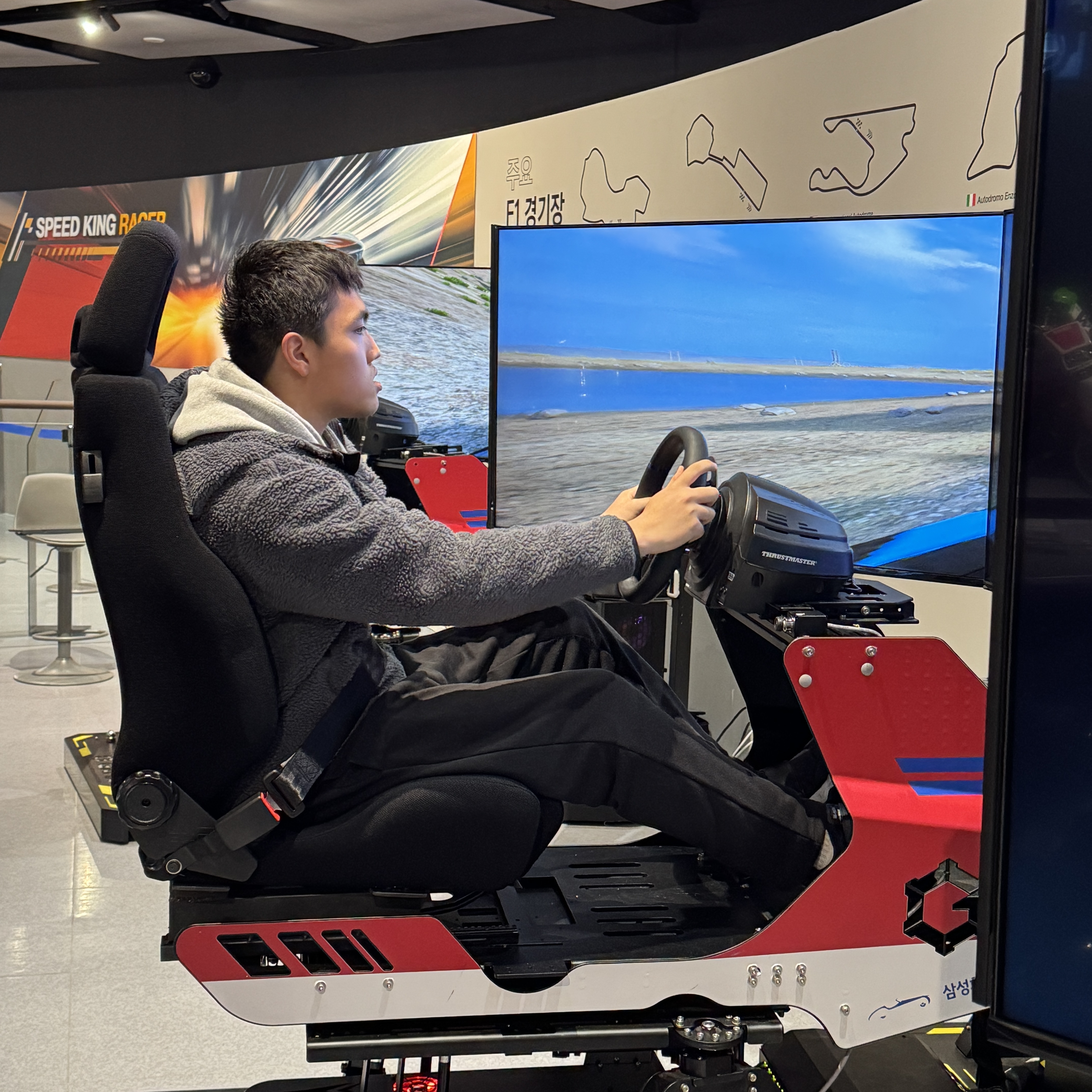 그리고 시간 돼서 예약해둔 스피드킹 레이서 체험하러 갔다. 플레이스테이션 게임인 거 같던데 레이싱 의자와 모니터 3개로 구성되어 있어 재밌더라. 원래 어린애들만 이용하는 거 같아서 아들만 해줬는데, 자리가 남으니 어른이 해도 된다고 해서 나도 같이 했었네. 가격은 1,000원. 근데 시간이 넘 짧아.