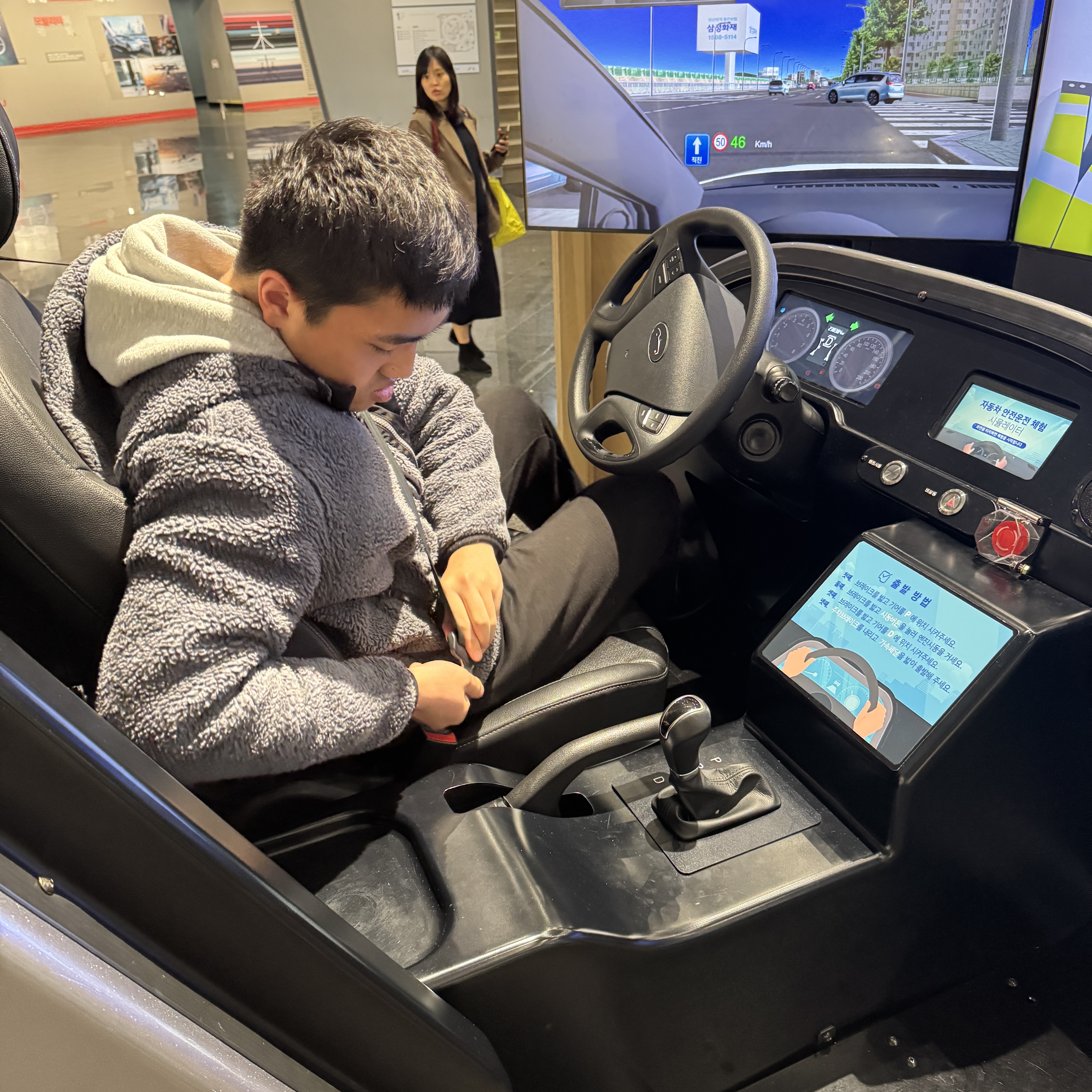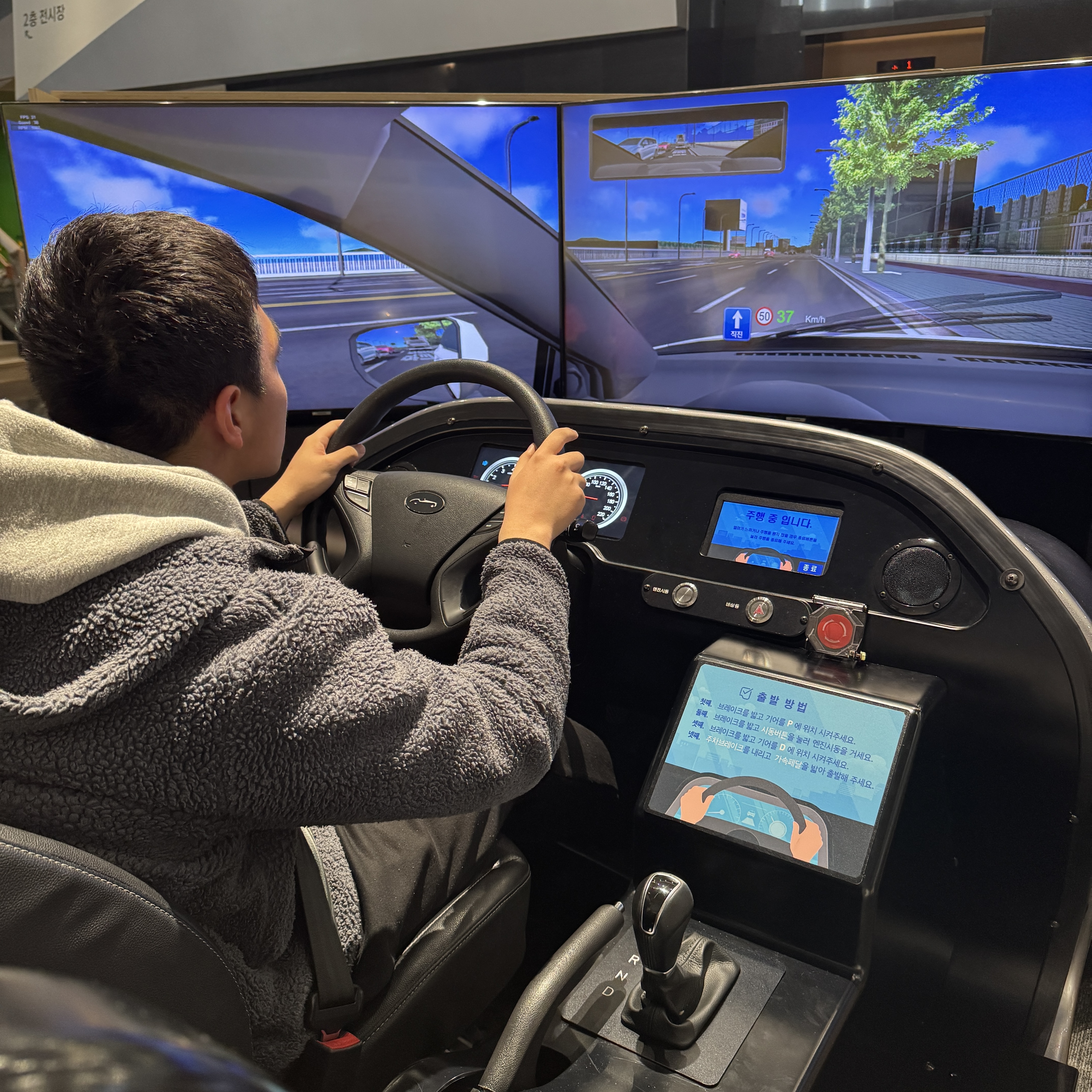 이건 주행 시뮬레이션하는 거다. 실제 자동차와 똑같이 구성해서 안전 교육하는 목적으로 만들어진. 게임이랑은 달라. 안전하게 신호 지키면서 하면 오래 할 수 있을까 싶긴 한데, 아들은 그리 오래 하지 못하고 충돌로 인해 아웃.