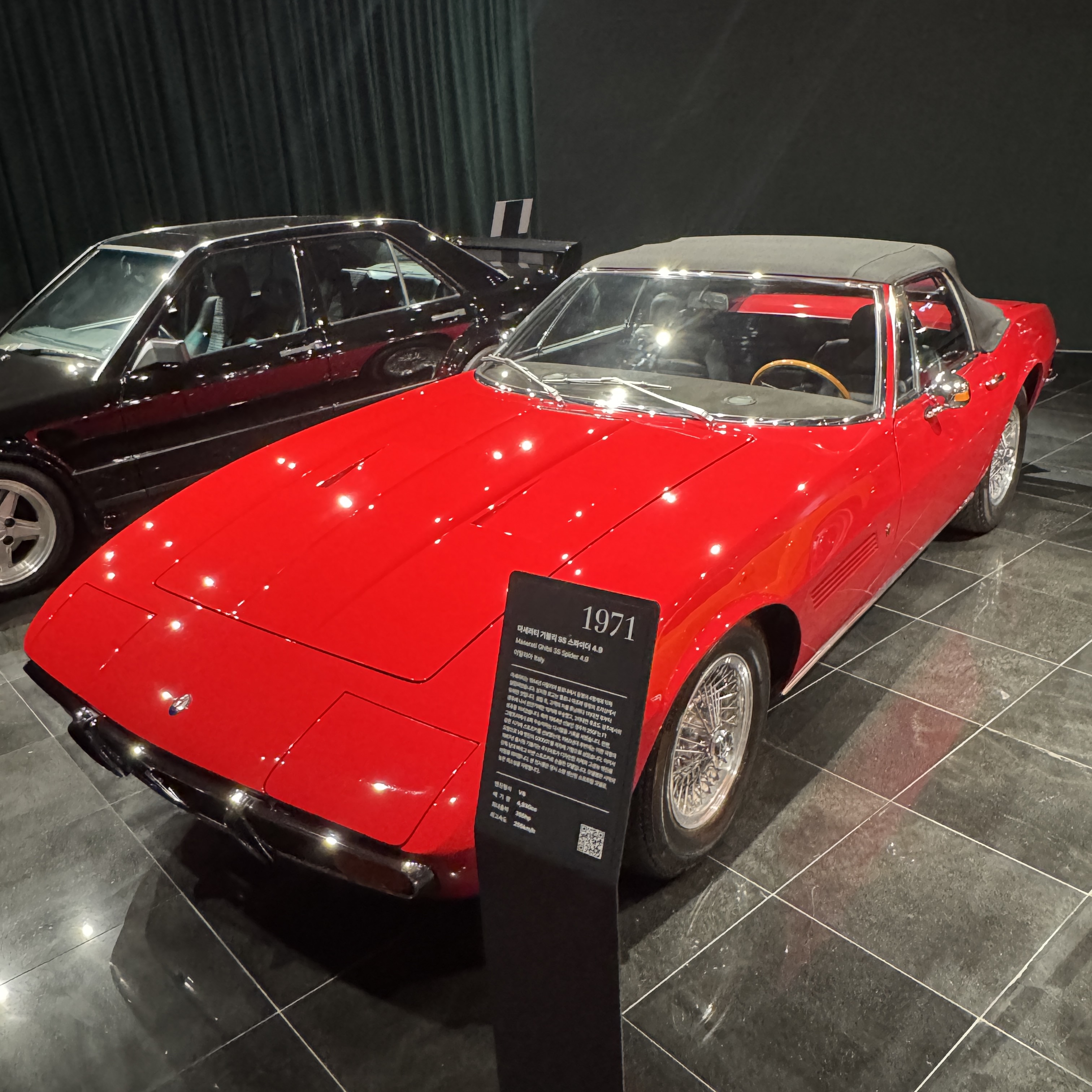 이건 좀 놀랐던 모델인데, 왼쪽의 빨간 스포츠카같은 모델이 마세라티 기블리란다. 설명을 읽어보니 마세라티가 예전엔 명성이 자자했네. 지금의 AMG 같은 느낌? 1971년 모델인데, 소프트탑에 리트랙터블 라이트(라이트가 열렸다 닫혔다 하는)다. 지금 봐도 좀 옛날 차라는 느낌은 들지만 몇몇 부분들이 눈에 띄는데, 1970년대 당시에는 얼마나 파격적이었을까.