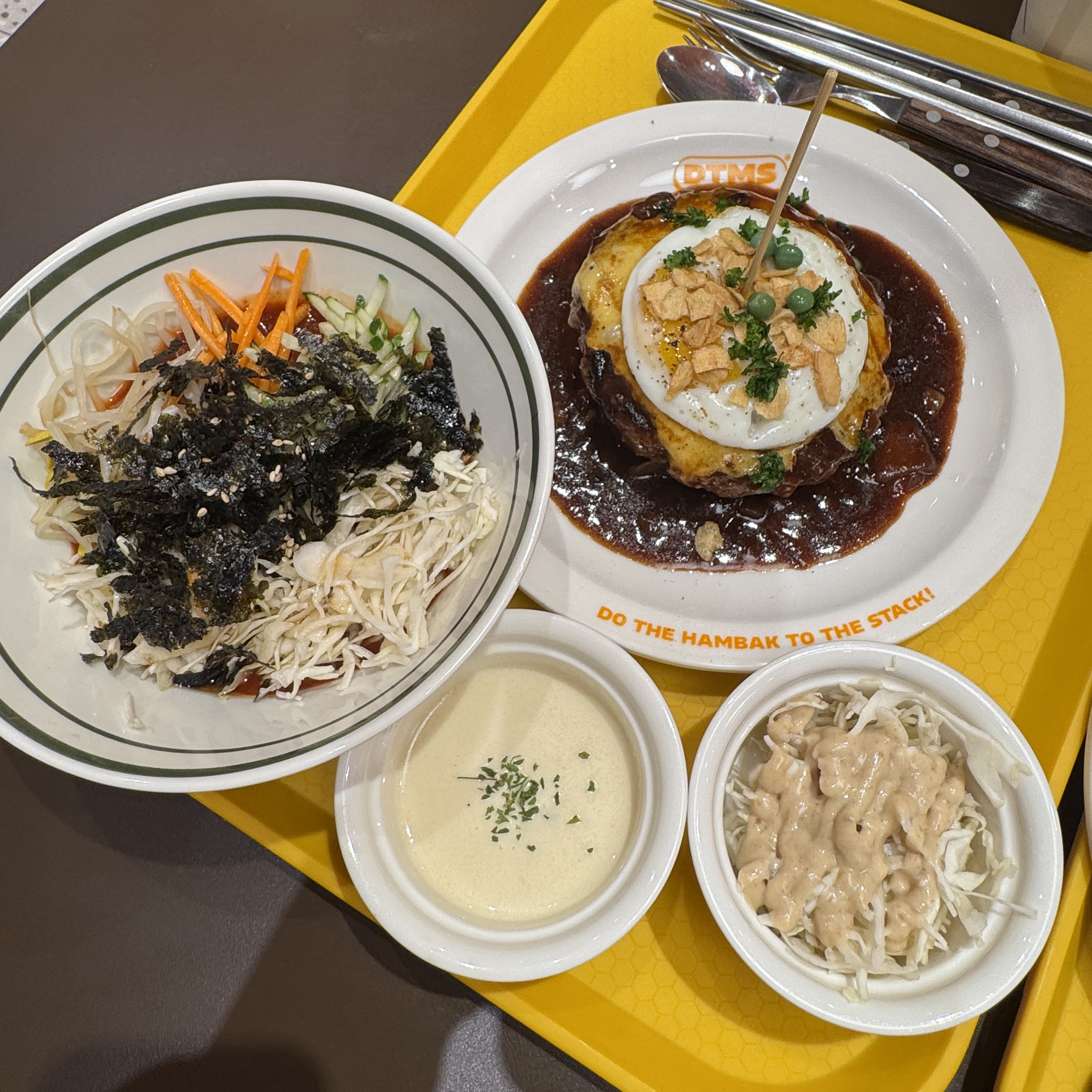 단품으로 고르려다가 2인 세트 주문했다. 35,000원. 함박 스테이크, 함박 카츠, 쫄면 그리고 탄산음료 2개. 양배추 샐러드와 콘 그리고 스프는 기본적으로 나온다. 얘기하면 피클도 별도로 주더라. 솔직히 먹고 나니 쫄면이 제일 맛나더라. ㅎ 여기 함박 전문점 아님? 아들한테 물어보니 그리 맛있다고 할 수도 없고 양이 적다고. 나도 먹고 나서 배부르지가 않더라. 조금 먹은 듯 안 먹은 듯? 허기 채울 정도? 그래서 나는 비추.