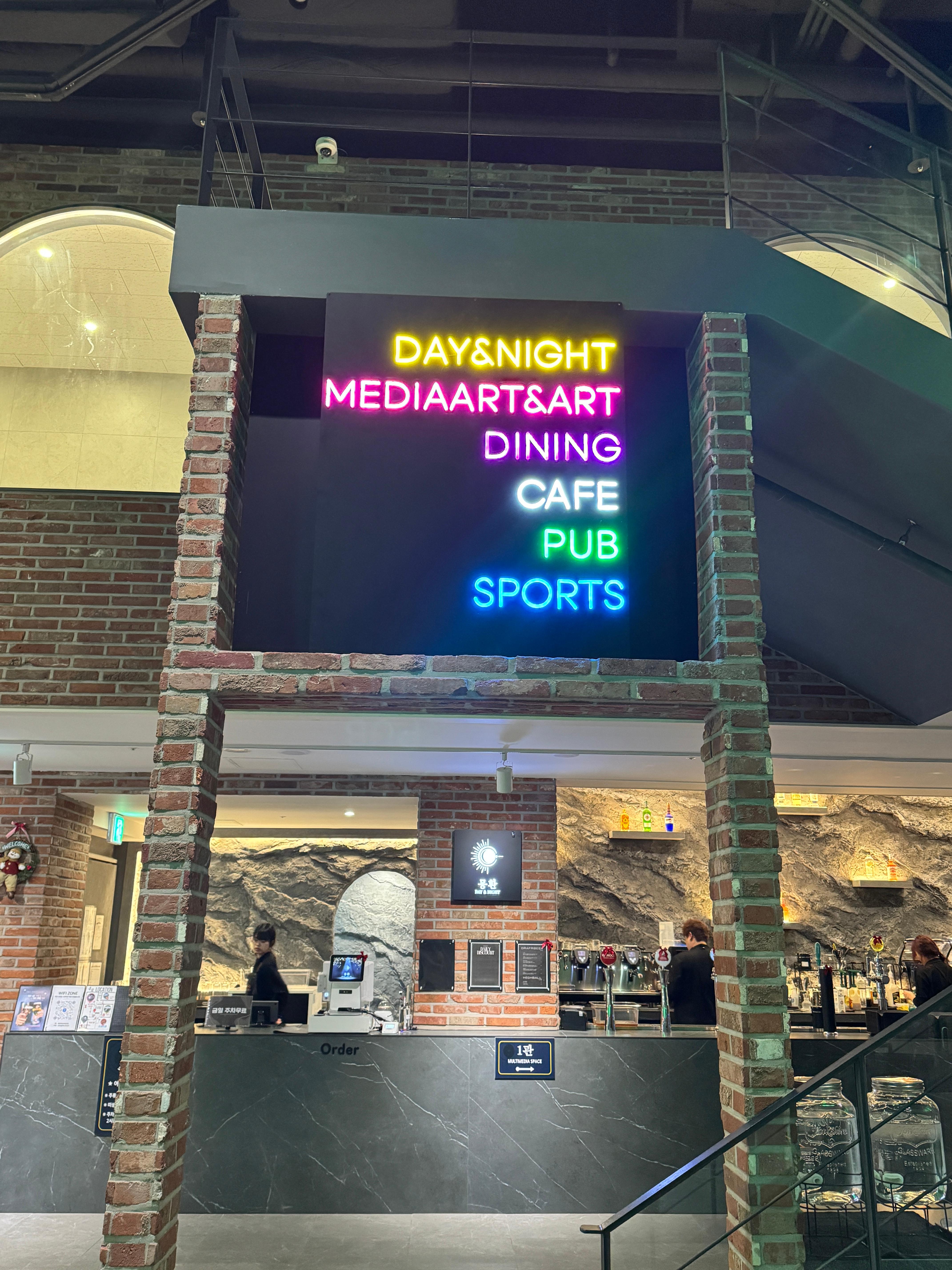 여기 특징은 미디어 아트 카페라고, 요즈음 전시도 미디어 전시 있잖아?