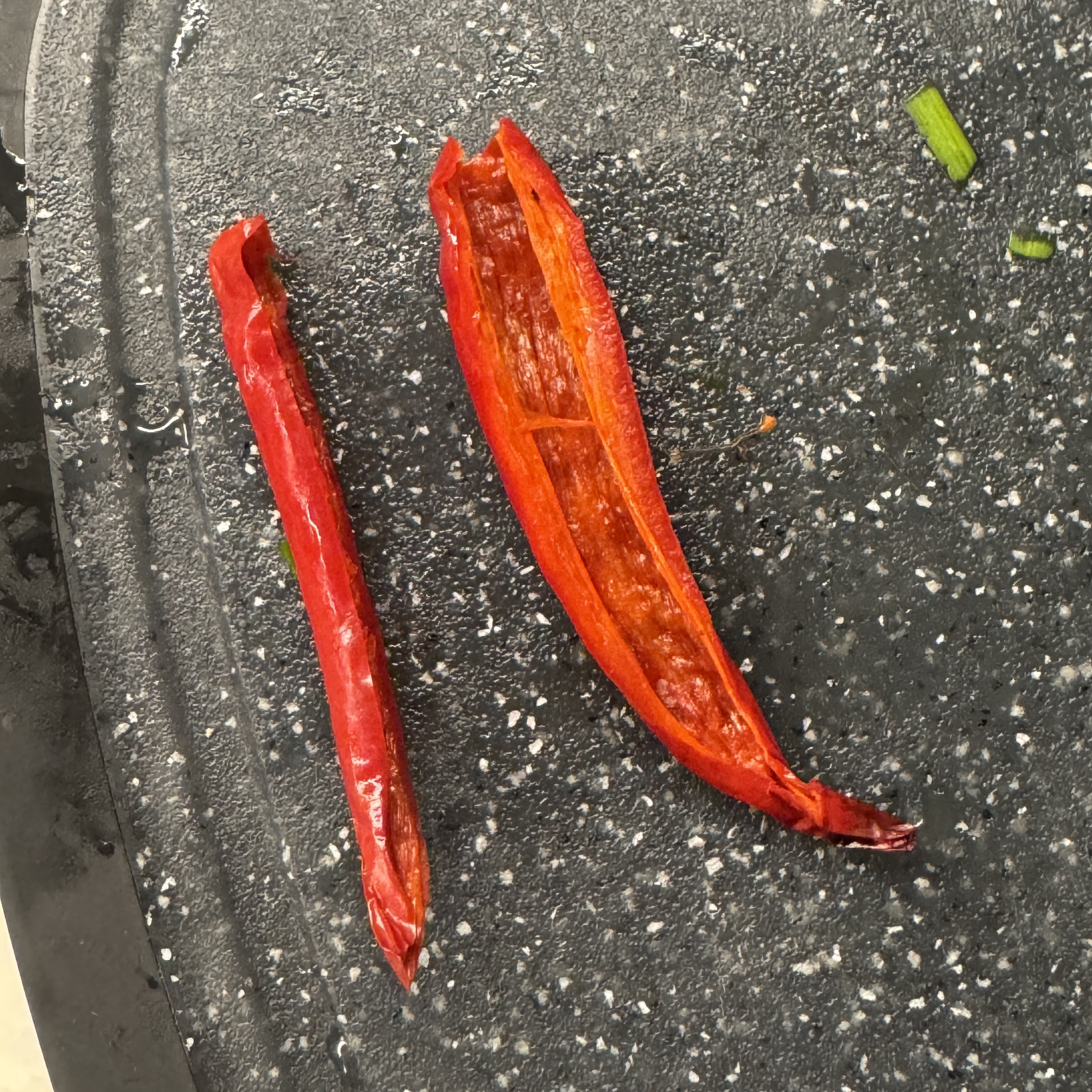 참기름 두르고, 부추랑 홍고추 썰어둔 거 넣고 볶는다.
