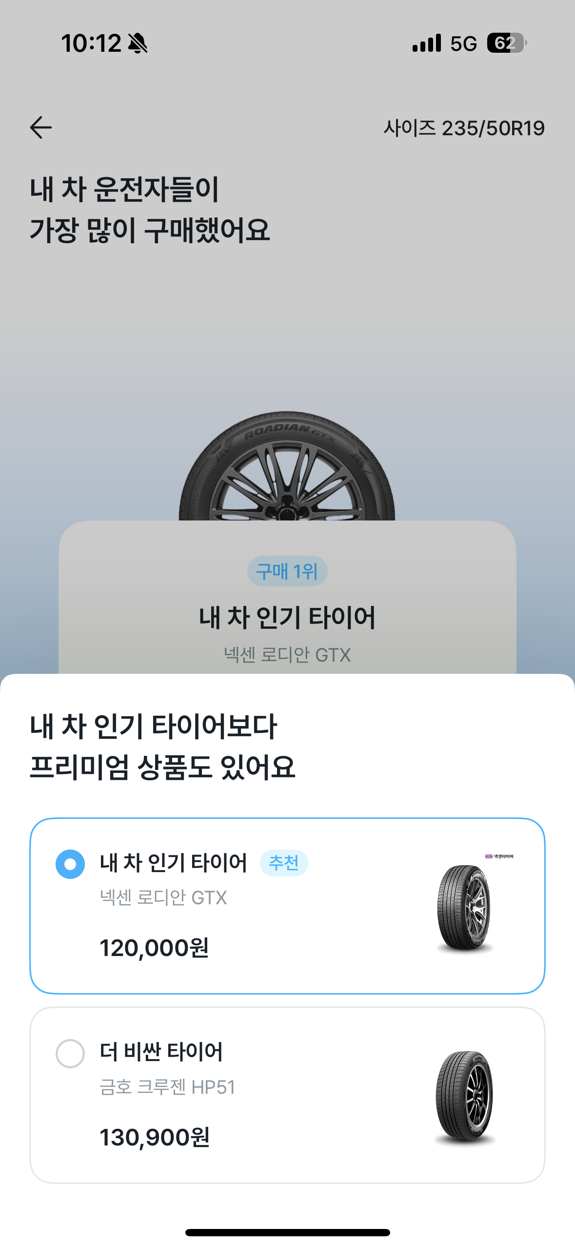 나랑 똑같은 차량 타고 다니는 사람들이 많이 산 타이어가 나오네.